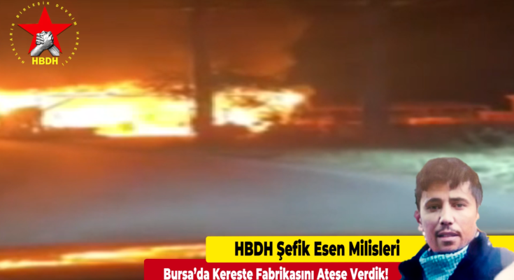 HABER MERKEZİ- HBDH, kendi online sitesinden yayınladığı yazılı bir açıklama ile hapishanelerde süren işkence koşulları ve Önder APO üzerinde devam eden ağır tecride karşı 2 Temmuz günü, sabah 06:30 sularında, Bursa’nın Gemlik ilçesinde bulunan bir kereste fabrikasının HBDH Şefik Esen Milisleri tarafından ateşe verildiğini duyurdu.