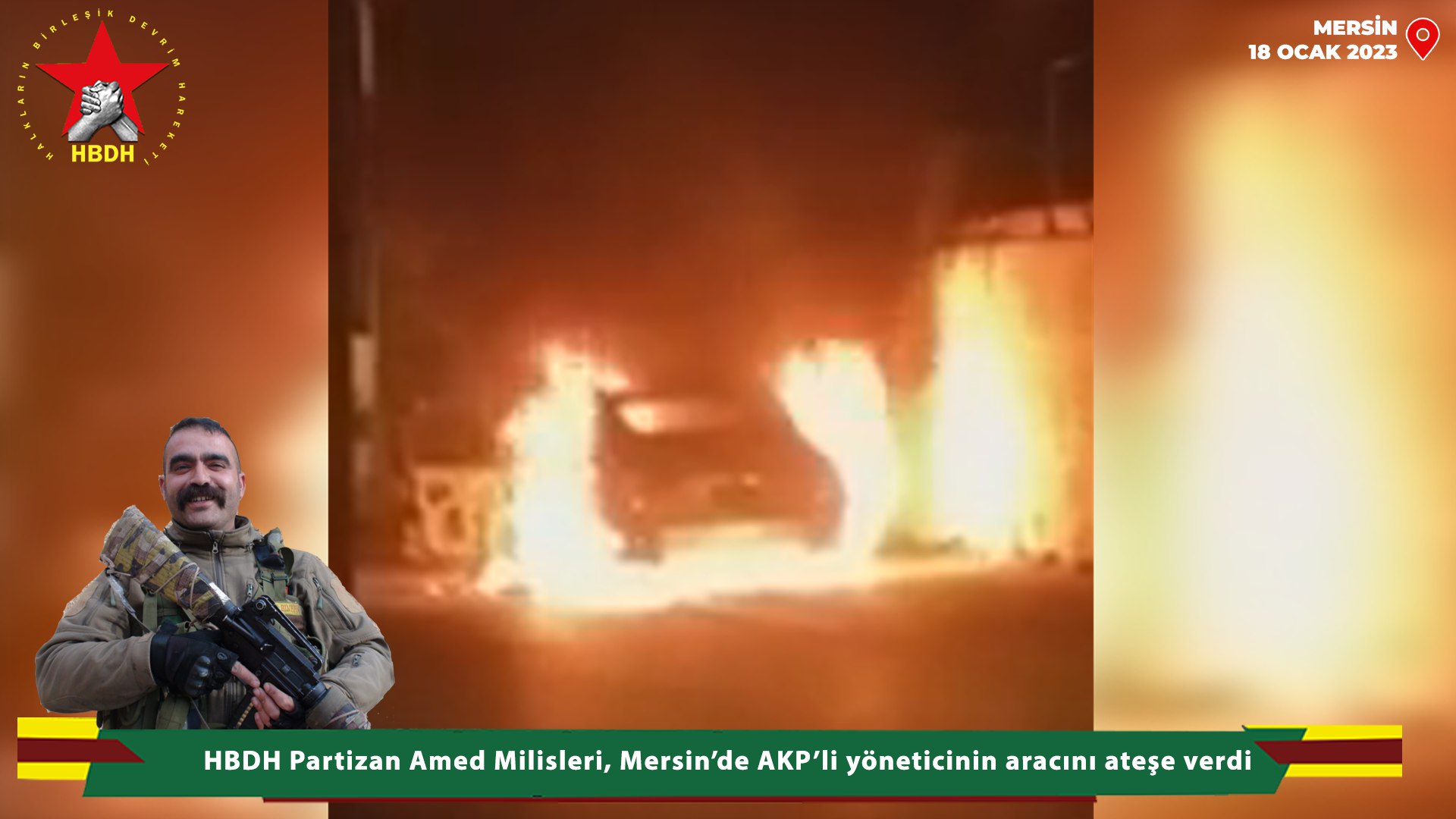 MERSIN – Halkların Birleşik Devrim Hareketi (HBDH) Partizan Amed Milisleri, 18 Ocak akşamı saat gece 01:00 sıralarında Mersin’de AKP’nin yöneticiliğini yapan Yılmaz S. isimli şahsın aracını ateşe verdiklerini belirtti.