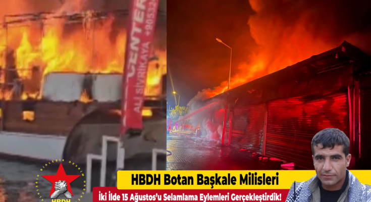 Yazılı bir açıklama yayınlayan HBDH, Botan Başkale Milisleri tarafından 14 Ağustos sabah 07:00 civarında Antalya’nın Kemer ilçesinde Süleyman Aydınışığa ait Hilal Ay isimli bir turist teknesi ateşe verildiğini, 14 Ağustos gece saat 02:00 civarında ise Aydının Efeler ilçesinde bulunan OSB de yağ-plastik ve tamir atölye ve fabrikaların sabotaj taktiği ile ateşe verildiğini duyurdu.