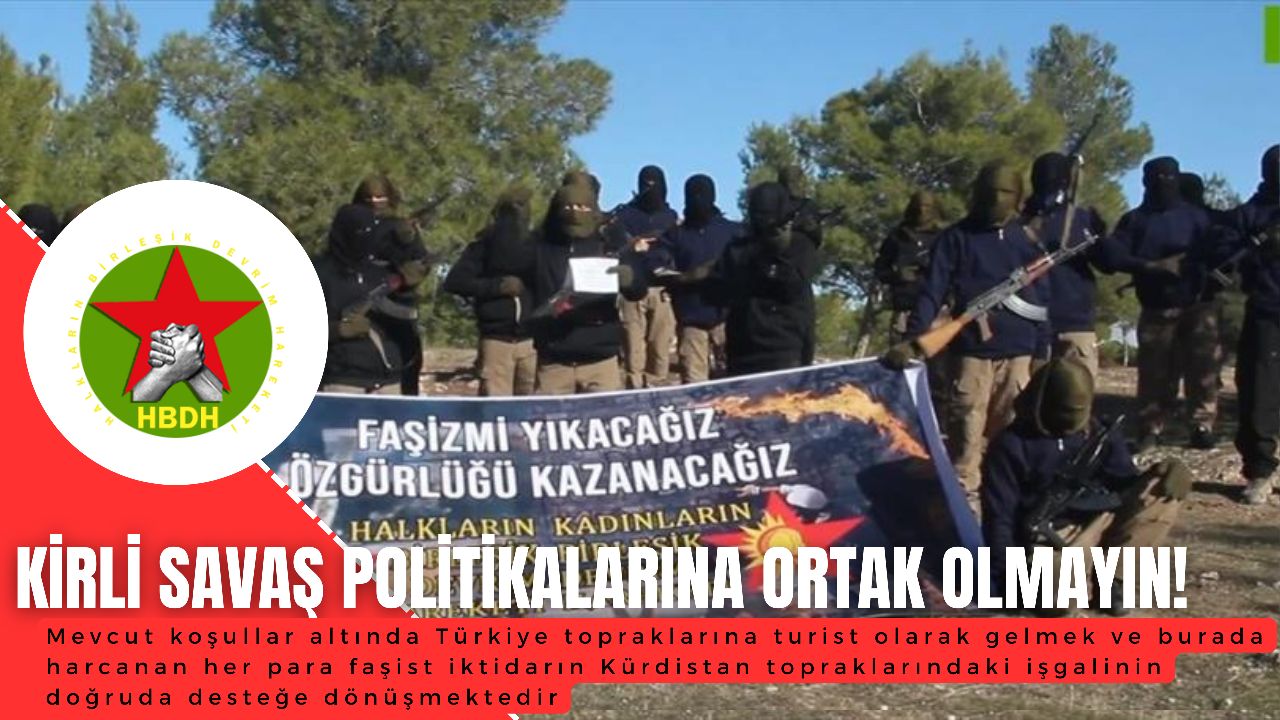 Türkiye ve dünya halklarına çağrımız, AKP-MHP iktidarının içinde bulunduğu ekonomik kriz içerisinde ona hiç bir şekilde destek olacak bir eylemin parçası olmamalarıdır. Yürütülen kirli savaşın boyutu ve faşist iktidarın baskıları düşünüldüğünde faşist iktidarın doğrudan finansal destek aldığı turizm sektöründe, Türkiye’ye turist olarak gitmemeleri ve bu şekilde kirli savaşa destek olmamalarıdır. Mevcut koşullar altında Türkiye topraklarına turist olarak gelmek ve burada harcanan her para faşist iktidarın Kurdistan topraklarındaki işgalinin doğruda desteğe dönüşmektedir.