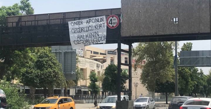 ADANA – HDP Adana Gençlik Meclisi Önder Apo üzerindeki tecride karşı üst geçide yazılı bir pankart astı.
