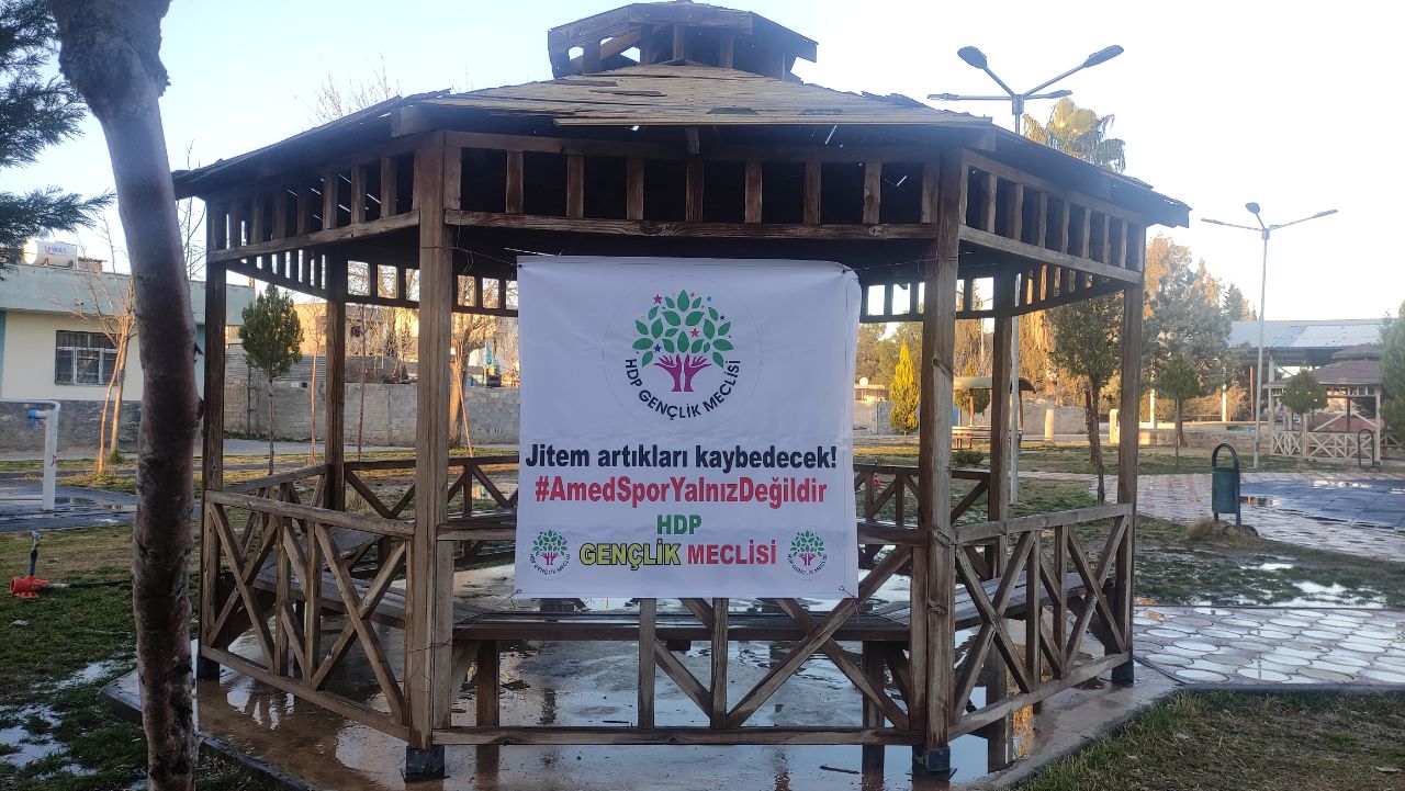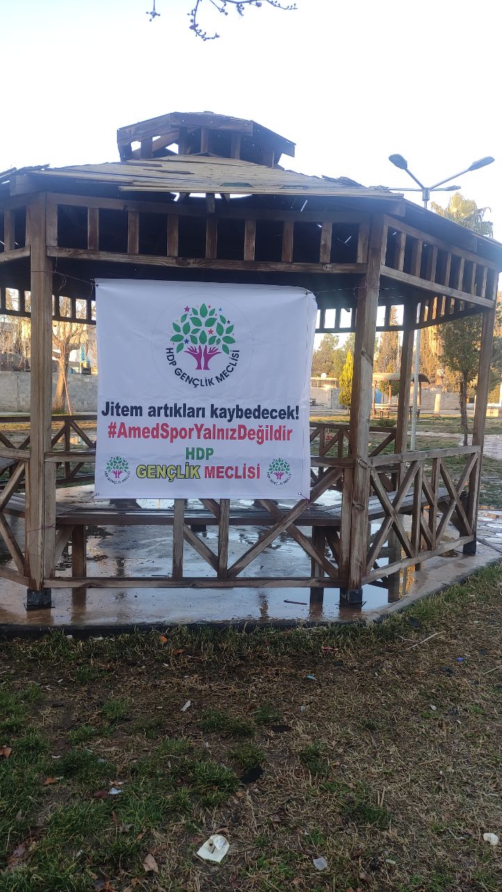 RIHA- Urfa HDP Gençlik Meclisi Bursaspor- Amedspor maçında, Bursaspor taraftarlarının faşist ve ırkçı saldırılarına karşı Ceylanpınar Musa Anter Parkı’nda pankart açtı.
