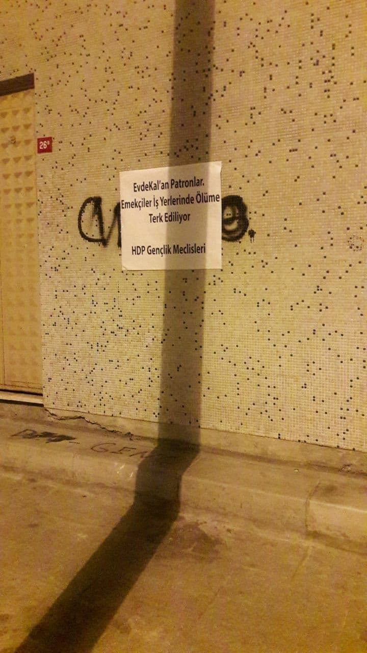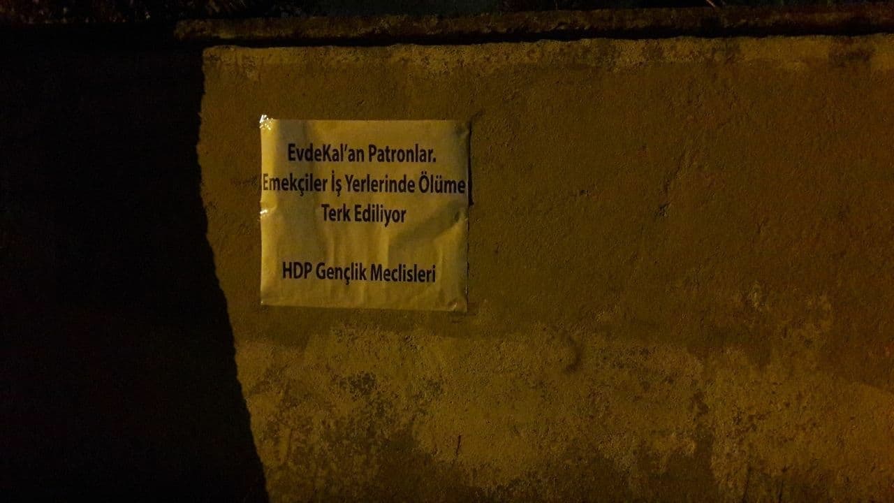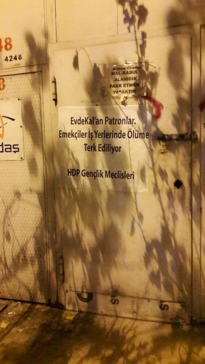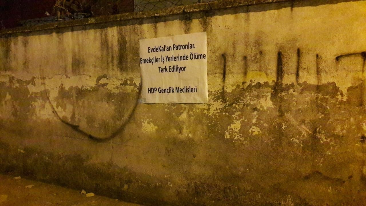 Öte yandan HDP Gençlik Meclisleri İstanbul Sultanbeyli’de Pandemi nedeniyle işleri ve Koronavirüs arasında sıkışan emekçiler için “EvdeKal’an Patronlar, Emekçiler İş Yerlerinde ölüme Terk Ediliyor” pankartı astı. HDP Gençlik Meclisi hem çalışmak zorunda olan hem de Koronavirüsten korunması gerekip aynı zamanda kalabalık ve sağlıksız ortamlara maruz bırakılan işçilere dikkat çekmek için pankart çalışması yaparak ‘ EvdeKal’an Patronları’ kınadı.