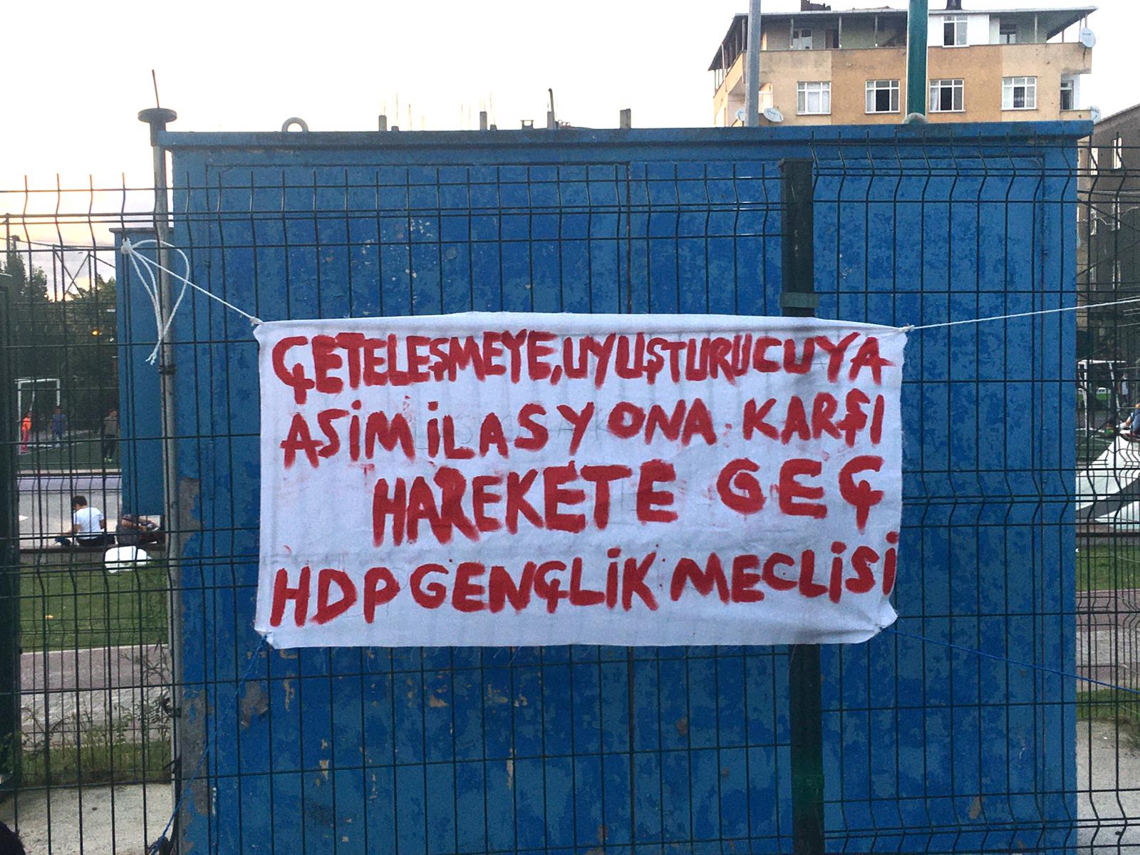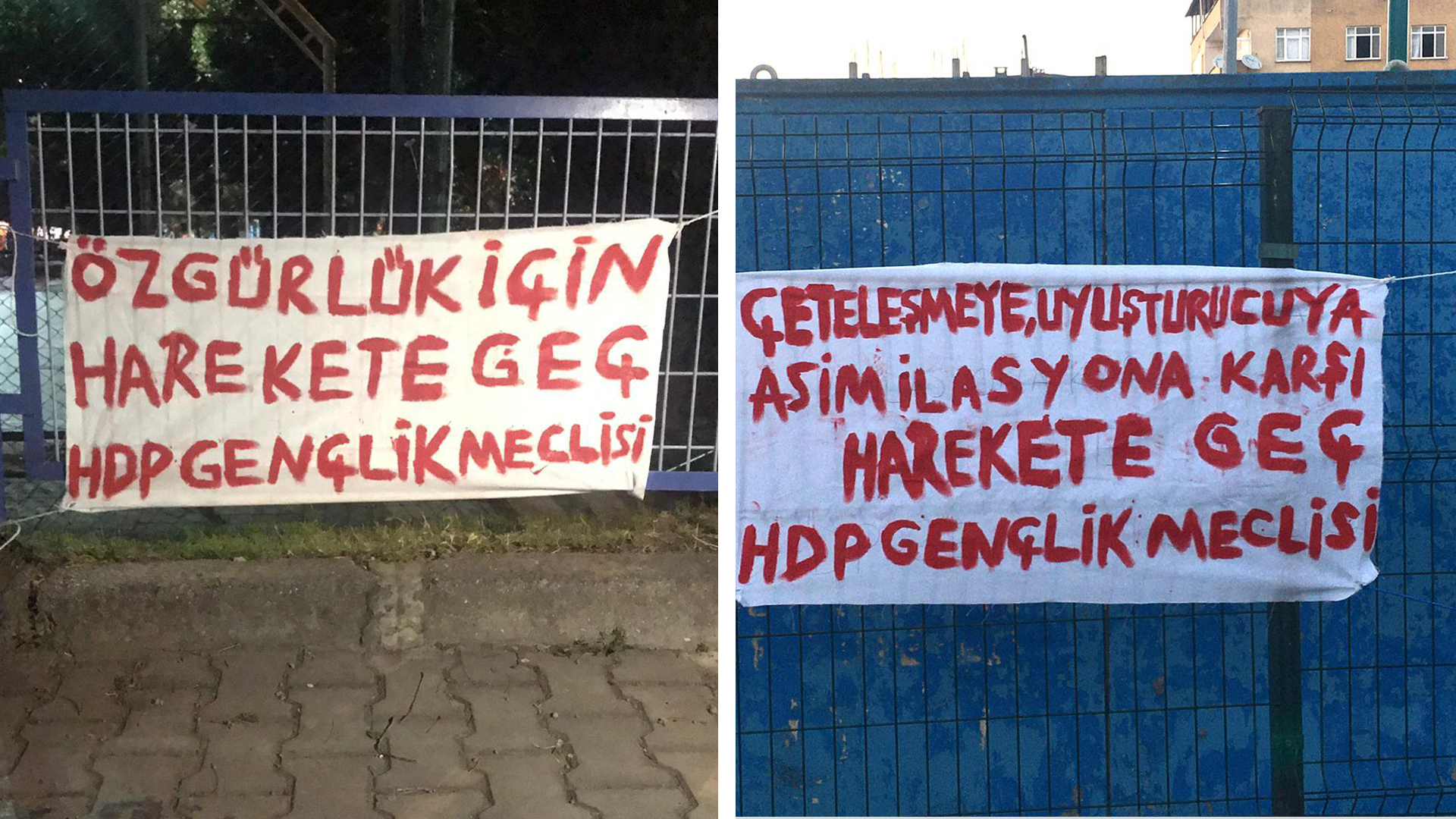Sultangazi ilçesinde yapılan eylemlerde HDP’li gençler “Özgürlük İçin Harekete Geç” ve “Çeteleşmeye, Uyuşturucuya, Asimilasyona karşı Harekete Geç” yazılı pankartlar astı.