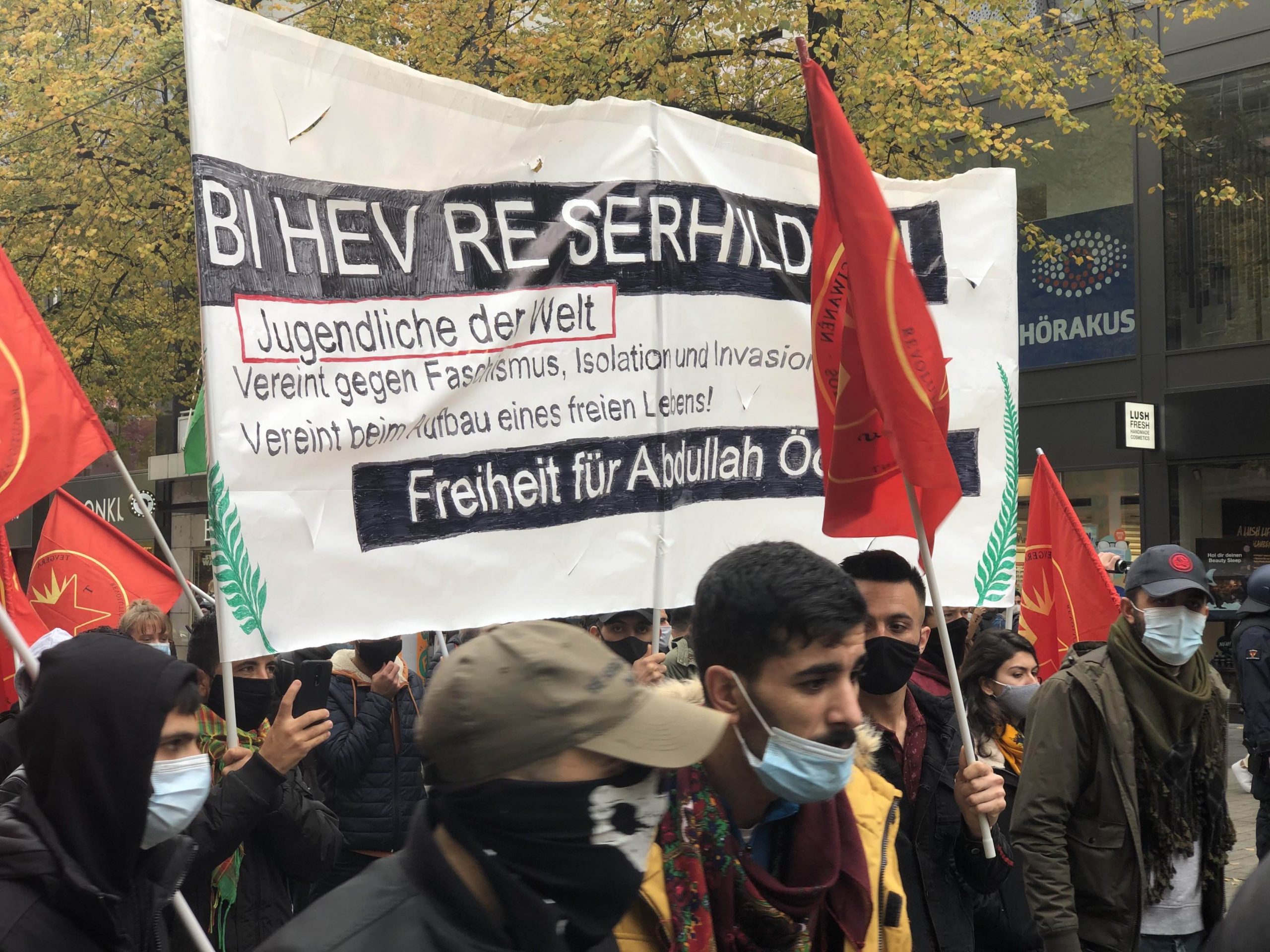 Sık sık PKK yasağına karşı sloganlar ve faşizme karşı “Bi Hev Re Serhildan” sloganlarının atıldığı eyleme YXK, JXK ve çok sayıda Alman antifaşist genç de katıldı.