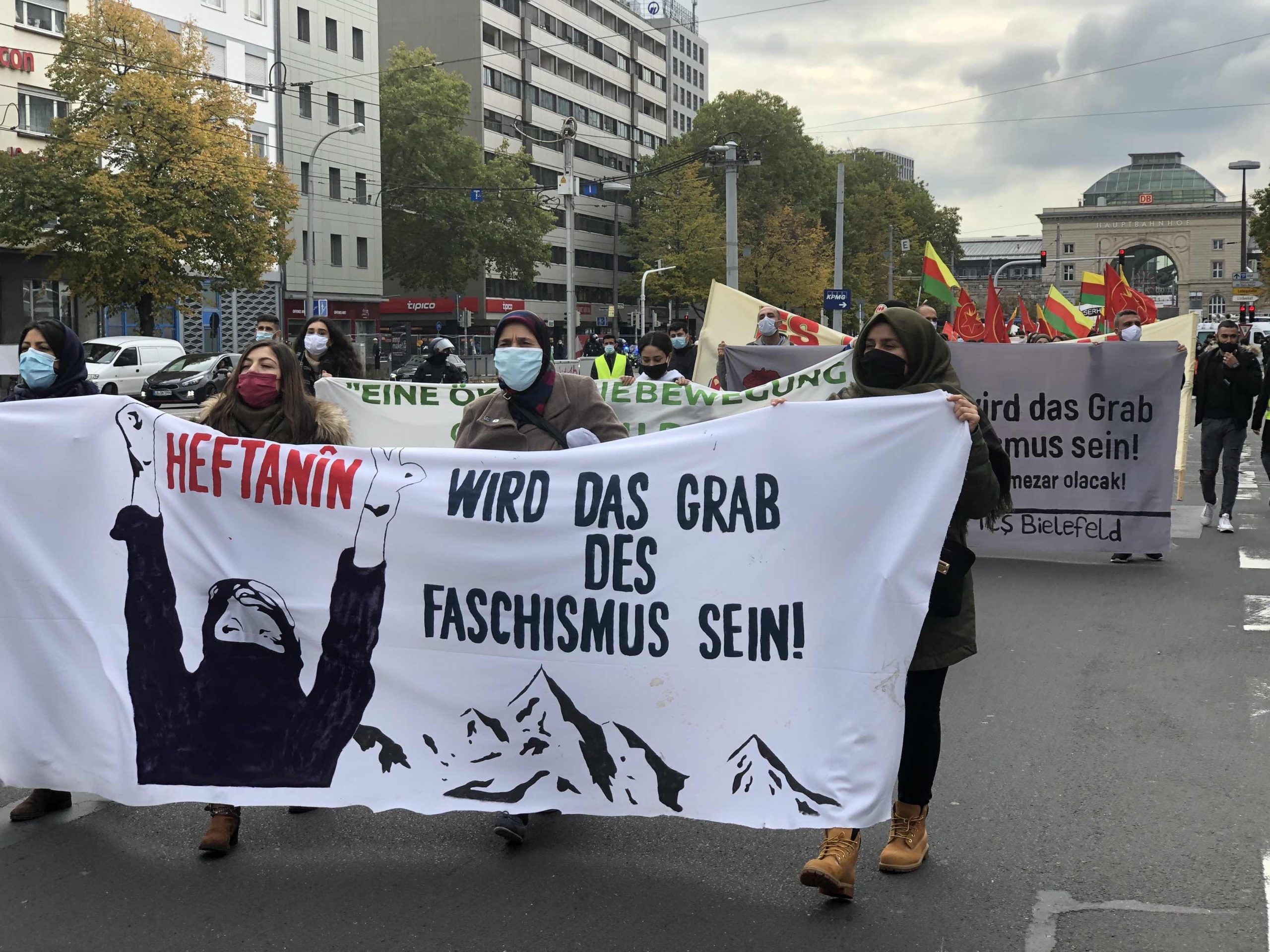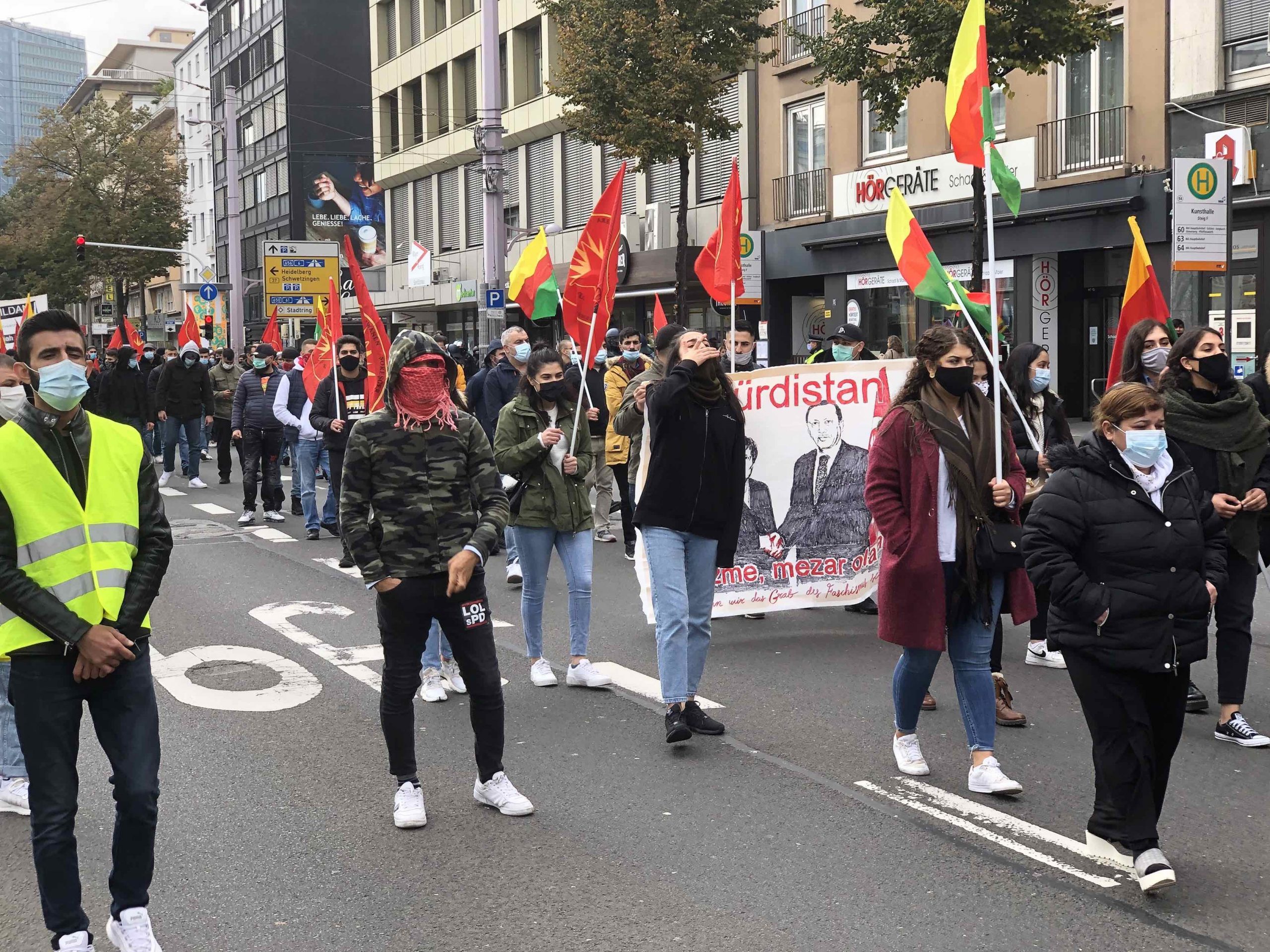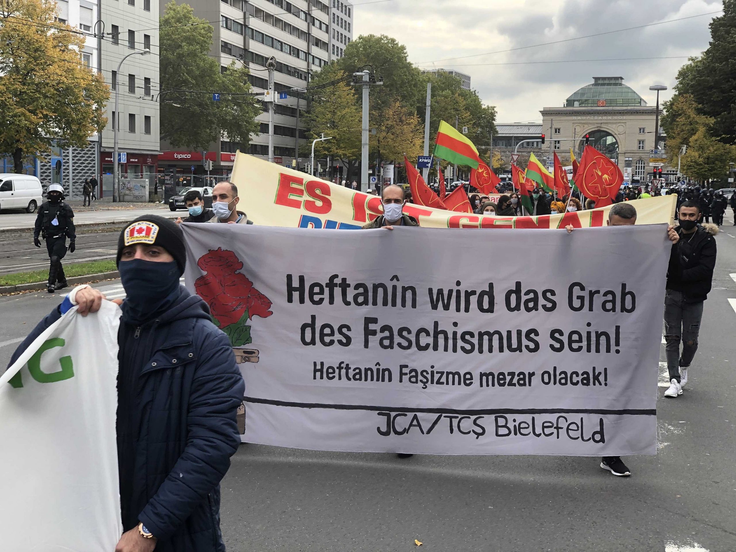 TCŞ, YPG ve TEVDEM bayraklarının açıldığı yürüyüşte gençler attıkları sloganlar ve hazırladıkları pankartlar ile Alman devletinin savaş suçu işleyen Türk devletiyle yaptığı işbirliğini teşhir etti.