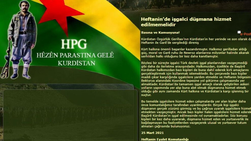 Bu temelde işgalcilere hizmet eden çalışmalarda yer alan kişiler daha önce komuntanlığımız tarafından uyarılmışlardır. Birçok kişi işgalci düşmanın gerçek yüzünü görmüş ve bu çağrıya uyarak işgalcilere hizmet etmekten vazgeçmiştir. Ancak bazı kişiler halen işgalcilere hizmet ederek Başûrê Kurdistan’ın işgal edilmesinde rol oynamaktadırlar. Söz konusu kişileri bir kez daha uyararak, düşmana hizmet eden ve yurtseverlik ile bağdaşmayan bu faaliyetlerden vazgeçerek ulusal ve yurtsever tutum almaları çağrısında bulunuyoruz.”