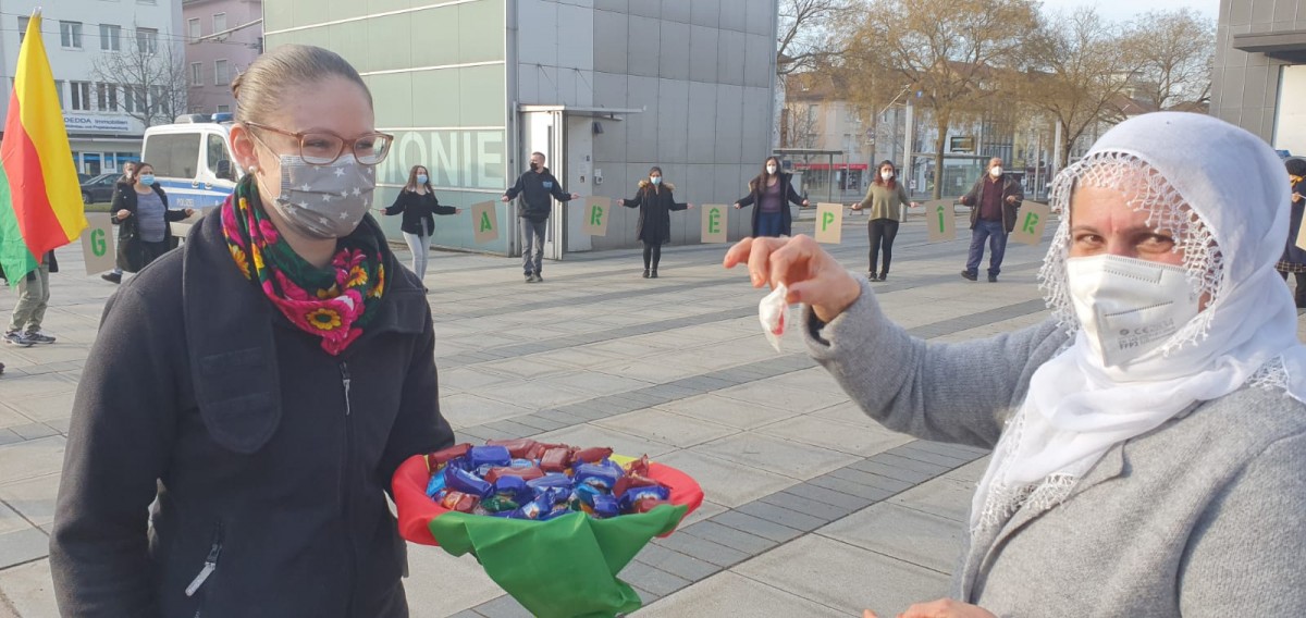 “Cenga Garê Pîroz Be” yazılı kartlar ile bir halay oluşturuldu. Yaratıcı eyleme halkın yoğun ilgisi oldu.