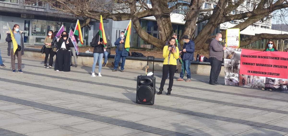 Efrîn’deki işgalin uluslararası hukuka aykırı olduğunu ancak Almanya’nın bu savaştan kârı olduğunu ve BRD’nin kârından başka bir şey düşünmediğinden insanların öldüğüne değinildi.