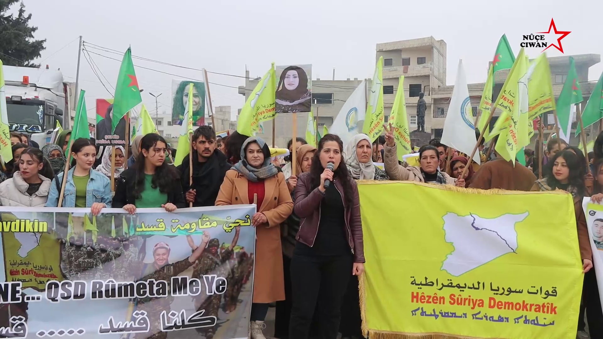 HABER MERKEZİ- Fırat Kantonu’nun Kobanê kent merkezinde bulunan Özgür Kadın Meydanı’nda bir araya gelen binlerce kişi, Demokratik Suriye Güçleri’ne (QSD) destek amacıyla geniş katılımlı bir yürüyüş gerçekleştirdi.