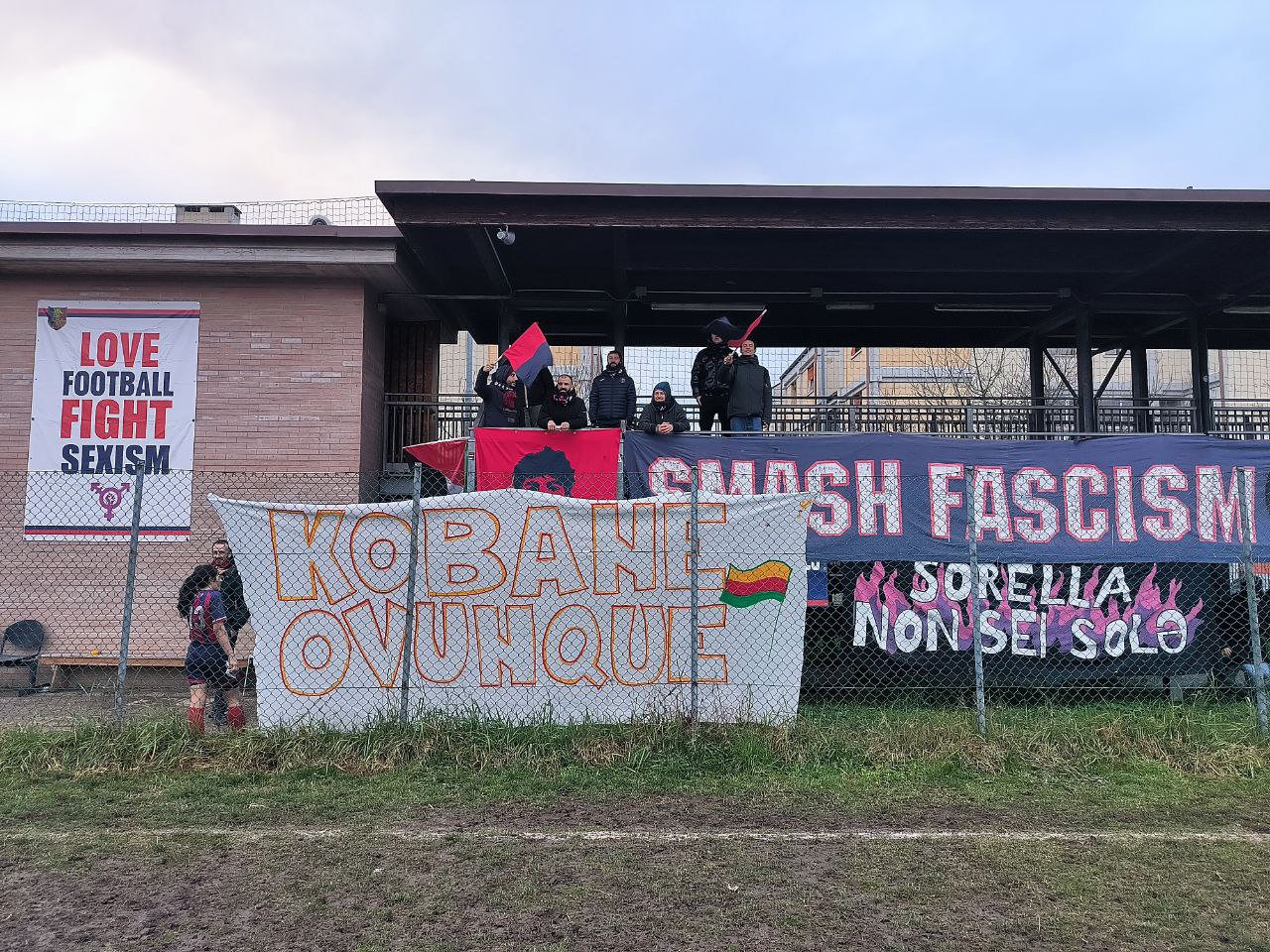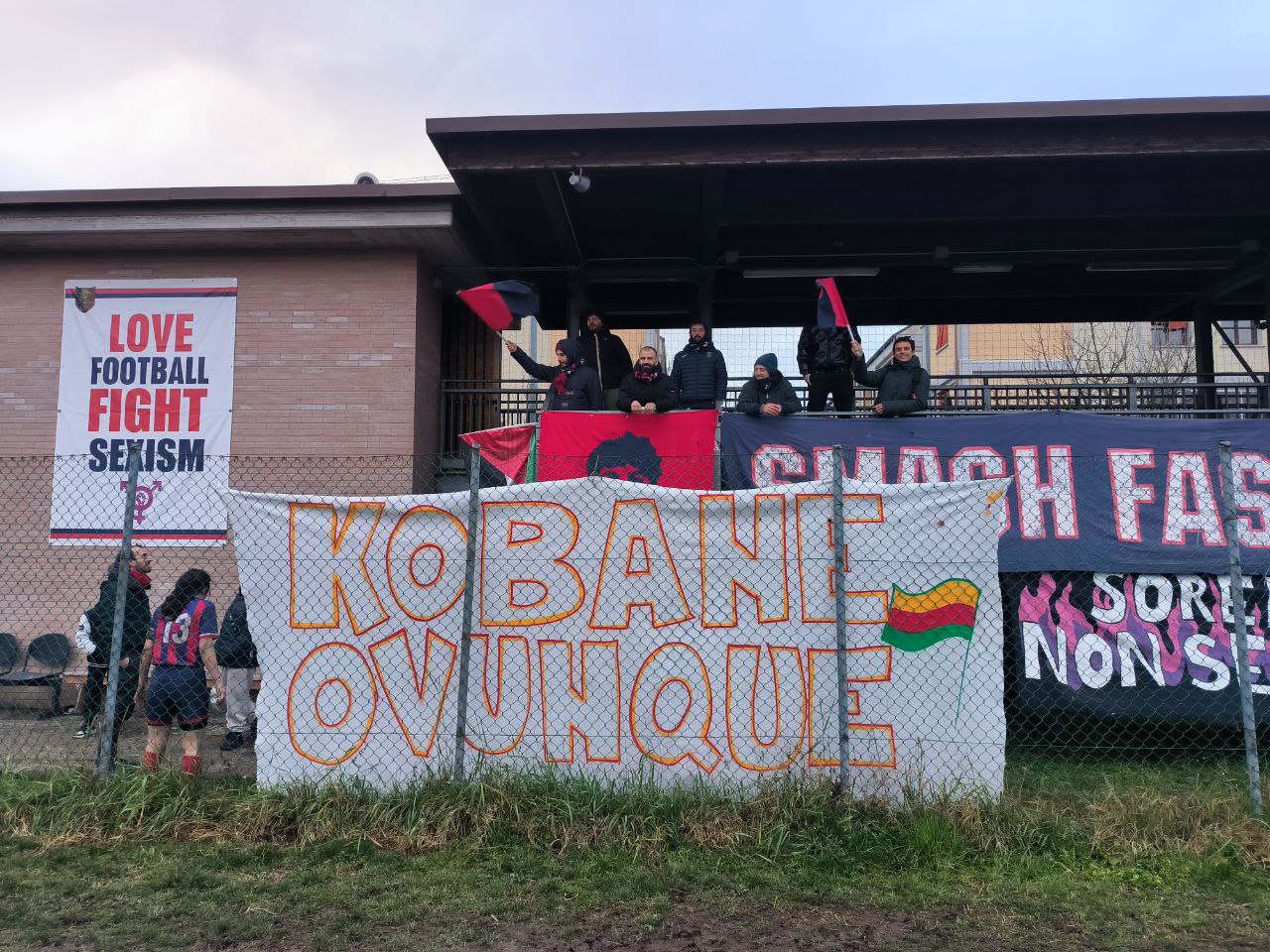 BOLOGNA- İtalya’nın Bologna kentinde  HSL Leonesse ve Riccione arasında bir kadın futbol maçı sırasında Kobane’nin kurtuluş yıldönümü için bir pankart açıldı. Üzerinde “her Yer Kobanê” yazılan pankartla aktivistler Kobanê’nin kurtuluşunun 10. yılını kutlayarak şu anda Tişrîn’de halk tarafından sürdürülen mücadeleyi de selamladı.