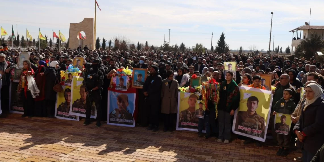 HESEKÊ – QSD savaşçıları Roman El Ehmed (Zuhêr Xanê) ve Harûn Leylûn (Mahir Seydo) ile Asayiş Güçleri üyesi Ehmed Mistefa’nın, Suriye geçici hükümetine bağlı grupların saldırılarına karşı yürütülen direnişte şehit düşmelerinin ardından cenazeleri, Hesekê kentinin Dawudiye köyünde bulunan Şehit Dijwar Mezarlığı’nda düzenlenen törenle toprağa verildi. Aynı direnişte şehit düşen QSD savaşçıları Egîd Hesekê (Raman Îsa) ve Milîtan Rojava (Mihemed Xişo) için ise gıyabi anma töreni gerçekleştirildi.