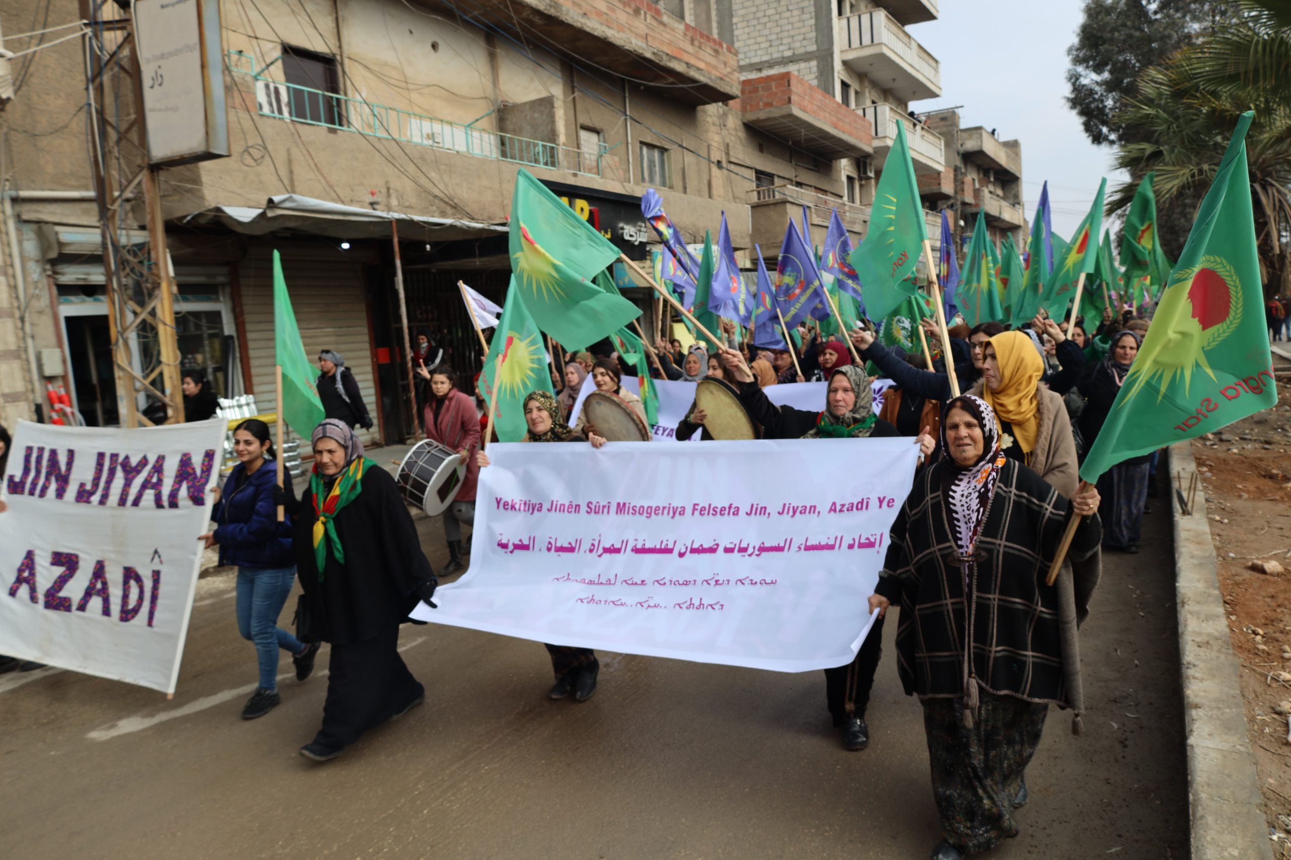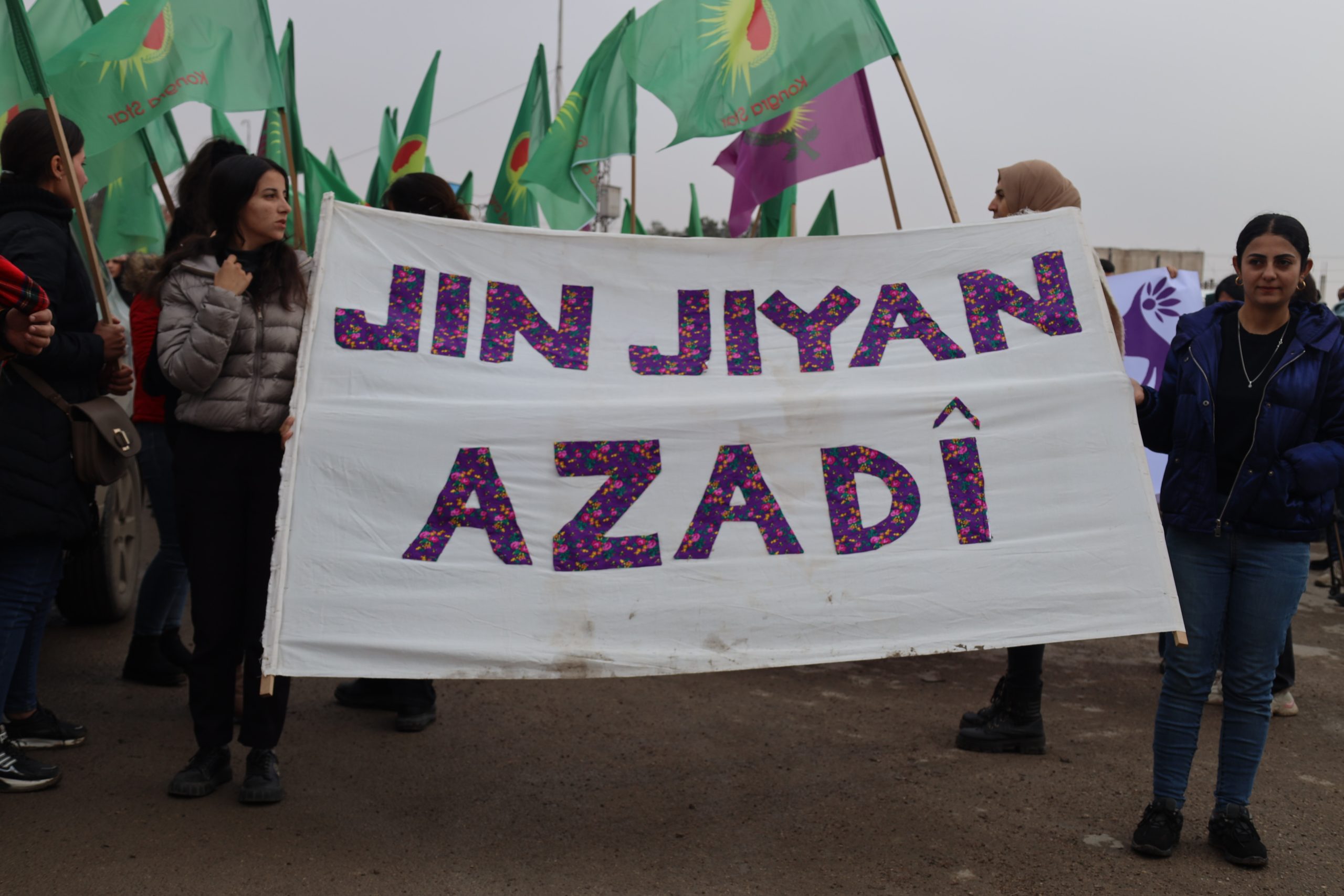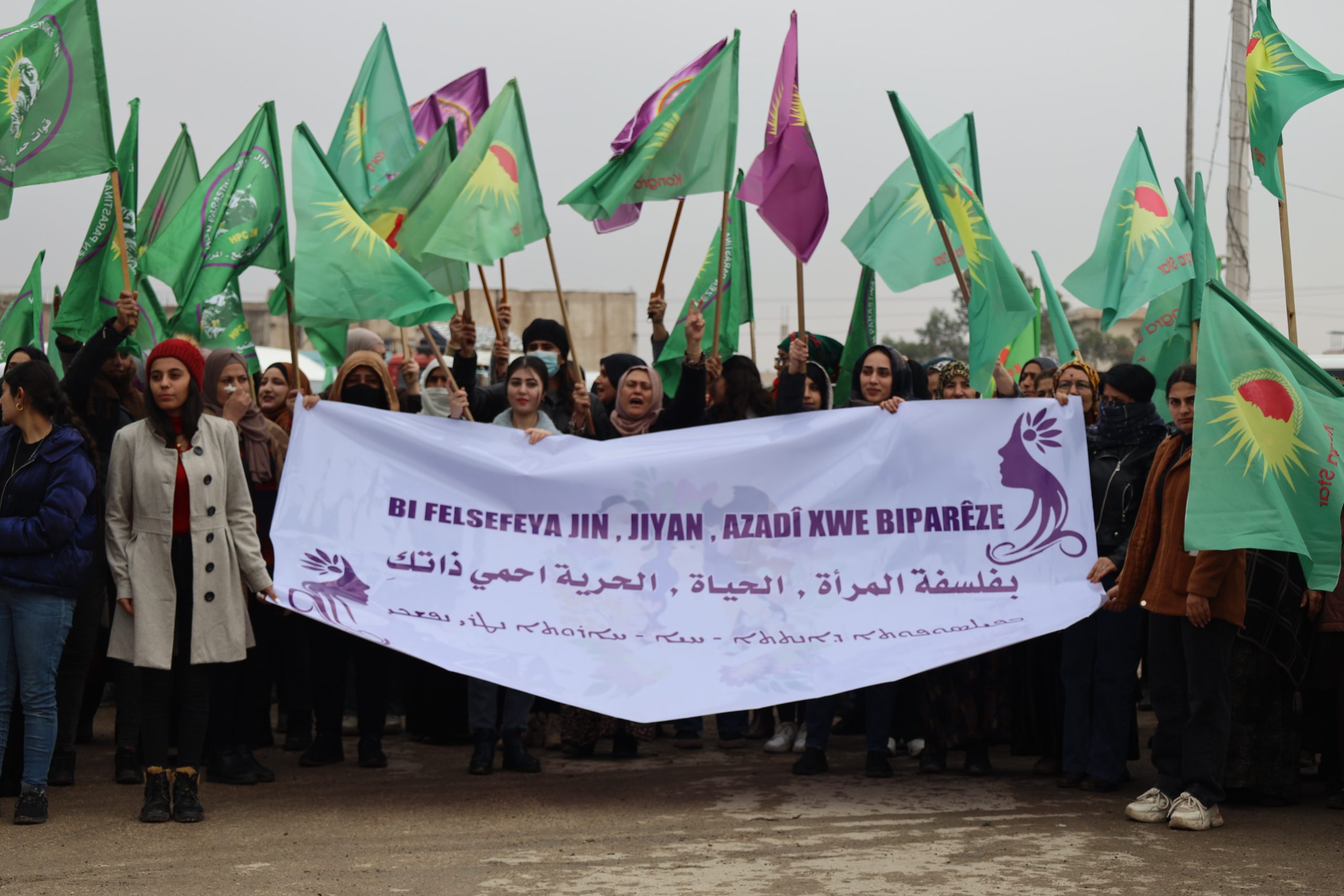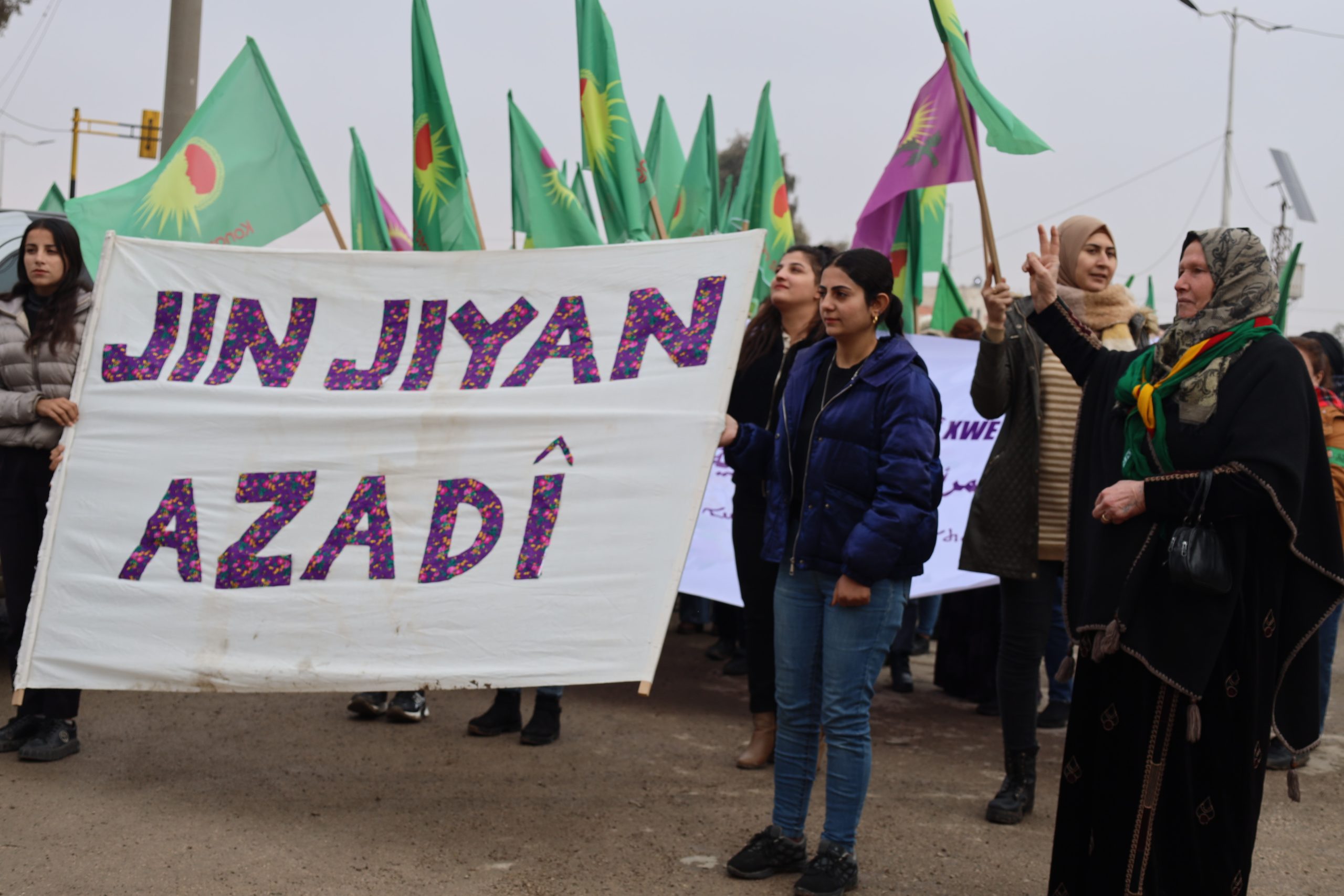 Yürüyüşte Kuzey ve Doğu Suriye’den tüm üyeler, anneler ve genç kadınlar hazır bulundu. Yürüyüşçüler, Kadın Savunma Birliği (YPJ) bayrakları ve “Suriye’nin inşasında kadınlar adaletin ve eşitliğin temelidir”, “Kadın, Yaşam, Özgürlük felsefesiyle kendinizi koruyun” uriyeli Kadınların Birliği Kadın, Yaşam ve Özgürlük felsefesinin teminatıdır”yazılı pankartlar taşıdı.