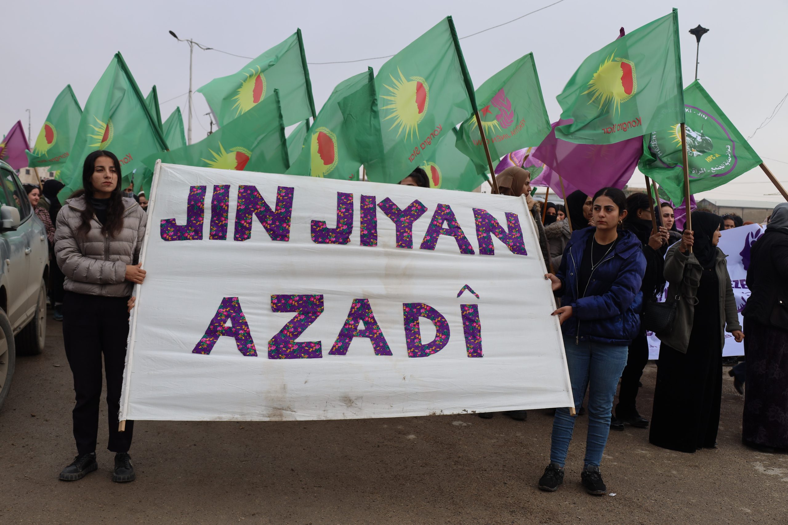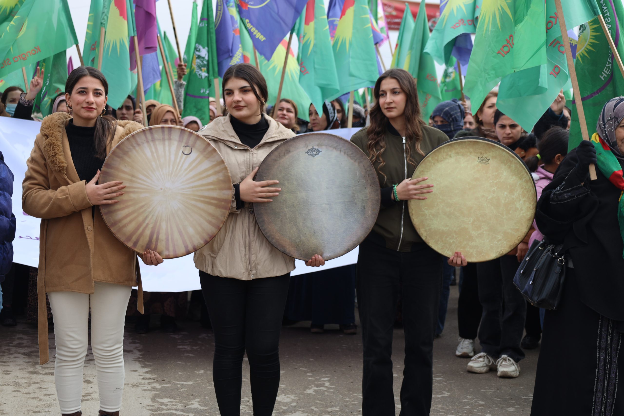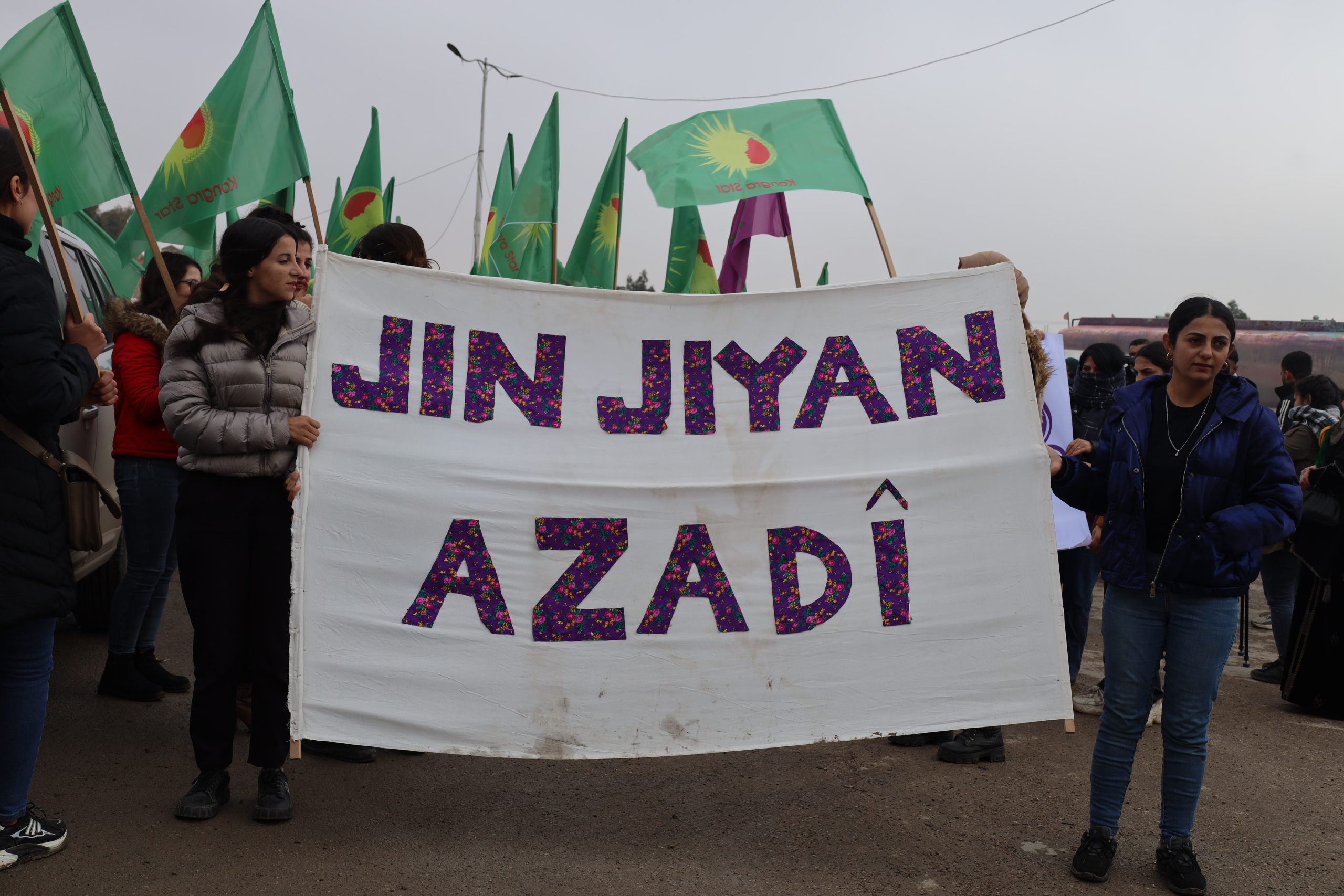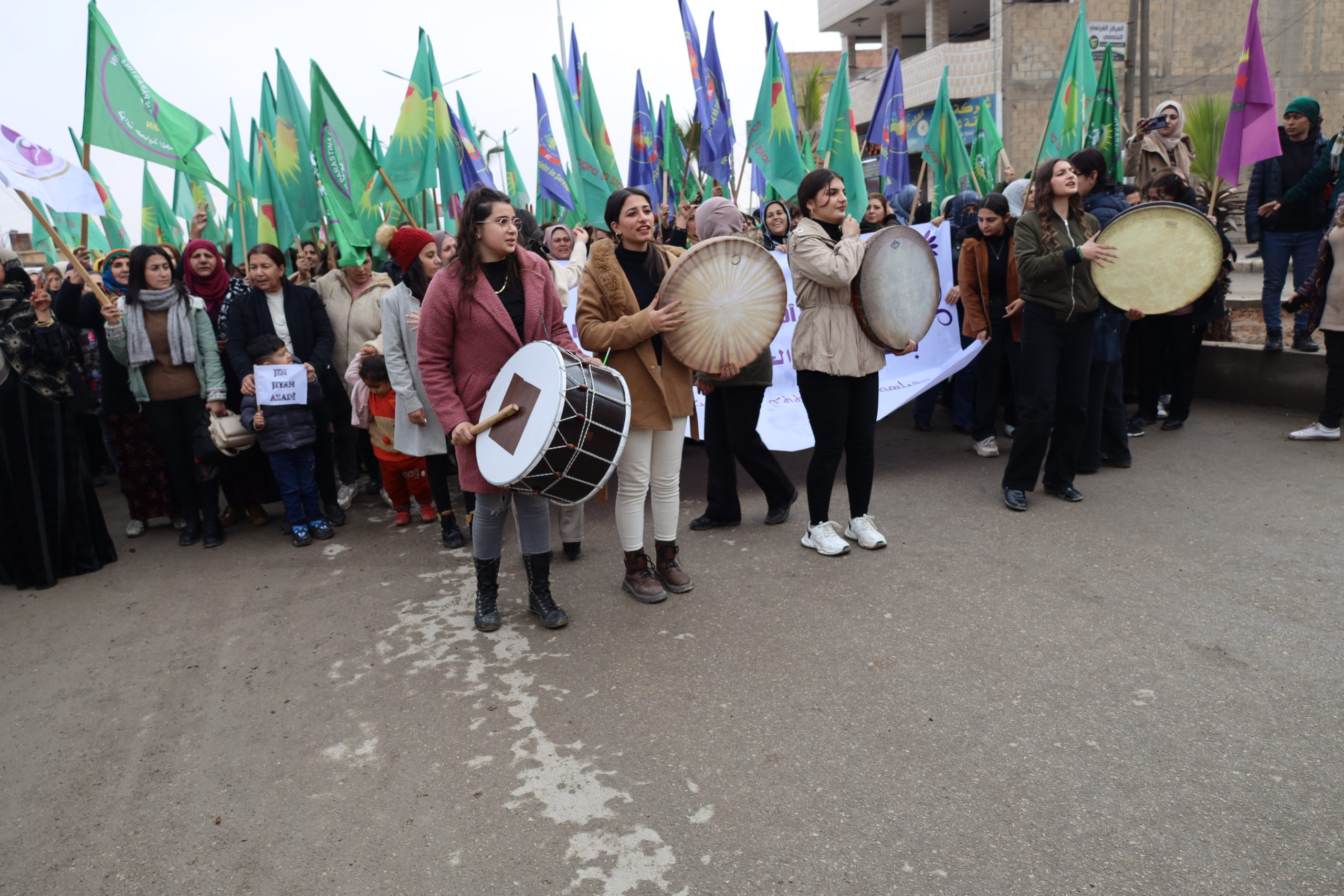 Yürüyüşte Kuzey ve Doğu Suriye’den tüm üyeler, anneler ve genç kadınlar hazır bulundu. Yürüyüşçüler, Kadın Savunma Birliği (YPJ) bayrakları ve “Suriye’nin inşasında kadınlar adaletin ve eşitliğin temelidir”, “Kadın, Yaşam, Özgürlük felsefesiyle kendinizi koruyun” uriyeli Kadınların Birliği Kadın, Yaşam ve Özgürlük felsefesinin teminatıdır”yazılı pankartlar taşıdı.