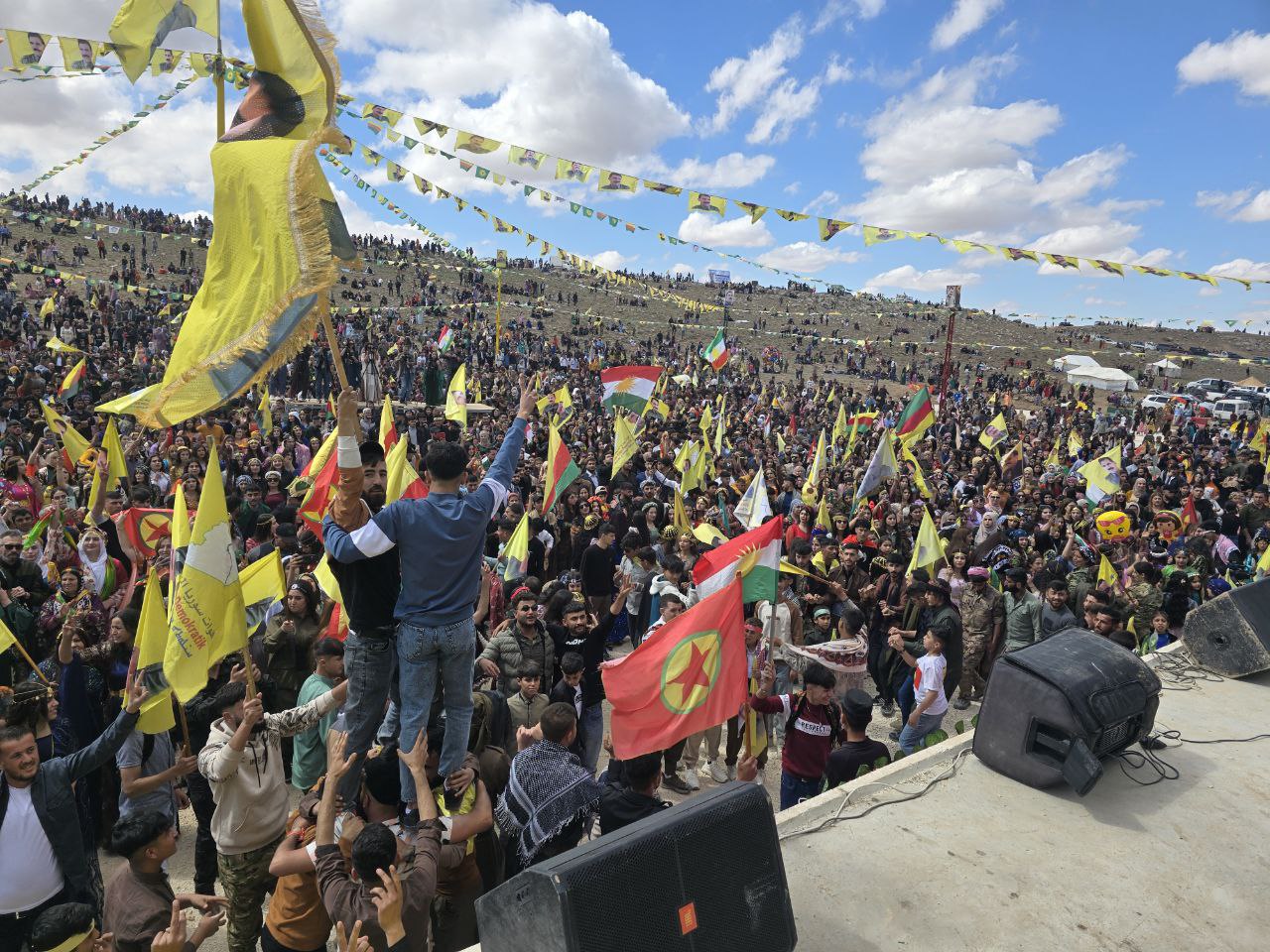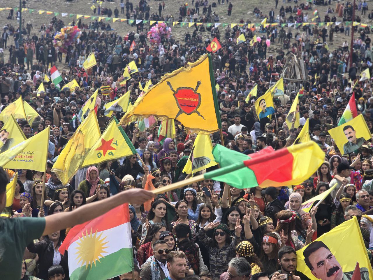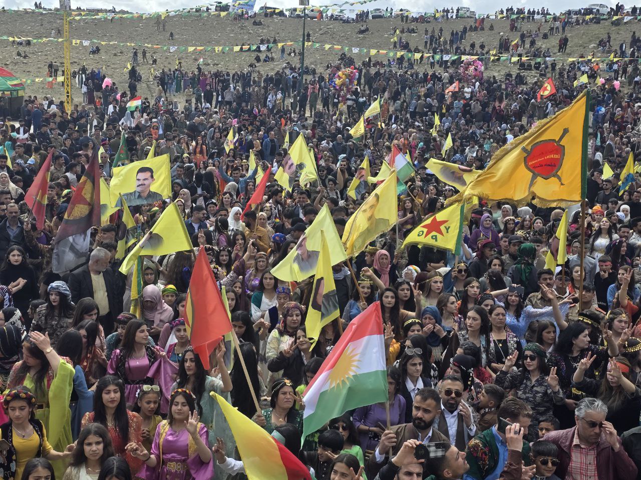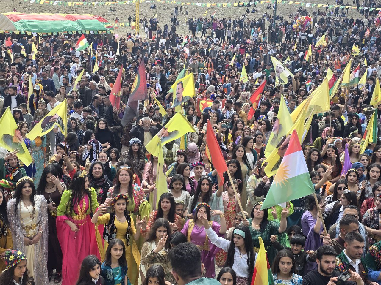 Ulusal kıyafetleriyle Newroz alanlarına akın eden Halk Önder APO’nun fiziki özgürlüğünü istedi. Meydan Önder APO’nun bayraklarıyla süslenmişti.