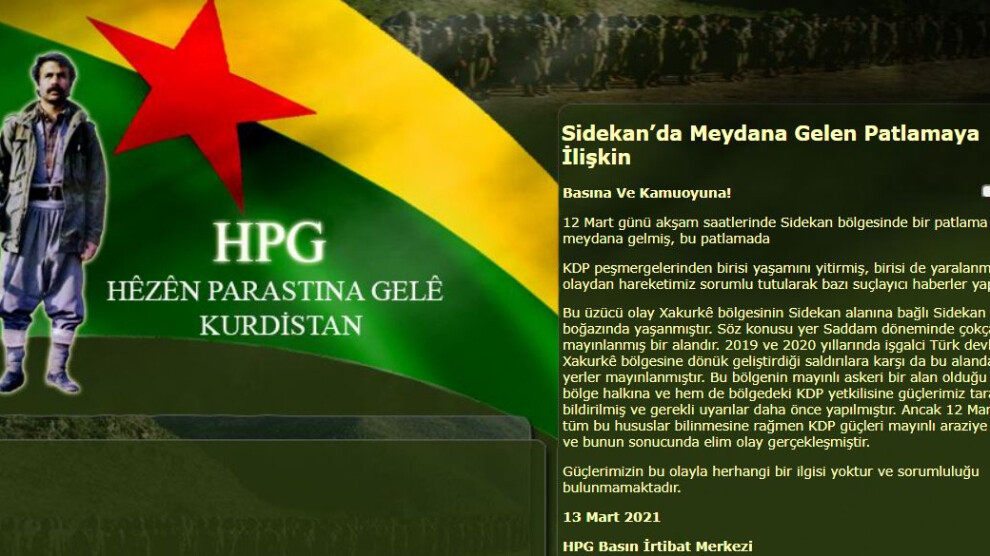 “12 Mart günü akşam saatlerinde Sidekan bölgesinde bir patlama meydana gelmiş, bu patlamada KDP peşmergelerinden birisi yaşamını yitirmiş, birisi de yaralanmıştır. Bu olaydan hareketimiz sorumlu tutularak bazı suçlayıcı haberler yapılmıştır.
