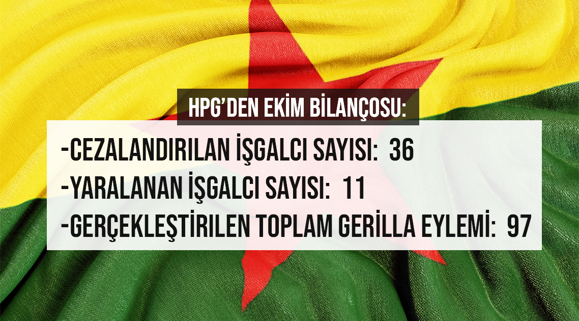 Sömürgeci soykırımcı Türk devletinin Bakurê Kurdistan eyaletleri başta olmak üzere Medya Savunma Alanları’nın tüm eyaletlerine dönük saldırıları aralıksız bir biçimde devam etmiştir. Bakurê Kurdistan’daki operasyonları sonuçsuz kalan işgalci Türk ordusu, Medya Savunma Alanları’nı ise çok yoğun bir biçimde bombalamıştır. Ekim ayı içerisinde Medya Savunma Alanları 302 kez savaş uçakları, 347 kez saldırı helikopteri, 1 kez kimyasal silahlar, 2 kez patlayıcı yüklü dronlar ve 101 kez yasaklı patlayıcılar ile bombalanmıştır. İşgalci Türk ordusu yasaklı silahlar kullanarak ve sürekli bombardımanlar yaparak savaş suçu işlemeye devam etmiştir. Ancak Kurdistan Özgürlük Gerillası, savaş suçlusu işgalci Türk ordusunun bu saldırılarını bertaraf edip boşa çıkarmasını bilmiştir. Aynı zamanda işgalci ordunun saldırılarına gerekli yanıtı vermiş, 1’i hava, 96’sı kara eylemi olmak üzere çok farklı taktikleri büyük bir ustalıkla uygulayarak toplamda 97 eylem gerçekleştirmiştir. Bu eylemler sonucunda, 1’i rütbeli toplam 36 işgalci cezalandırılmış, 11 işgalci de yaralanmıştır.