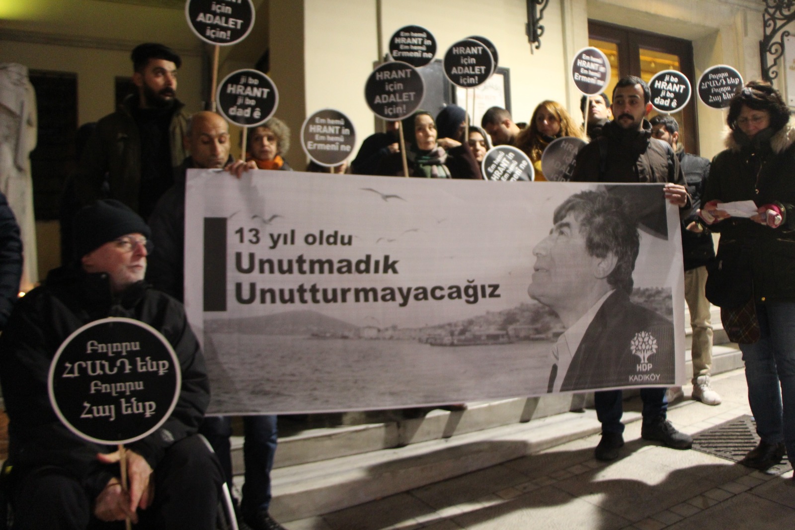 Anma da sık sık ‘Hrant için adalet herkes için adalet’, ‘Hrant’ın hesabı sorulacak’ ve ‘Tahir Elçiyle Kürdüz Hrant Dinkle Ermeniyiz’, ‘Hrant için adalet’ dövizlerinin yanı sıra Ermenice dövizlerde taşındı.