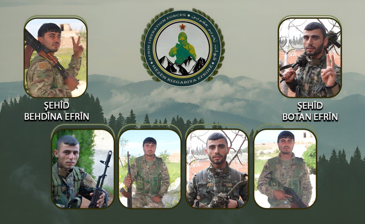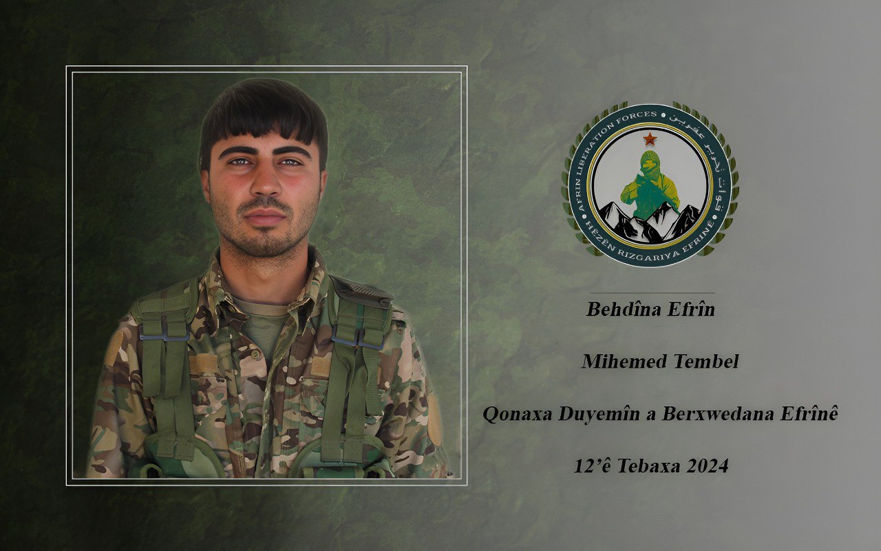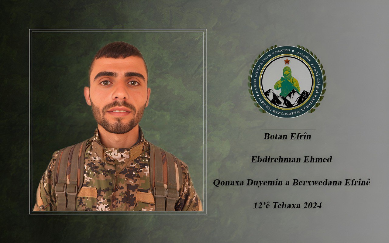 Özgürlük yürüyüşünün başlangıcında büyük bedeller ödeyen, devrimin kazanımlarını korumak için mücadele eden, direnen Efrîn halkımız, onurlu ve vatansever bir şekilde yaşamakta ısrar etti. Botan Efrîn ve Behdina Efrîn yoldaşlarımız Efrin bölgesinde devrimci değerlerin kazanımlarını korumak için çalışan cesur ve fedakar iki yoldaşımızdı. 12 Ağustos 2024 tarihinde Efrîn bölgesinde timimiz ile işgalci düşman arasında çatışma çıkmıştır. Çatışma sonucunda Botan ve Behdina Efrîn yoldaşlarımız şehit oldu.