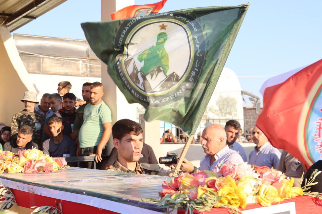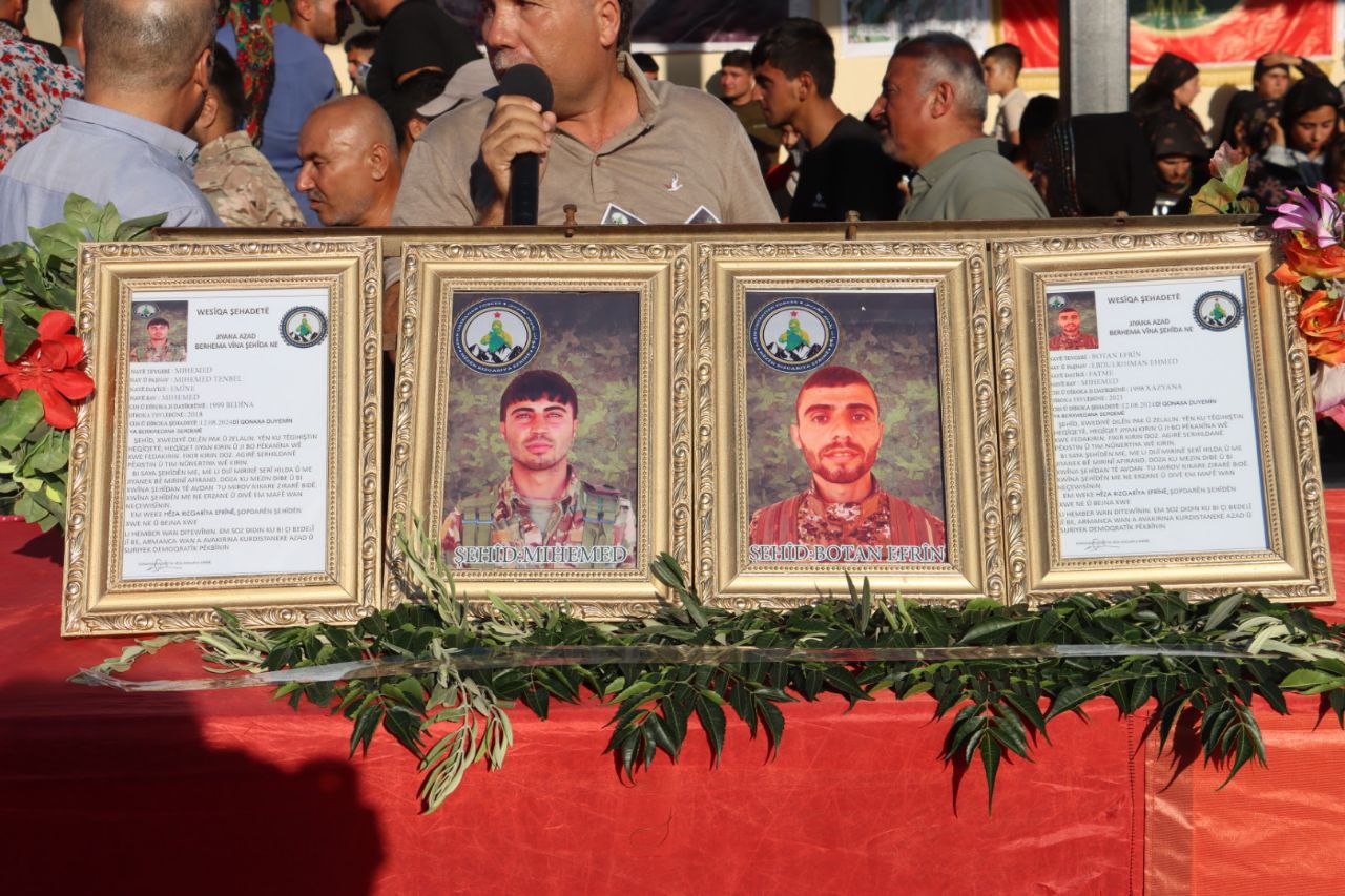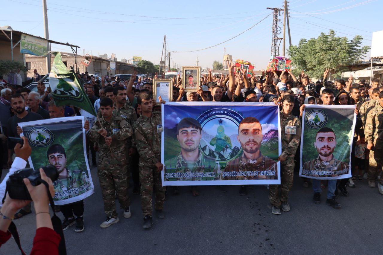 ŞEHBA- 12 Ağustos 2024’te şehadete ulaşan Efrin Kurtuluş Güçleri (HRE) savaşçısı Botan Efrîn (Ebdilrehman Ehmed) ve şehit Behdîna Efrîn (Mihemed Tenbel), dün Fafînê beldesindeki Şehit Zozan Amanos Şehitliği’nde son yolculuklarına uğurlandı.