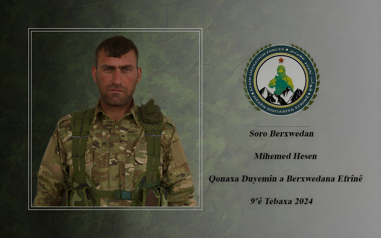 “Efrin Çağı Direnişi’nin ikinci aşamasında işgalci Türk devleti ve çetelerine karşı devam eden direniş ve mücadele çerçevesinde, Efrin bölgesindeki çalışmalarda yer alan Soro yoldaşımız, 9 Ağustas 2024 tarihinde görevini icra ettiği sırada şehit düştü,