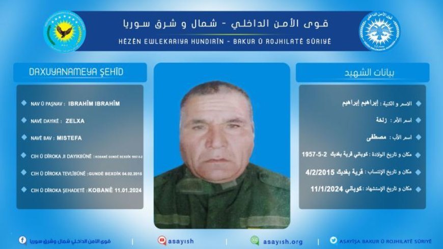 İç Güvenlik Güçleri, üyeleri Îbrahîm Mistefa Îbrahîm’in hastalık sonucu şehit düştüğünü duyurdu.
