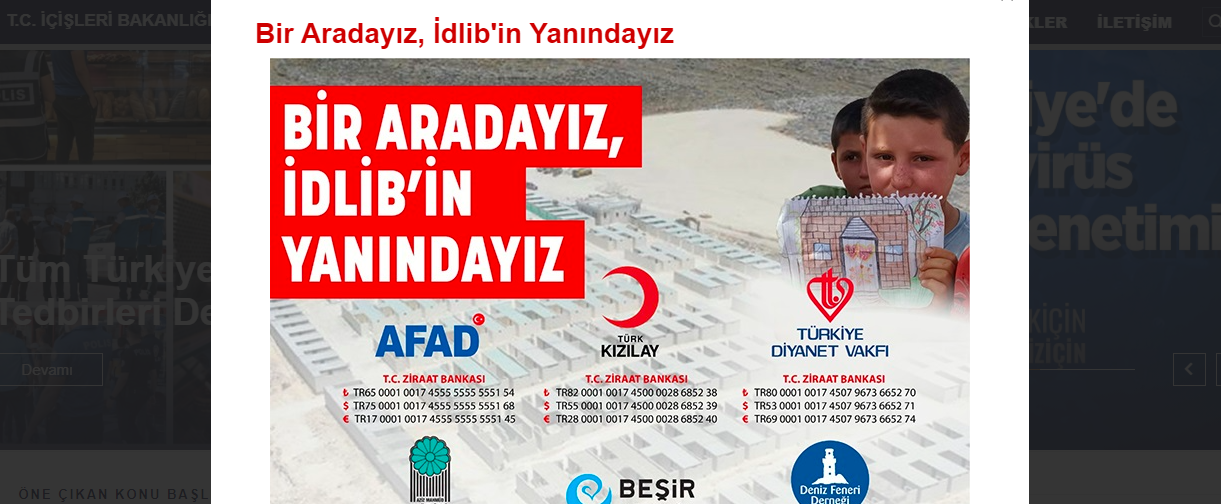 İşgal altında olan İdlib için yardım kampanyası başlatan Türk İçişleri Bakanlığı, bu durumu kendi internet sitesine de taşımış durumda. İçişleri Bakanlığı’nın internet sitesine girildiği anda ‘İdlib için yardım kampanyası’ şeklinde bir sayfa gelmekte. Para yatırılması için onlarca banka hesap numarasının verildiği sayfa, sömürgeci Türk devletinin işgal ve ekonomi politikalarında yaşadığı zorlanmayı gözler önüne sermekte.