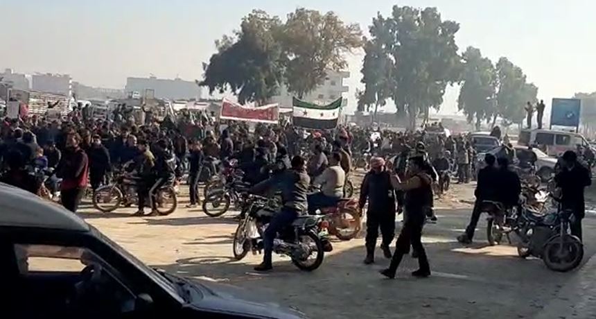 Görüntülerde işgalci Türk devleti aleyhine sloganlar atan grupta yer alan bir kişi, Arapça, “Bu yürüyüş, Türkiye’nin garantörlüğünde alınan onurumuzu geri almak içindir” diyor.