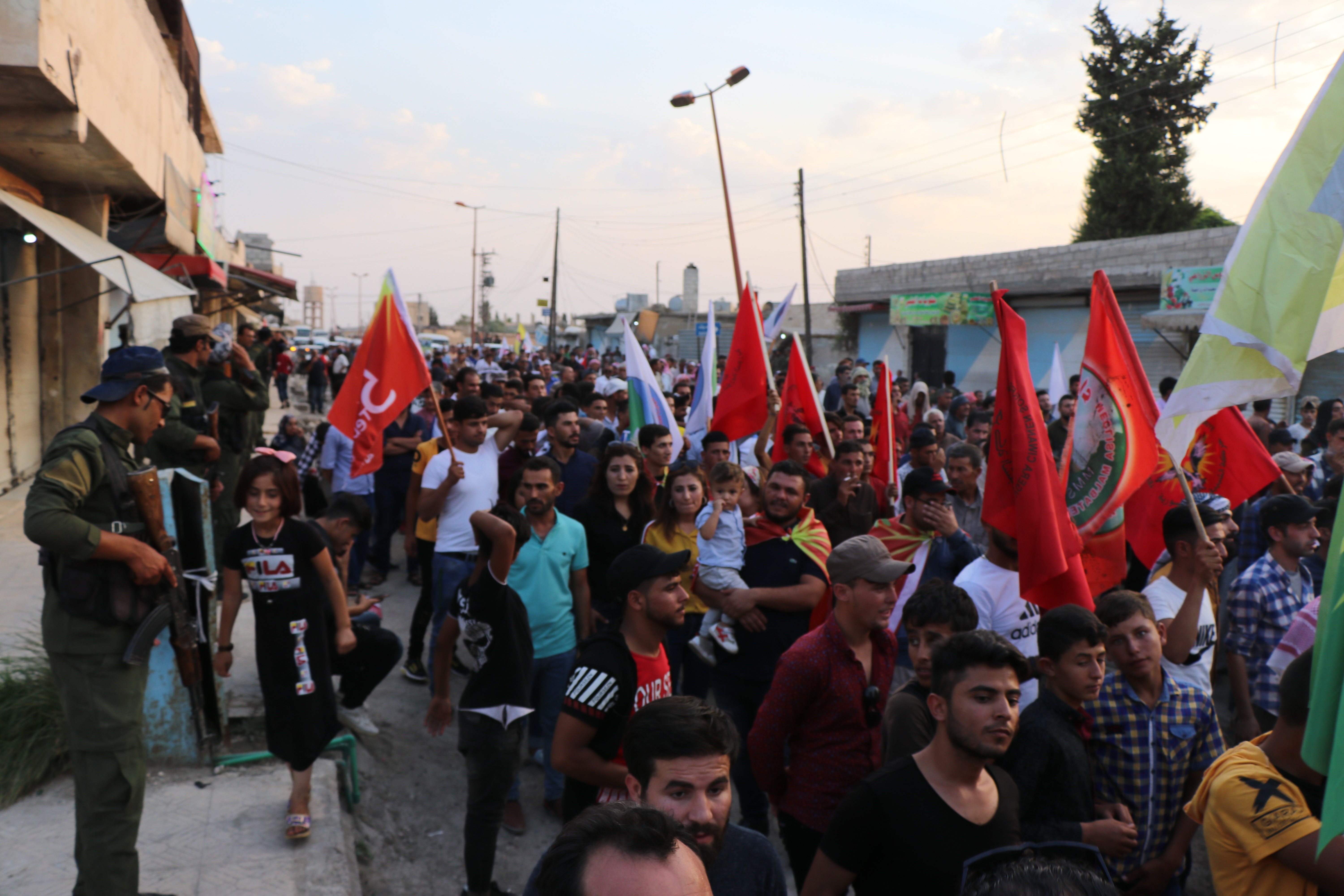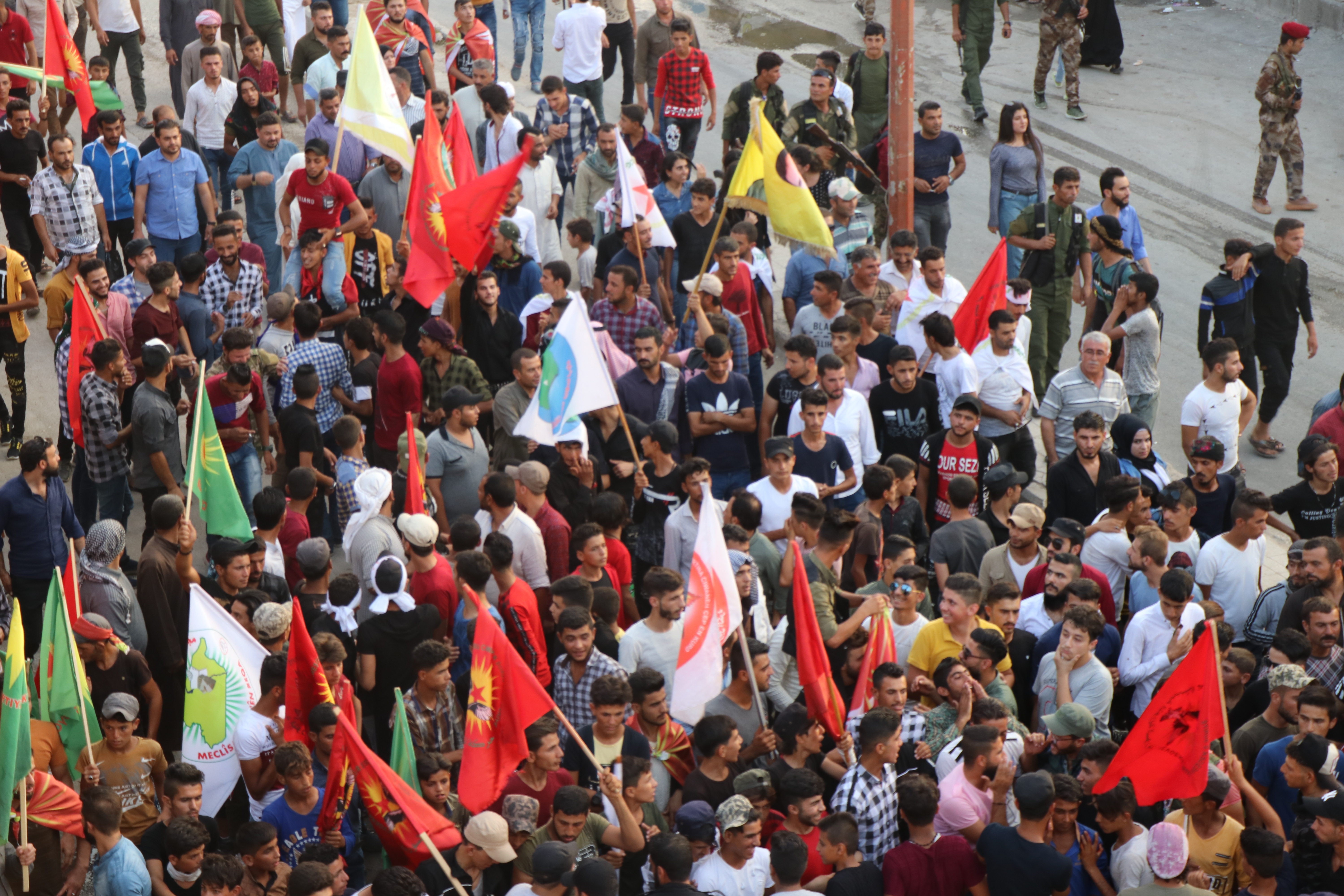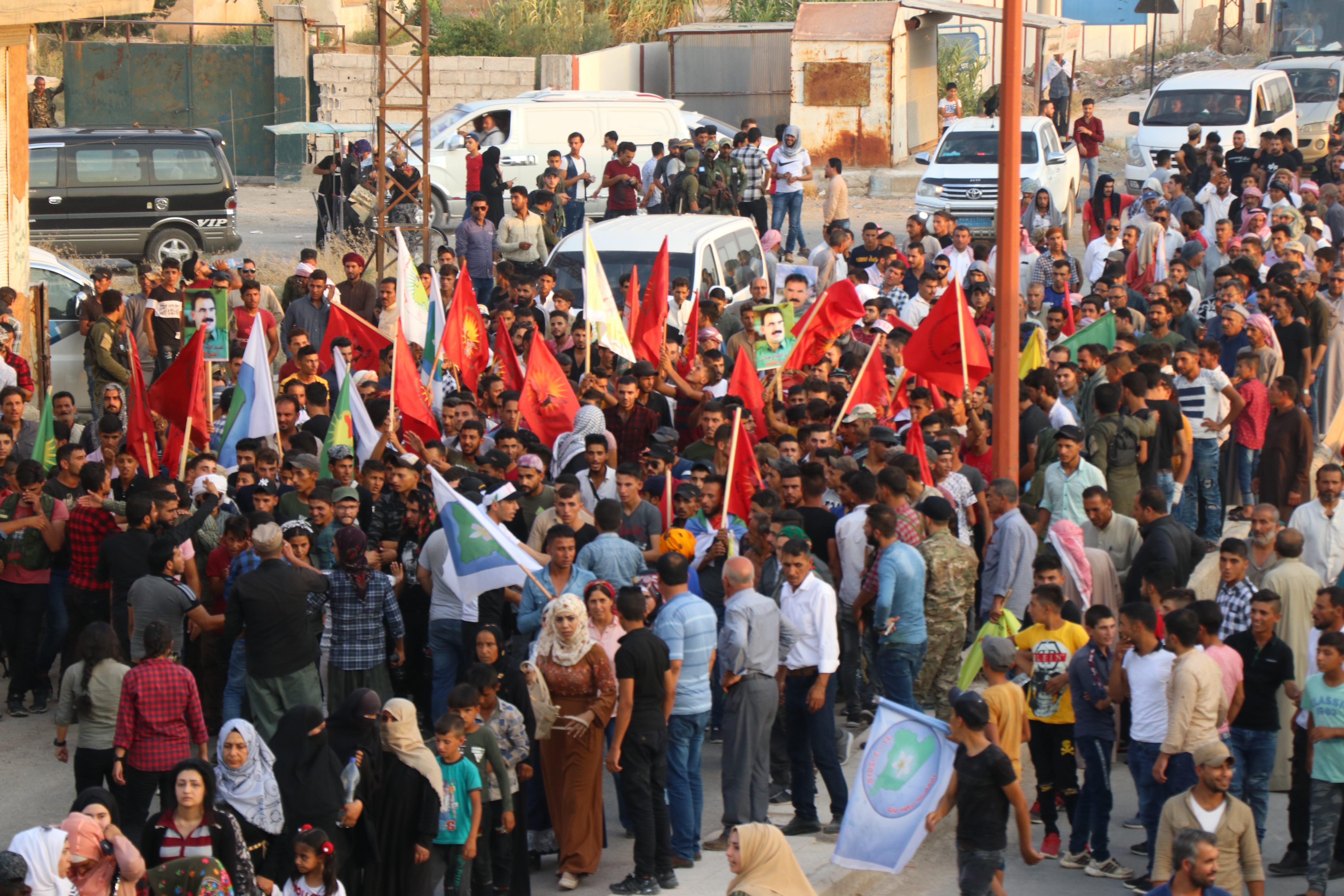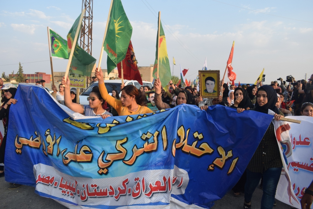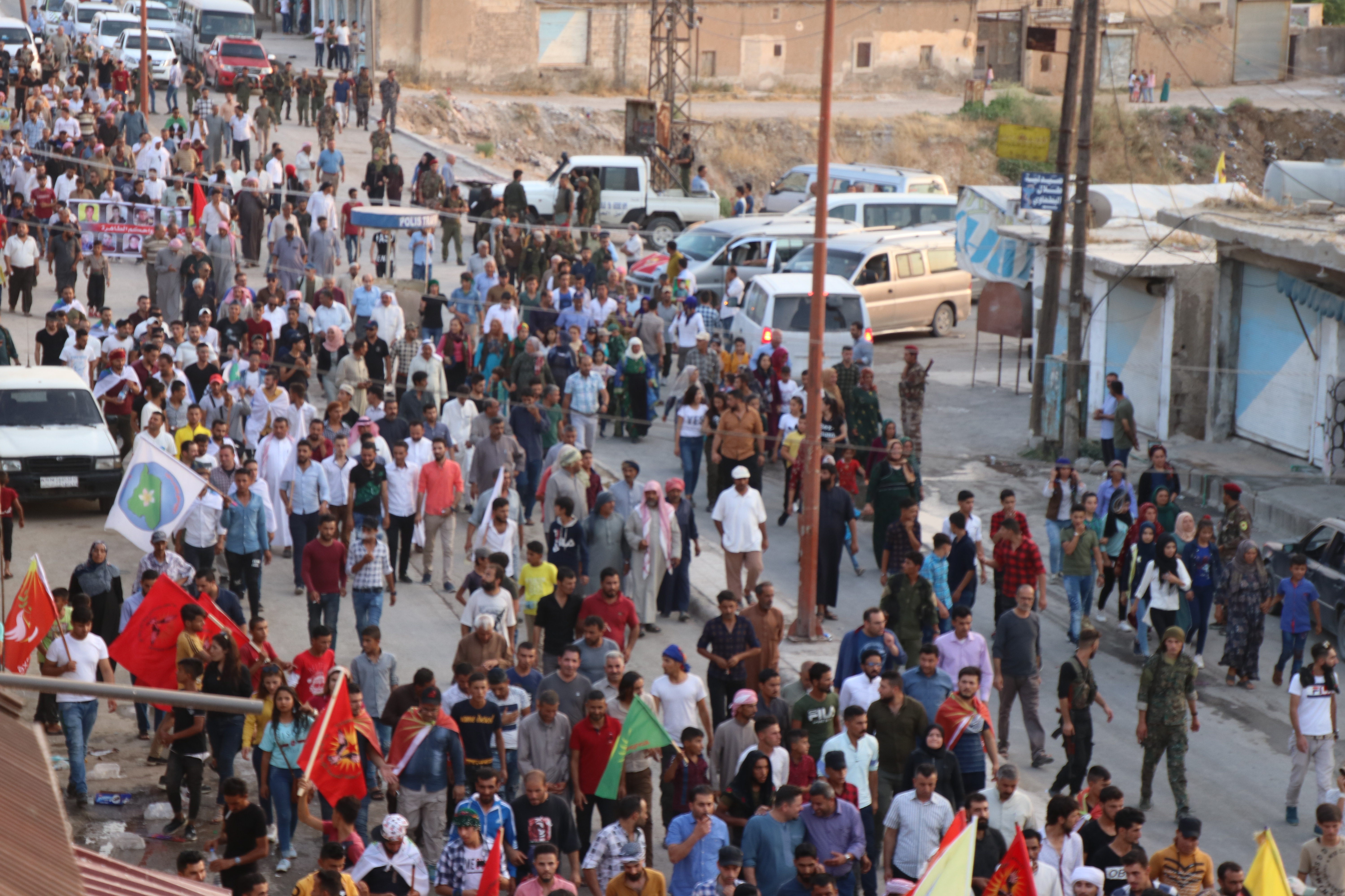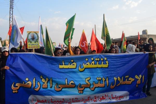 Yürüyüş eylemi Eyn Erûs sokağında başlayarak canlı kalkan eylemlerinin olduğu alana doğru başlatıldı. Yürüyüşte gençler ” Suriye de Türk işgaline son, topraklarımız bölenleri reddediyoruz” pankart ile yürüdü. Yürüyüşte sık sık işgalci Türk devletinin bahsettiği “güvenli bölge” ye karşı sloganlar atıldı.