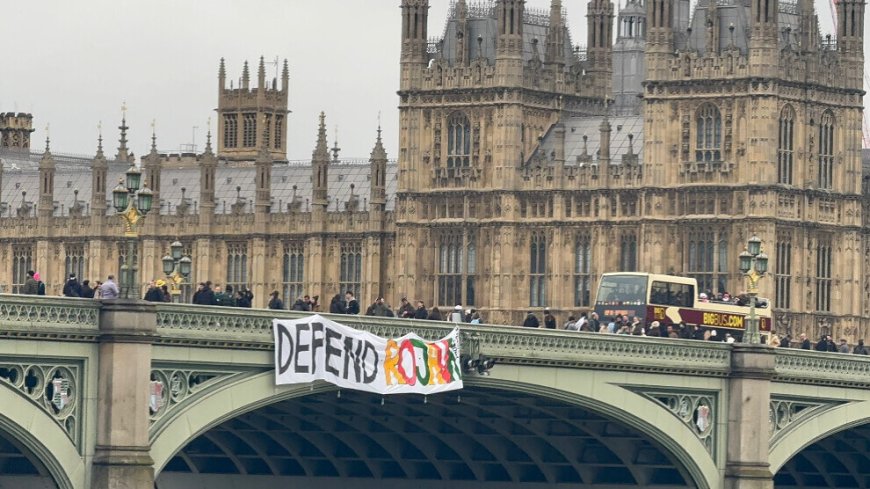 HABER MERKEZİ- Sosyalist Gençlik Mücadele Örgütü aktivistleri, (Young Struggleyê) İngiltere’nin başkenti Londra’da parlamento binası önünde “Defend Rojava” (Rojava’yı Savun) pankartı açarak, işgal saldırılarına dikkat çekti.