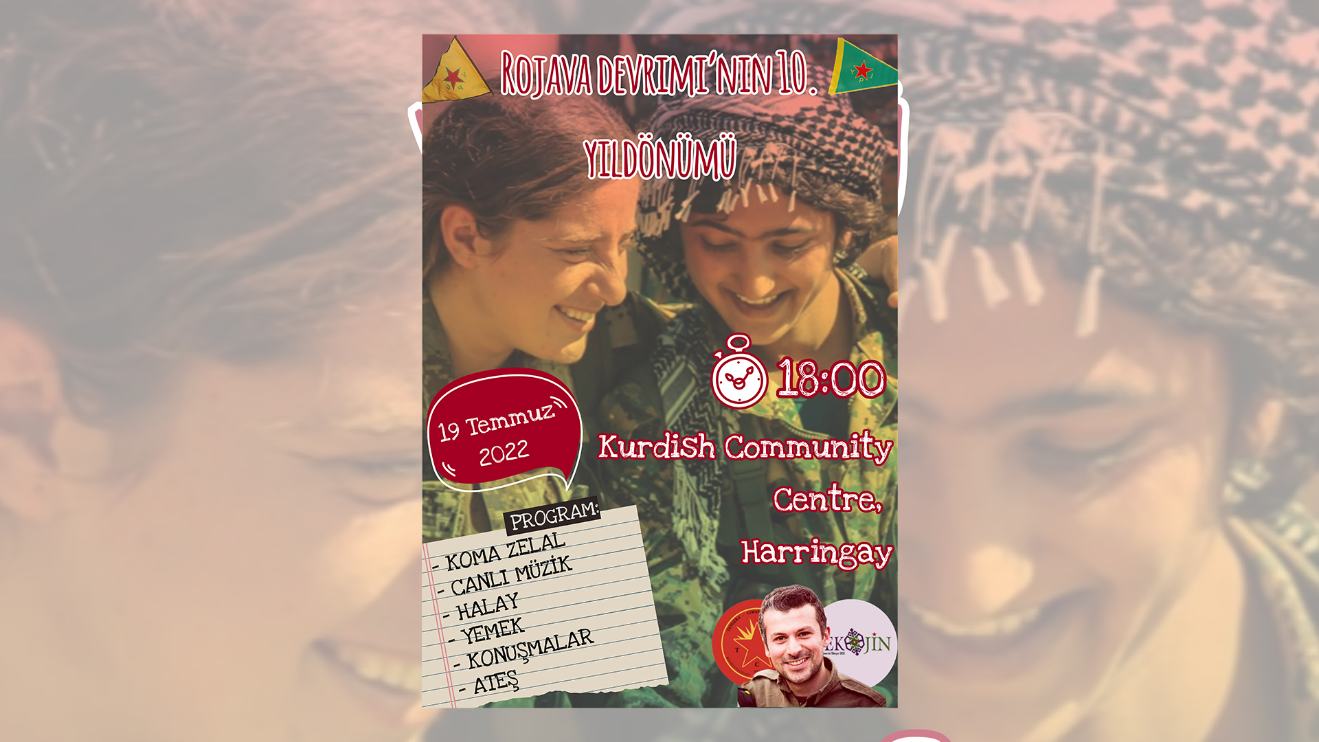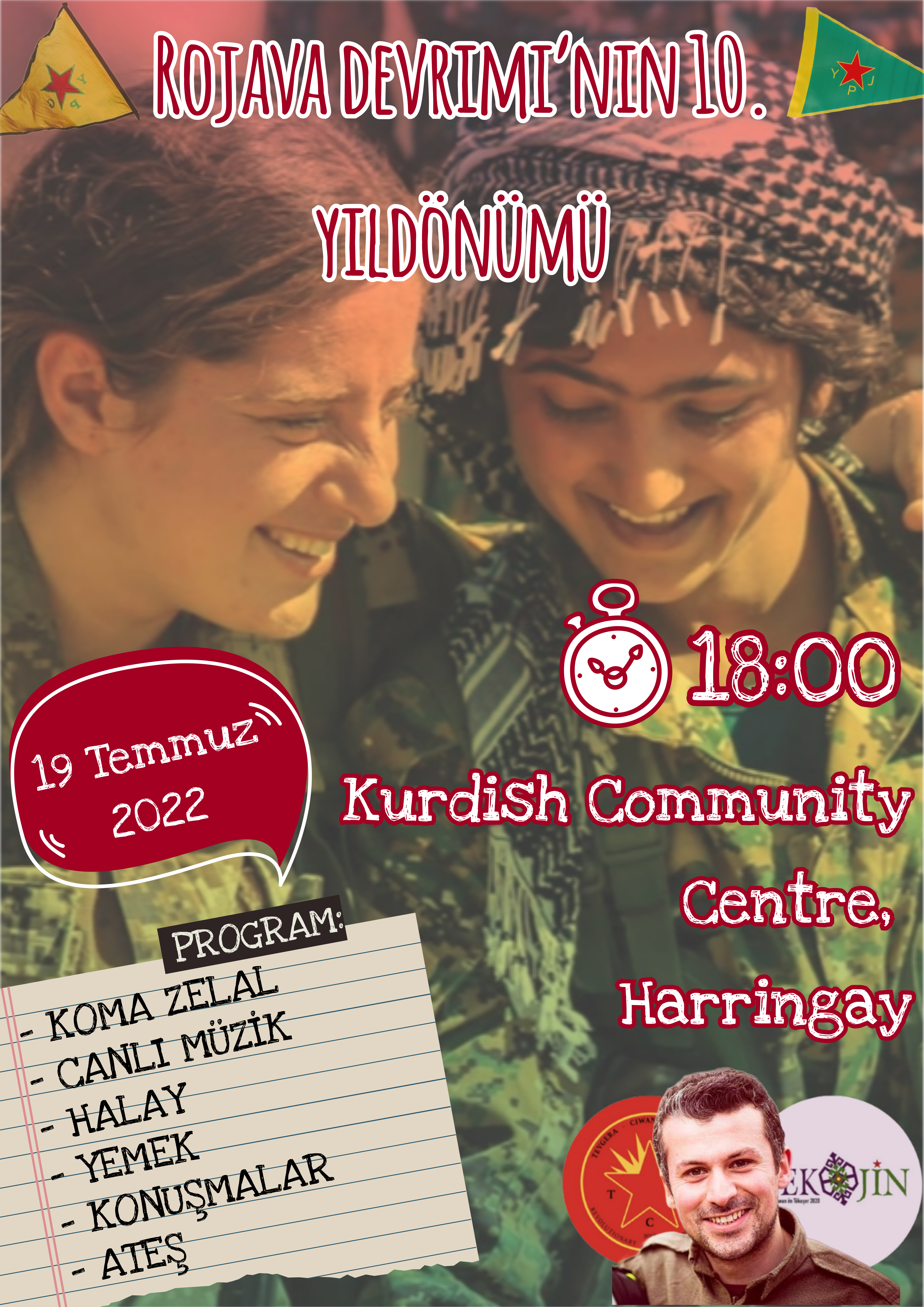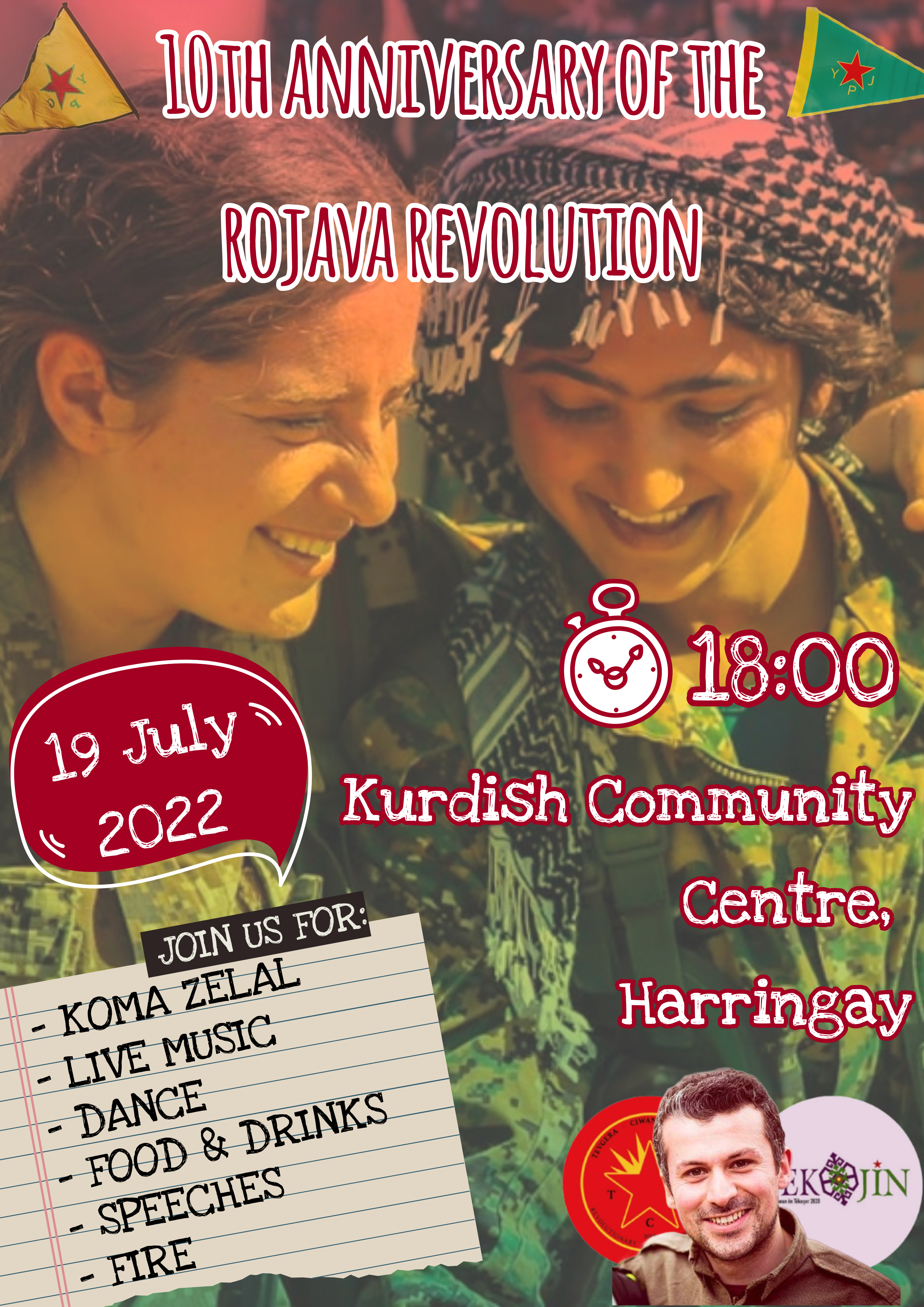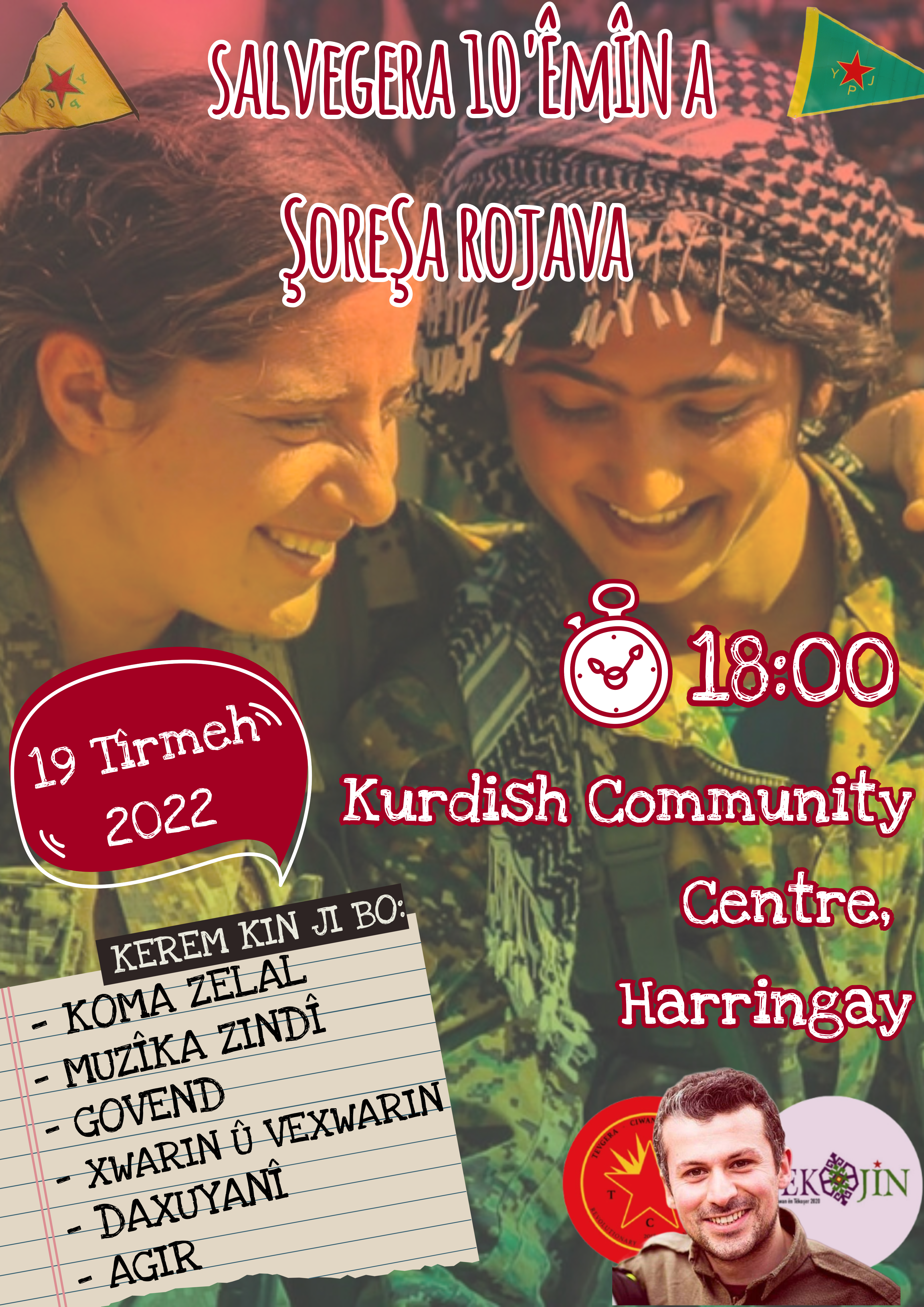 İngiltere’den Rojava’da mücadele saflarına katılıp ölümsüzleşen Ş. Hêlîn Qereçox, Ş. Şoreş Amanos, Ş. Kemal, Ş. Canşêr Zagros, Ş. Fîraz Dağ ve Ş. Givara Rojava şahsında tüm Rojava devrimi şehitlerinin anılacağı ve Rojava devriminin 10.uncu yılının kutlanacağı etkinliklere tüm Kürt halkını, dostlarımızı ve Kürdistan gençliğini bekliyoruz.