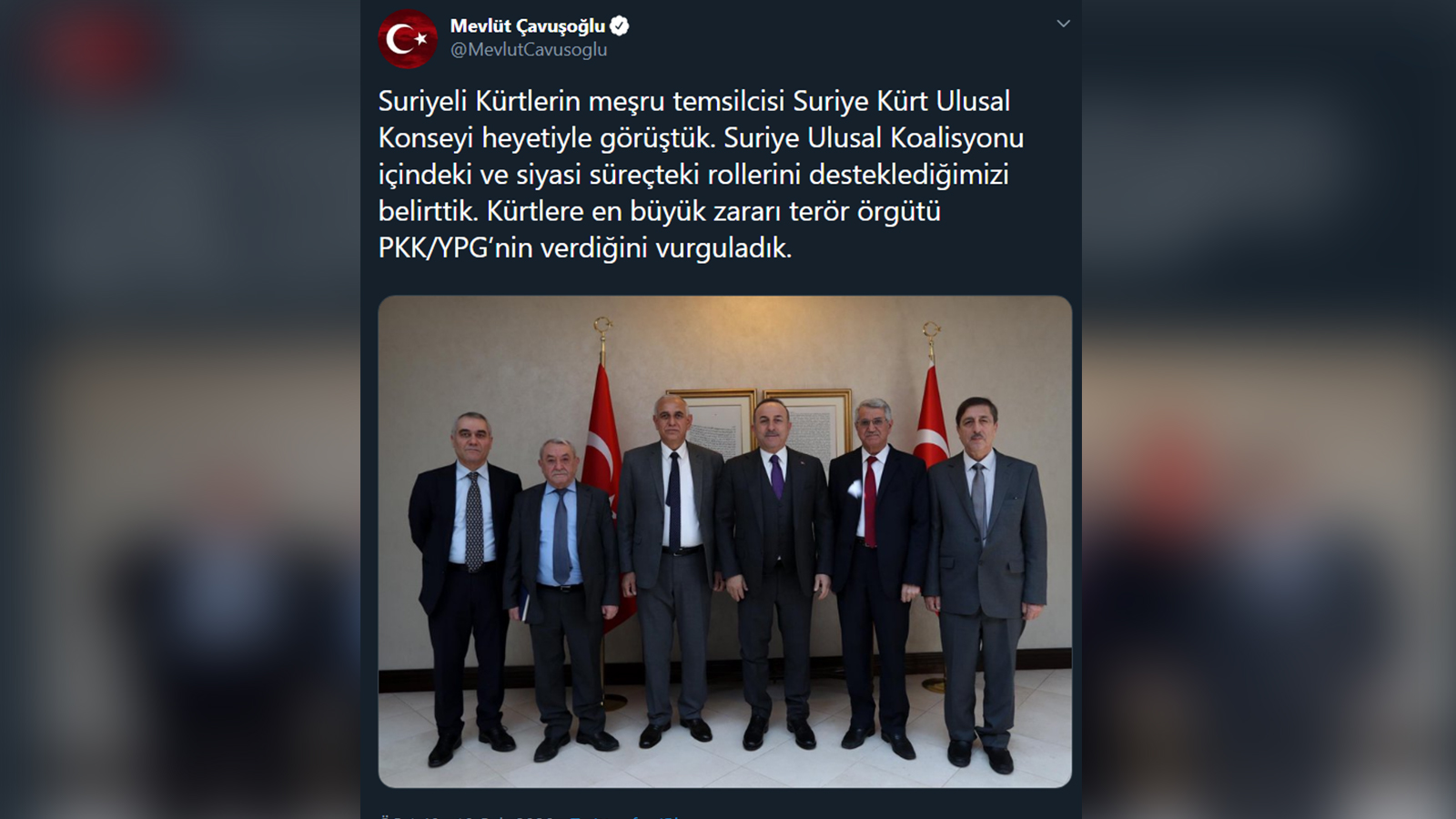 Kürt ulusal birliği için gerçek engelin kim olduğunu açıkça ortaya koyan Çavuşoğlu’nun Twitter üzerindeki açıklamasında Özerk Yönetimi hedef alınarak şu ifadelere yer verildi: “Suriyeli Kürtlerin meşru temsilcisi Suriye Kürt Ulusal Konseyi heyetiyle görüştük. Suriye Ulusal Koalisyonu içindeki ve siyasi süreçteki rollerini desteklediğimizi belirttik. Kürtlere en büyük zararı terör örgütü PKK/YPG’nin verdiğini vurguladık.”