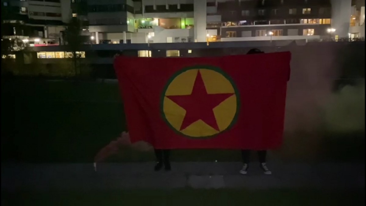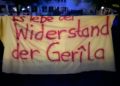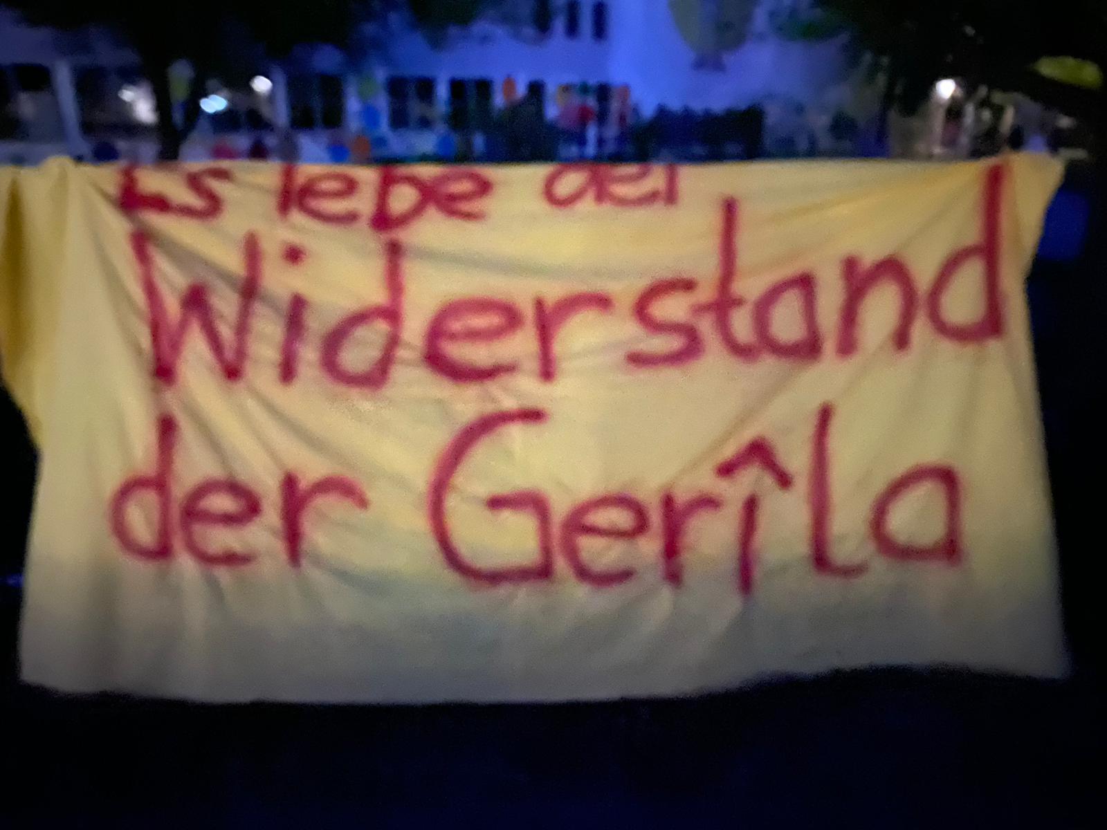 Saat 21.30’da kentin merkezi bir noktasında bir araya gelen gençler, Almanca “Es lebe der Wiederstand der Gerîla (Yaşasın Gerilla Direnişi)” yazılı pankart ve büyük bir PKK bayrağı açtı.