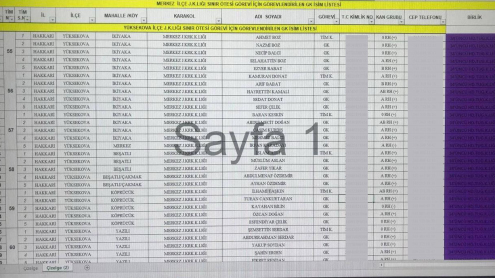 KDP’nin Türk devleti ile ortak hareket etmesinin yarattığı tepkileri zamana yayarak kırmak isteyen Türk devleti, bu sefer de korucuları Kürt Özgürlük Hareketi’ne karşı kullanmak için harekete geçti. Bu kapsamda Colemêrg’in (Hakkari) Gever (Yüksekova) bölgesinden işgal saldırısına katılmak için hazırlanan yüzlerce korucunun olduğu öğrenildi. ANF, “Merkez ilçe jandarma komutanlığı sınır ötesi görevi için görevlendirilen güvenlik korucuları isim listesi”ne ulaştı. Listede 34. Hudut Tugay Komutanlığı ve 51. Komando Tugay Komutanlığına görevlendirilen korucuların isim ve soy isimlerinden nereli olduklarına, cep telefonu numaralarından kan gruplarına, TC kimlik numaralarından aldıkları göreve kadar ibareler yer alıyor.