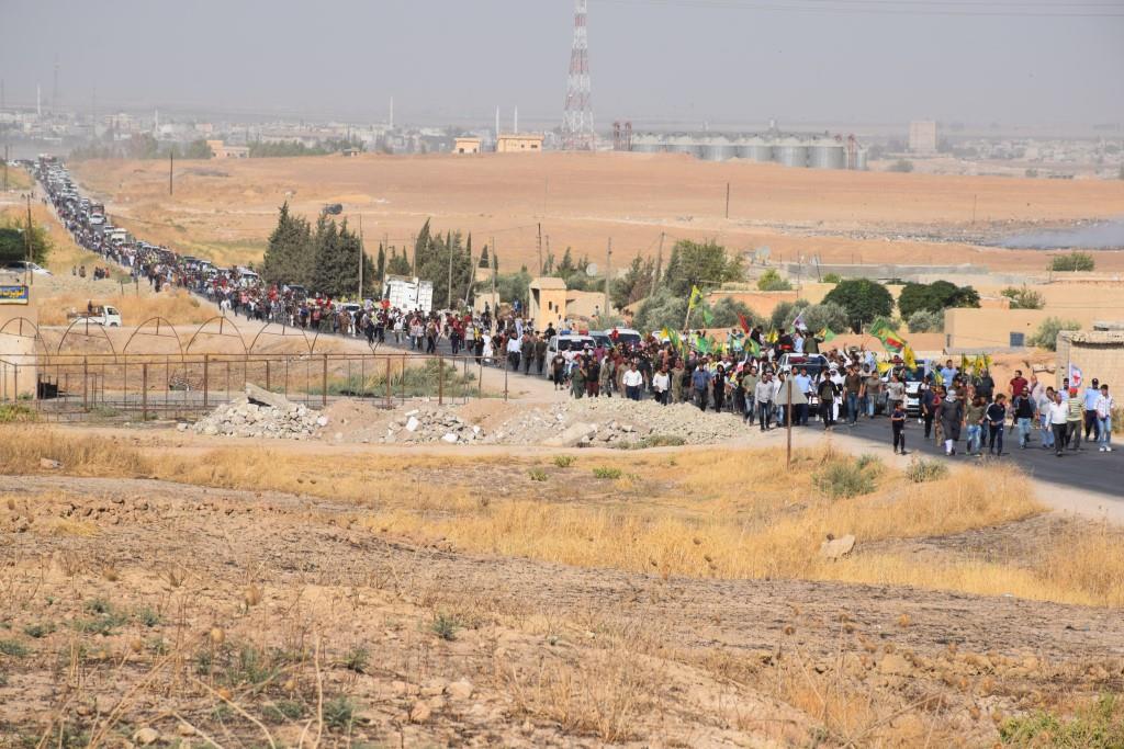 Binlerce yurttaştan oluşan yürüyüşte Arap ve Kürt kanaat önderleri, siyasi parti temsilcileri ve sivil toplum temsilcileri de yer aldı. Yürüyüş boyunca işgal tehditlerine karşı direniş sloganları atıldı.