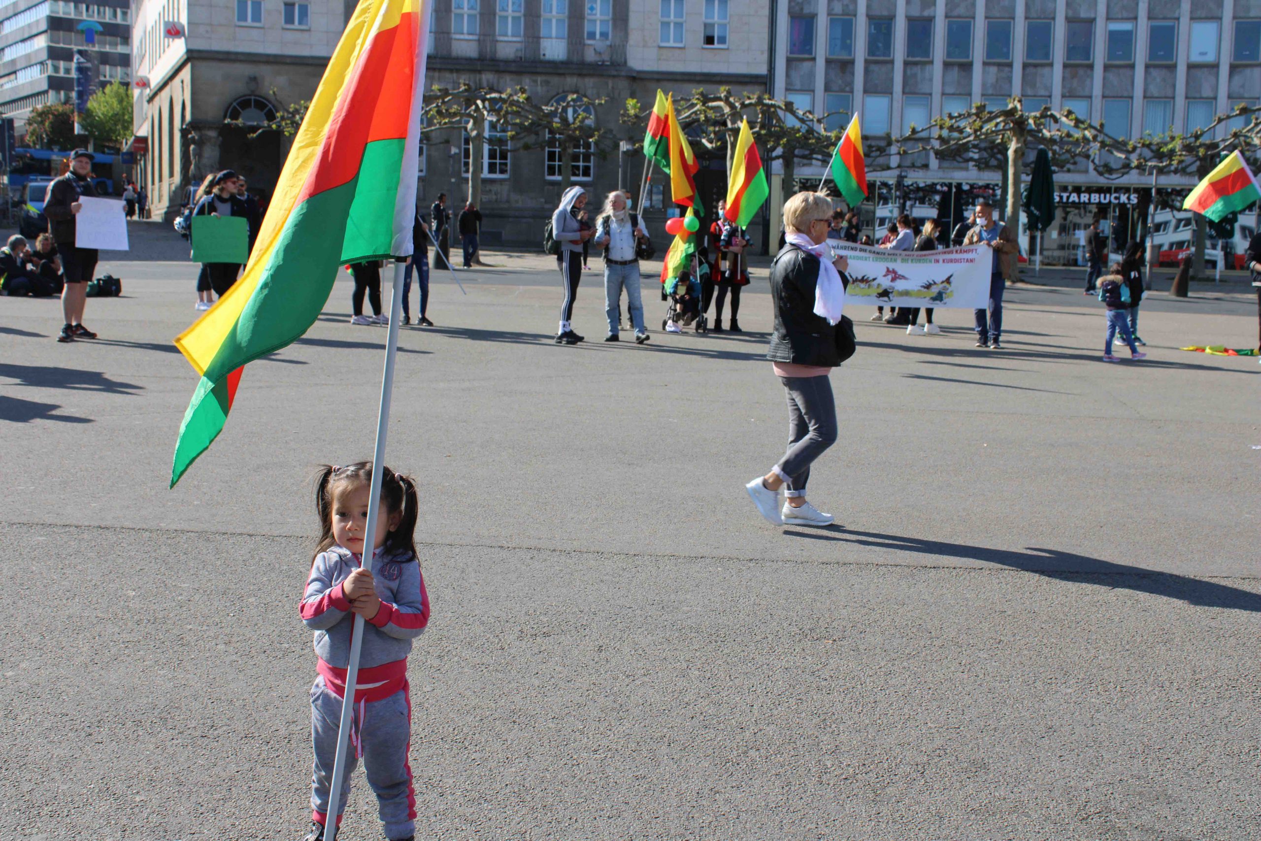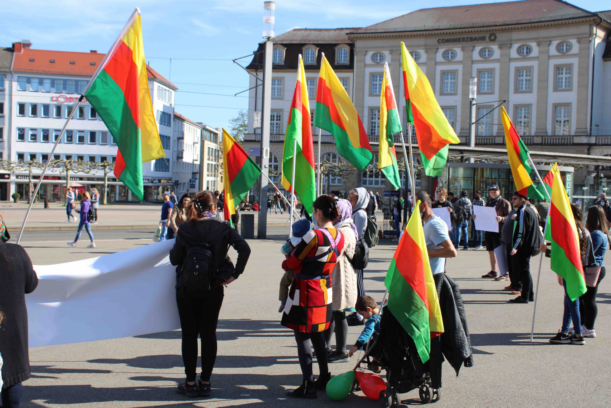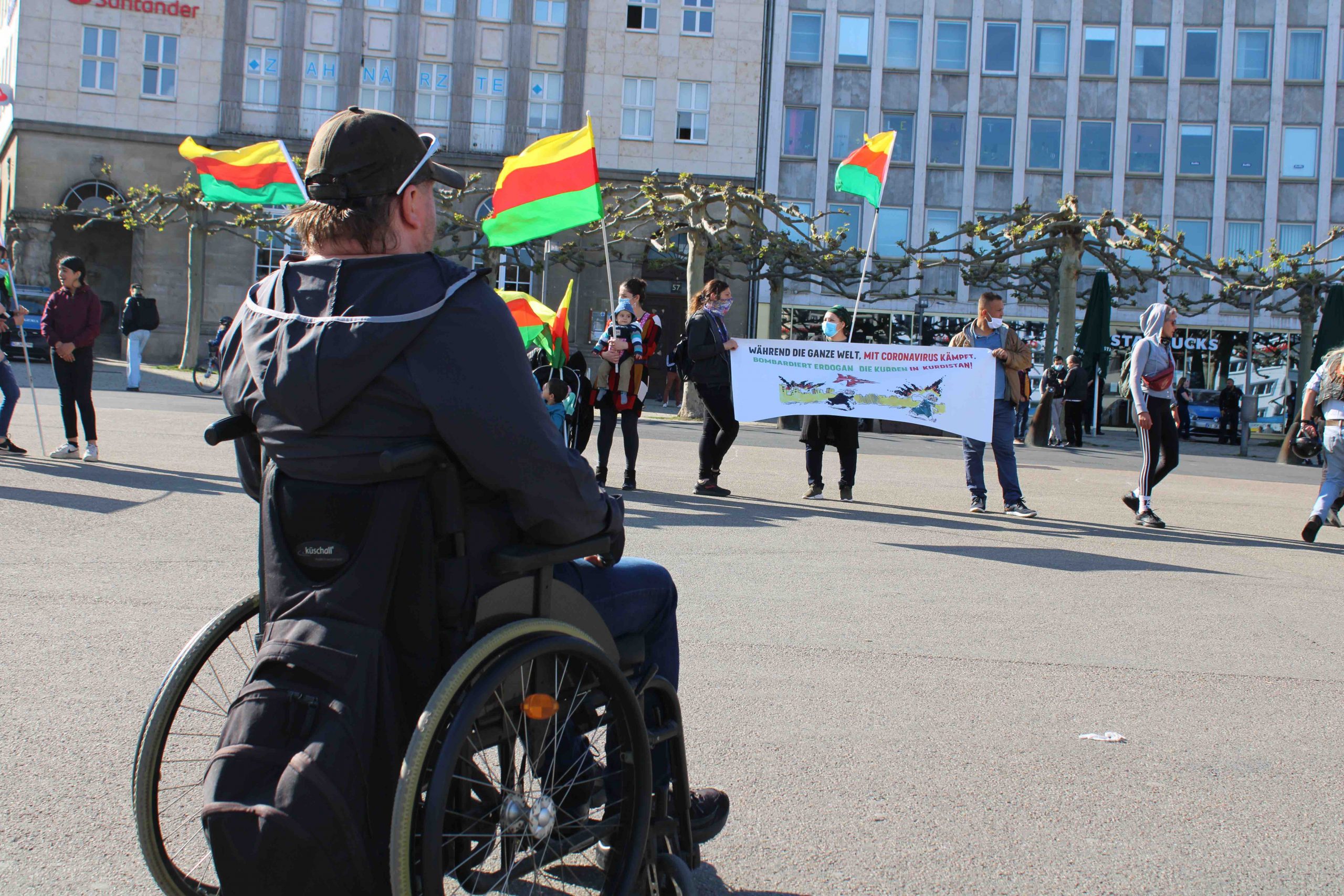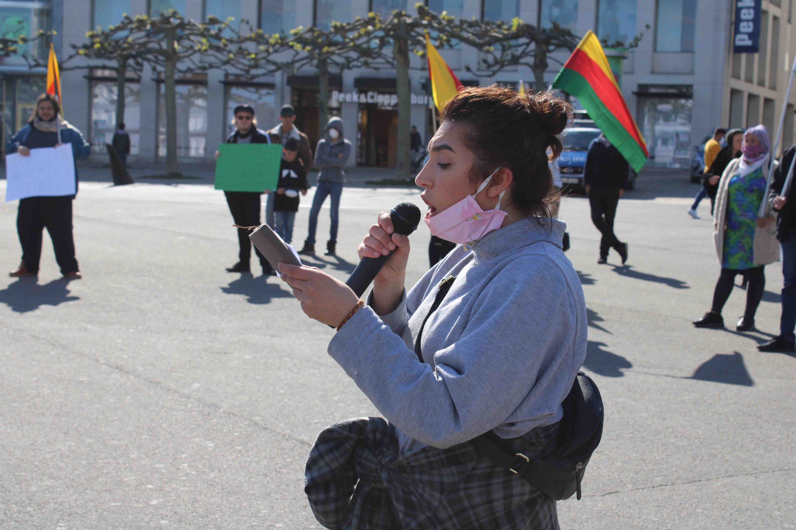 Saat 16.30’da Königplatz meydanında başlayan eylemde eylemciler TEV-DEM bayrakları ve üzerinde Almanca “Tüm dünya koronavirüsü ile savaşırken Erdoğan savaş uçaklarıyla Kürdistan’da Kürtleri bombaladı” yazan pankart açtı. Sık sık Almanca ve Kürtçe attıkları sloganlar ile Türk ve Alman devletlerinin işbirliğini de protesto eden eylemcilere çevredeki halktan da ilgi oluştu.