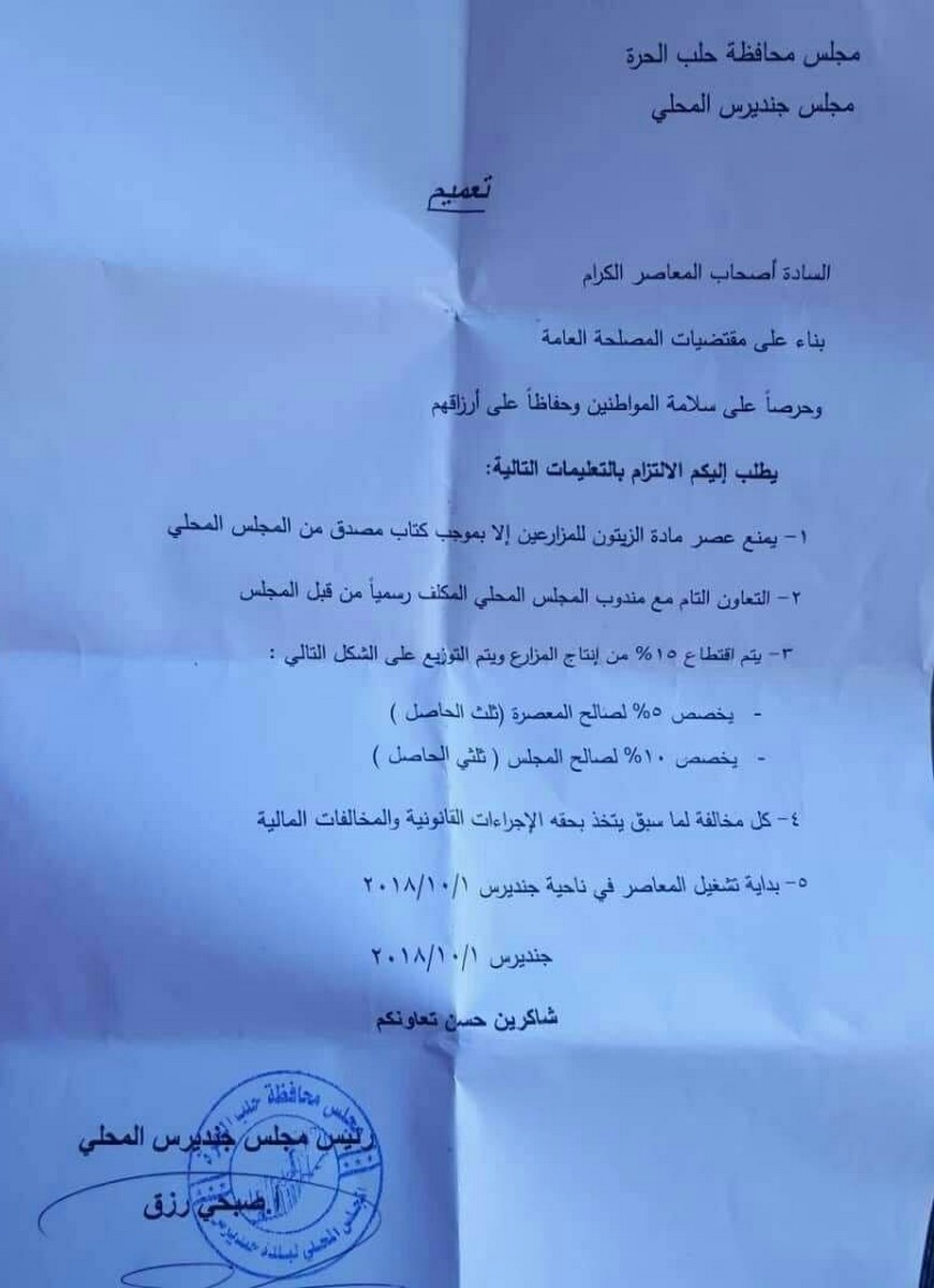 HABER MERKEZİ – Efrîn’i talan eden işgalci Türk devleti ve bağlı çete grupları, sivil halka yönelik insanlık dışı saldırılarının yanı sıra kentteki ekonomik kaynakları da kurutmak için barbarca saldırmaya devam ediyor. İşgalci Türk devleti tarafından kurulan “Cindirês yerel meclisi” kentteki zeytin üreticilerine yönelik yeni bir kararname çıkardı. Buna göre, ilçedeki zeytin üreticileri meclisin izni olmadan hiçbir üretimde bulunmayacak ve izin verilen üretimlerin ise yüzde 15’ine el konulacak.
