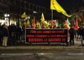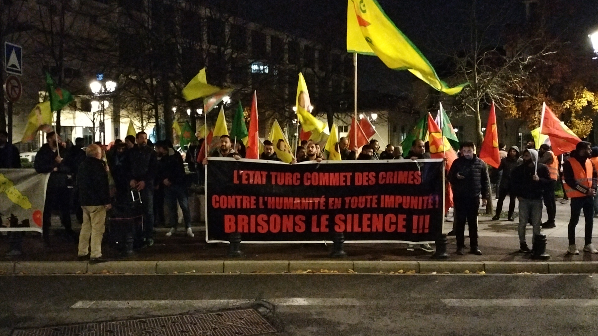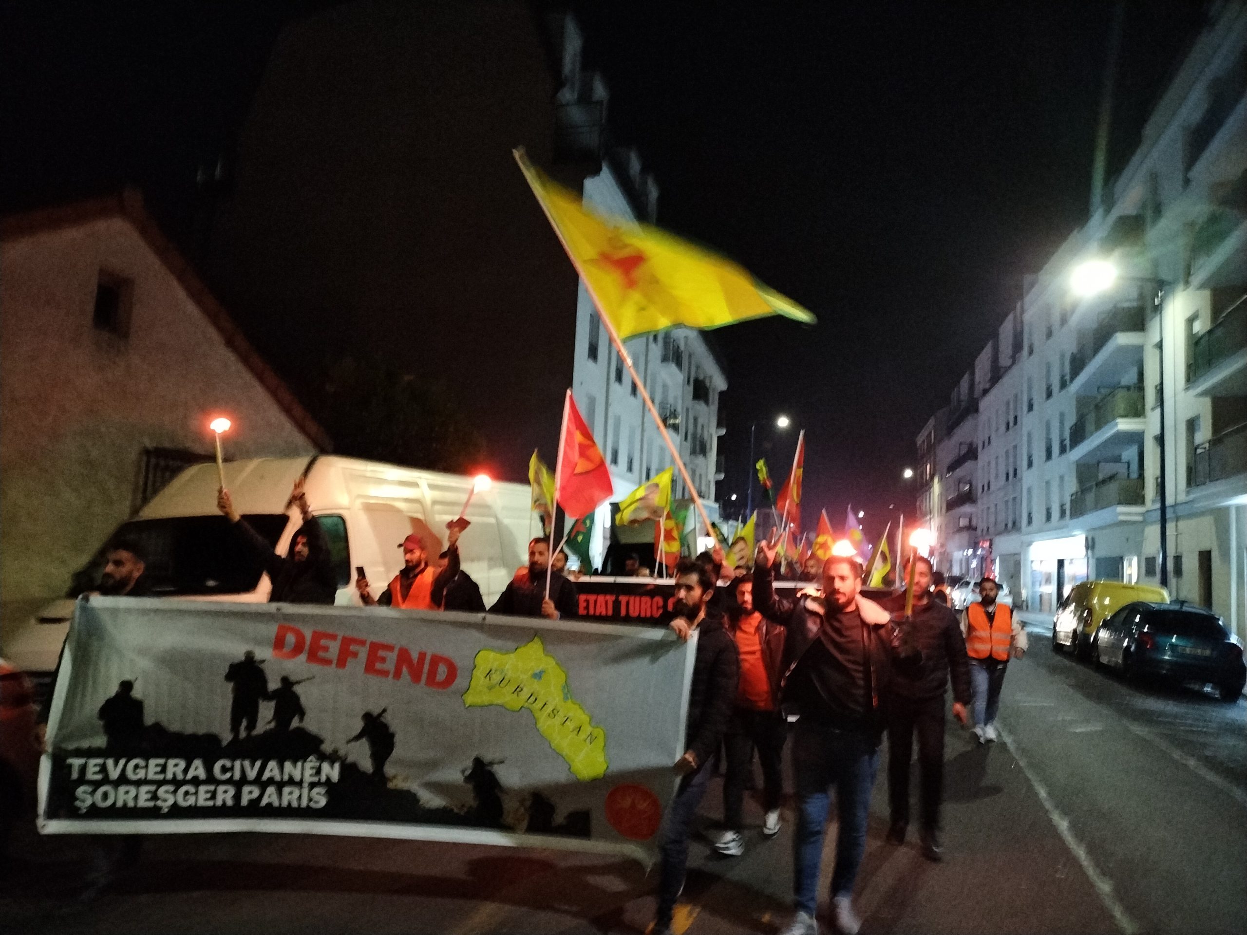 Önder Öcalan bayrakları ve Werin Cenga Azadiyê pankartı taşıyan gençler, sık sık “Assassin Erdogan (Katil Erdoğan)”, “A Bas Le Régime Fasciste En Turquie (Kahrolsun Faşist Türk Rejimi)”, “Bijî Serok APO” ve “Bijî Berxwedana Gerîla” sloganları attılar.