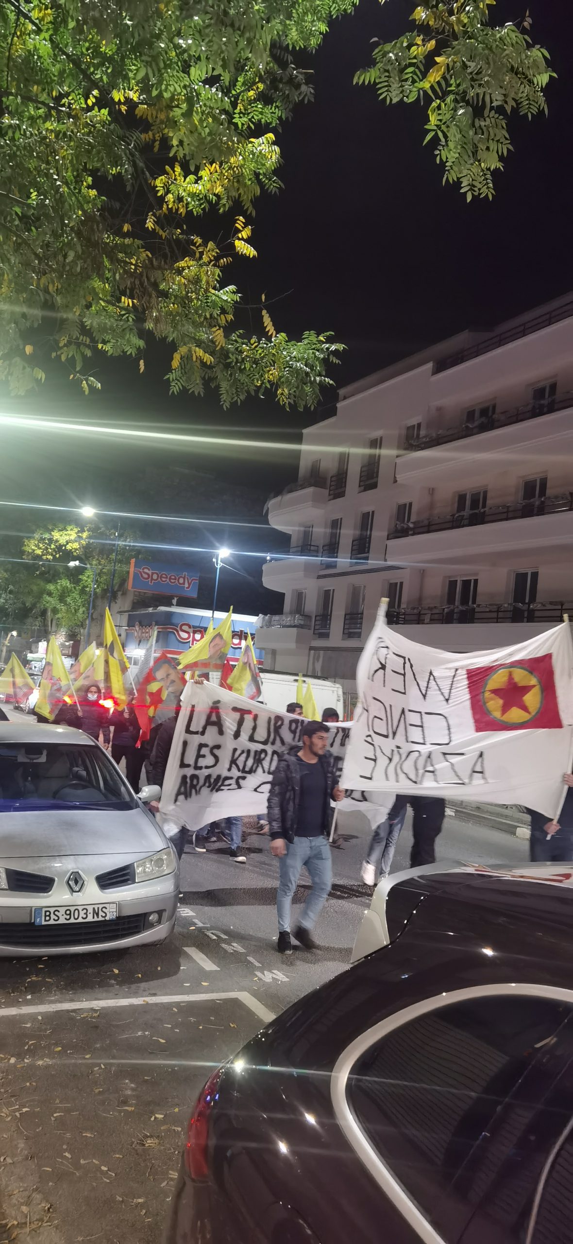 Önder Öcalan bayrakları ve Werin Cenga Azadiyê pankartı taşıyan gençler, sık sık “Assassin Erdogan (Katil Erdoğan)”, “A Bas Le Régime Fasciste En Turquie (Kahrolsun Faşist Türk Rejimi)”, “Bijî Serok APO” ve “Bijî Berxwedana Gerîla” sloganları attılar.