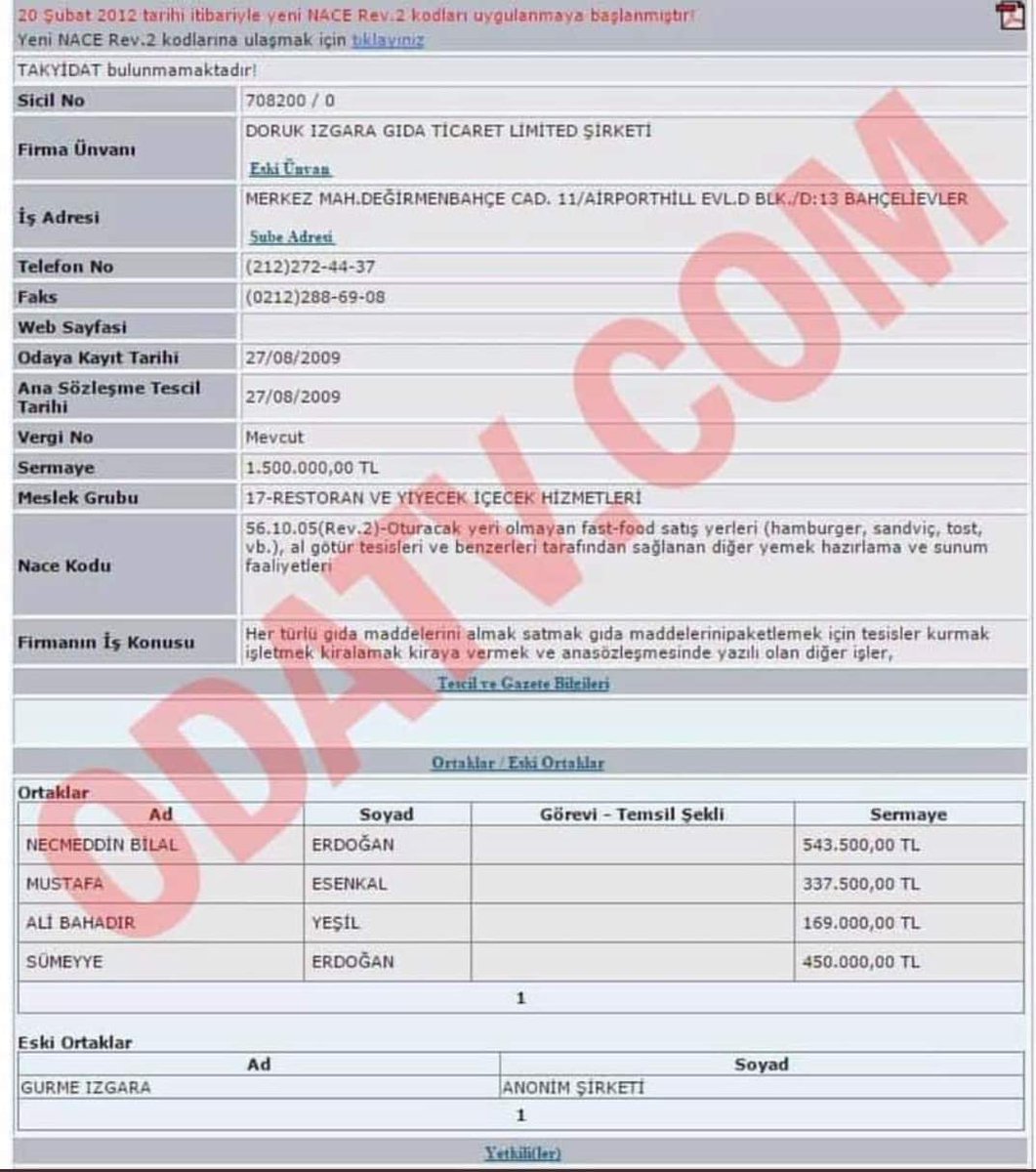 Ticaret Sicil Gazetesi’ne göre sermayesi 1,5 milyon TL olan Doruk Izgara’da Mustafa Esenkal’ın 337 bin 500 TL, Ali Bahadır Yeşil’in de 169 bin TL değerinde hissesi var. Daha fazla pay sahibi iki ortak ise 543 bin TL’lik hissesi ile Bilal Erdoğan ile 450 bin TL’lik hissesi ile kardeşi Sümeyye Erdoğan.