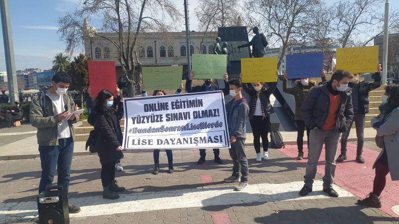 Covid-19 pandemisinin başından beri lise öğrencilerinin yaşadığı sorunlara dikkat çekmek için Kadıköy'de eylem yapan İstanbul Lise Dayanışması, "Online eğitimin yüzyüze sınavı olmaz" dedi.