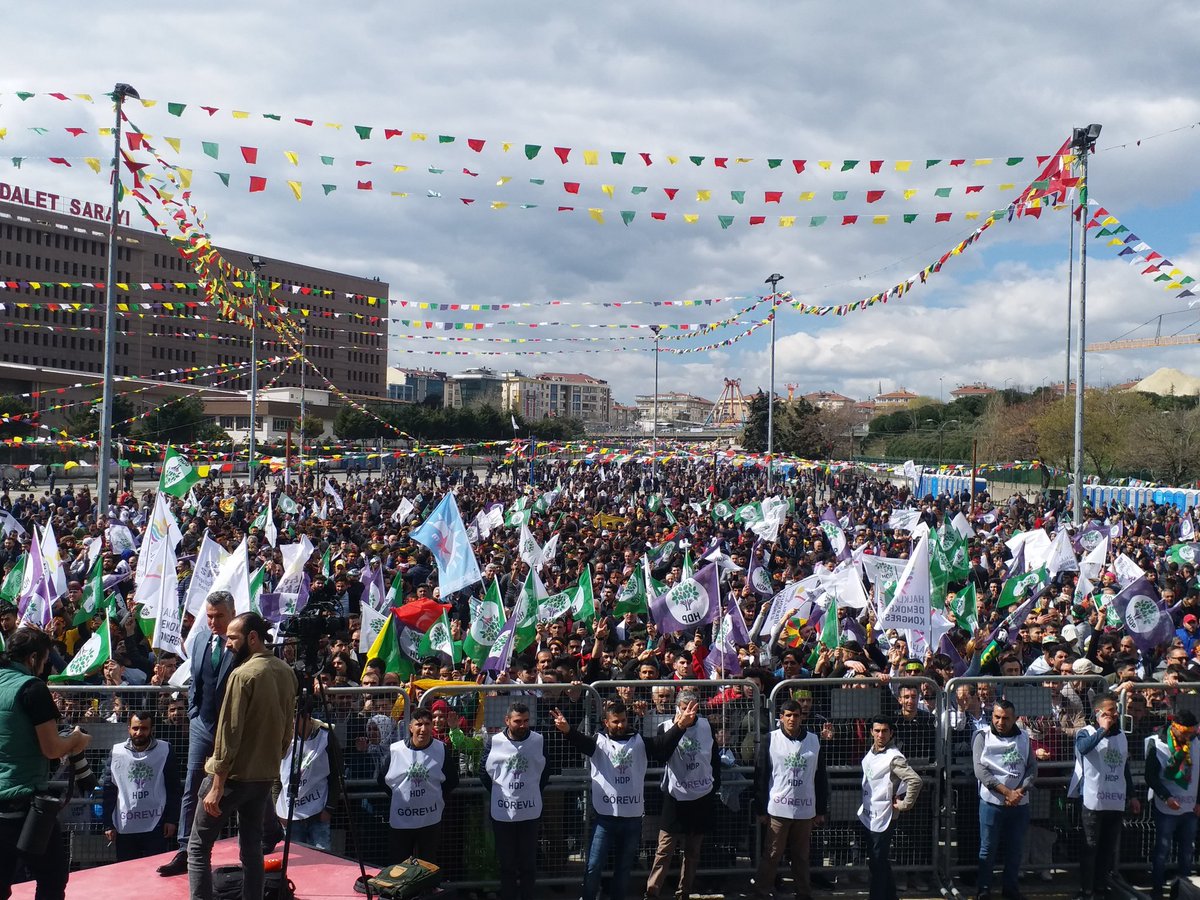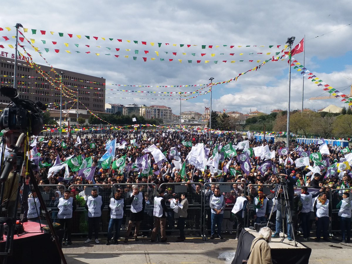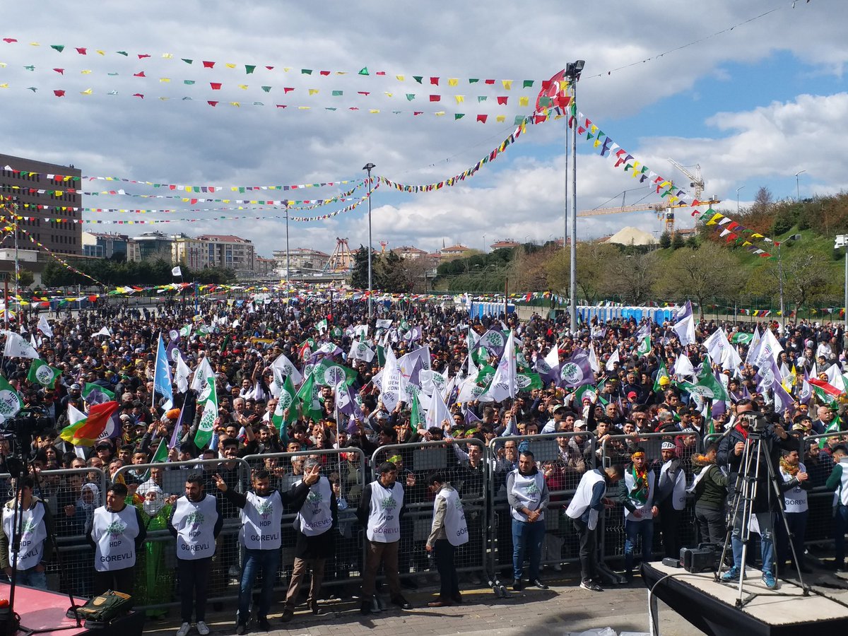 Sahnenin kurulduğu platforma, “Newroz pîroz be” pankartı asılırken, alan çok sayıda sarı kırmızı yeşil bayraklarla süslendi. Çalan davul zurnalar eşliğinde yurttaşlar ilk dakikalardan itibaren halaya durdu. Alandan sık sık “Bijî Serok Apo” sloganları yükseliyor.