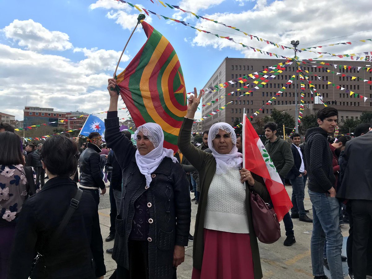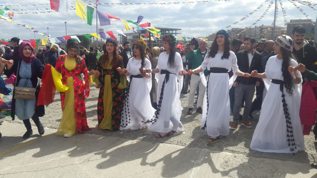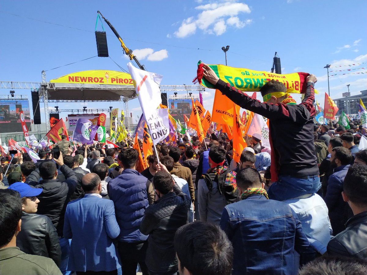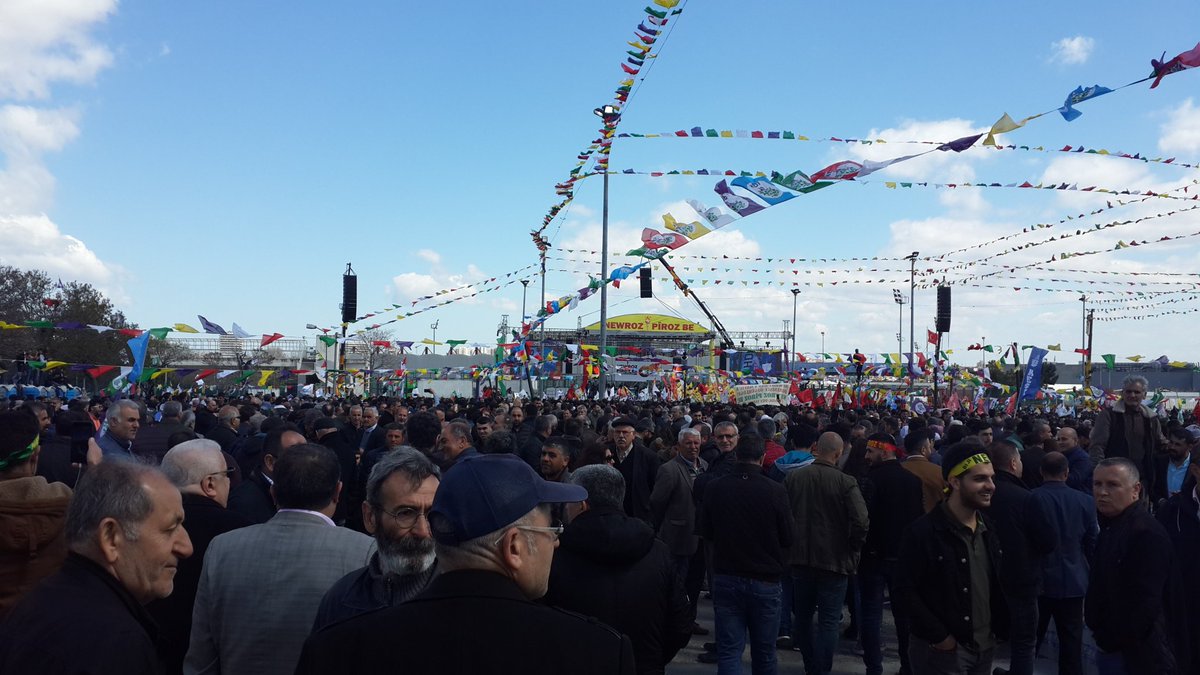 Platforma “Newroz Pîroz Be”, “Ülkede demokrasi, Ortadoğu’da barış”, “Şimdi devrim zamanı” pankartları asıldı. Çok sayıda sivil toplum kuruluşu, siyasi parti ve kadın örgütün kendi renkleriyle alanda yer aldı. Kitle, alanda çalan Newroz ezgileriyle halaylar çekiyor.