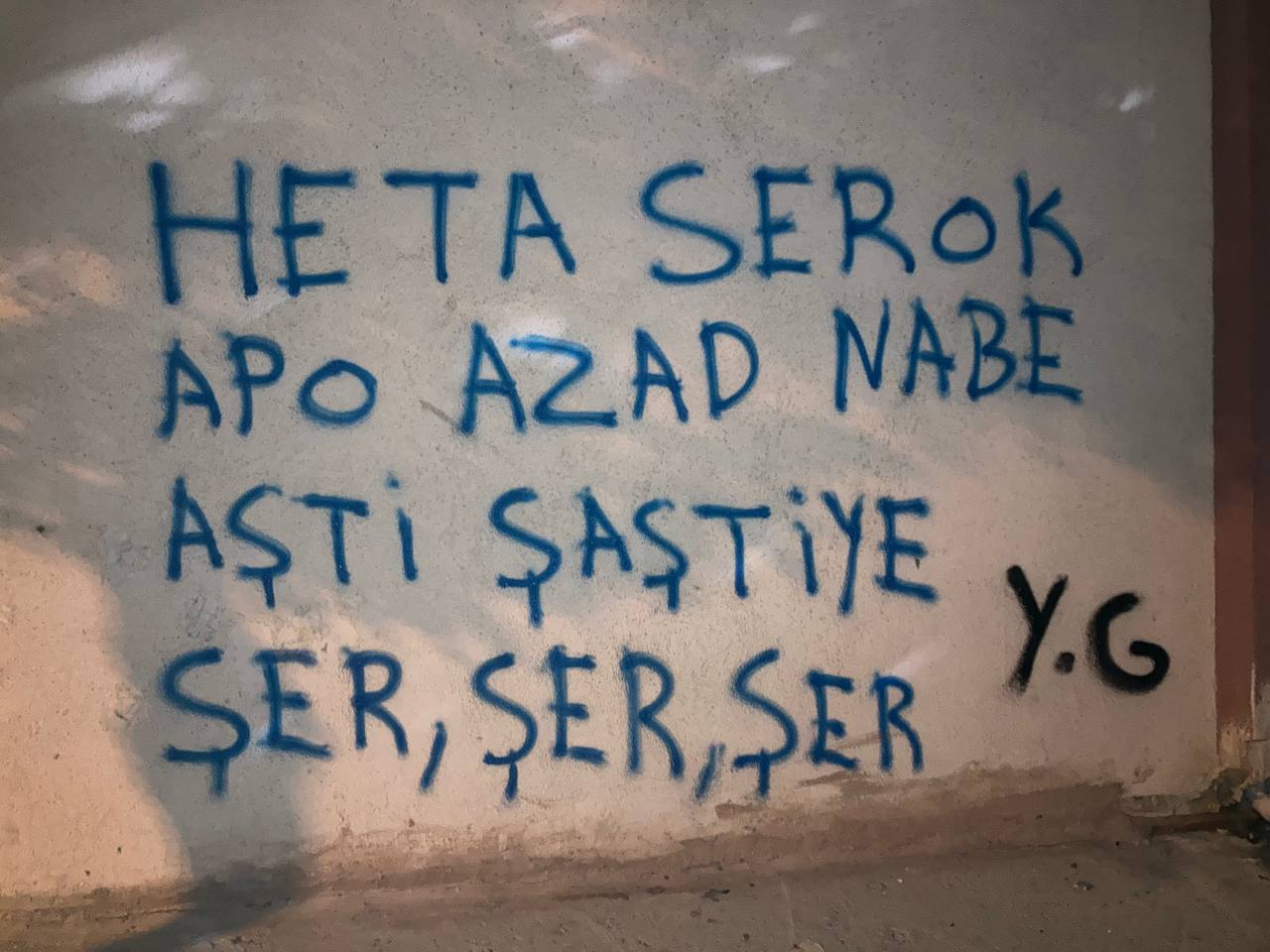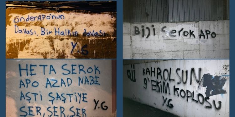 Gençler tarafından duvarlara: “Önder Apo’nun Davası Bir Halkın Davasıdır” “Kahrolsun 9 Ekim Komplosu” “Heta Serok Azad Nebe Aşitî Şaşiti Ye” ve “Bijî Serok Apo” yazıldı.
