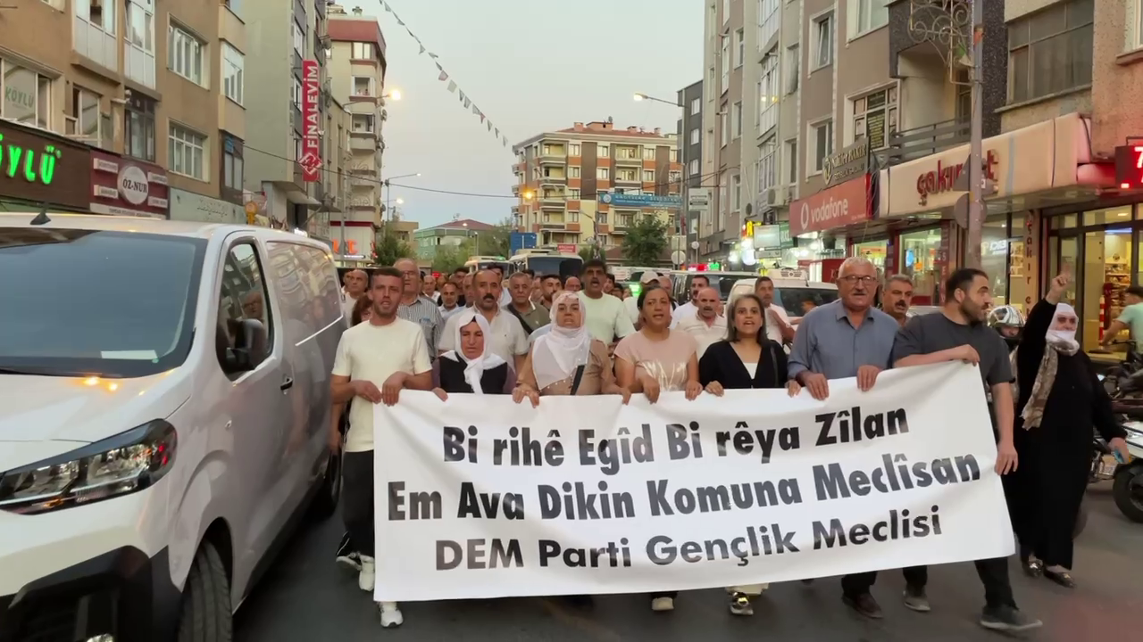 DEM Parti Bağcılar İlçe Örgütü binası önünde bir araya gelen kitle, “Bi Rihê Egîd bi rêya Zîlan Em Komuna Meclîsan Ava Dikin” pankartı açarak yürüyüşe geçti.