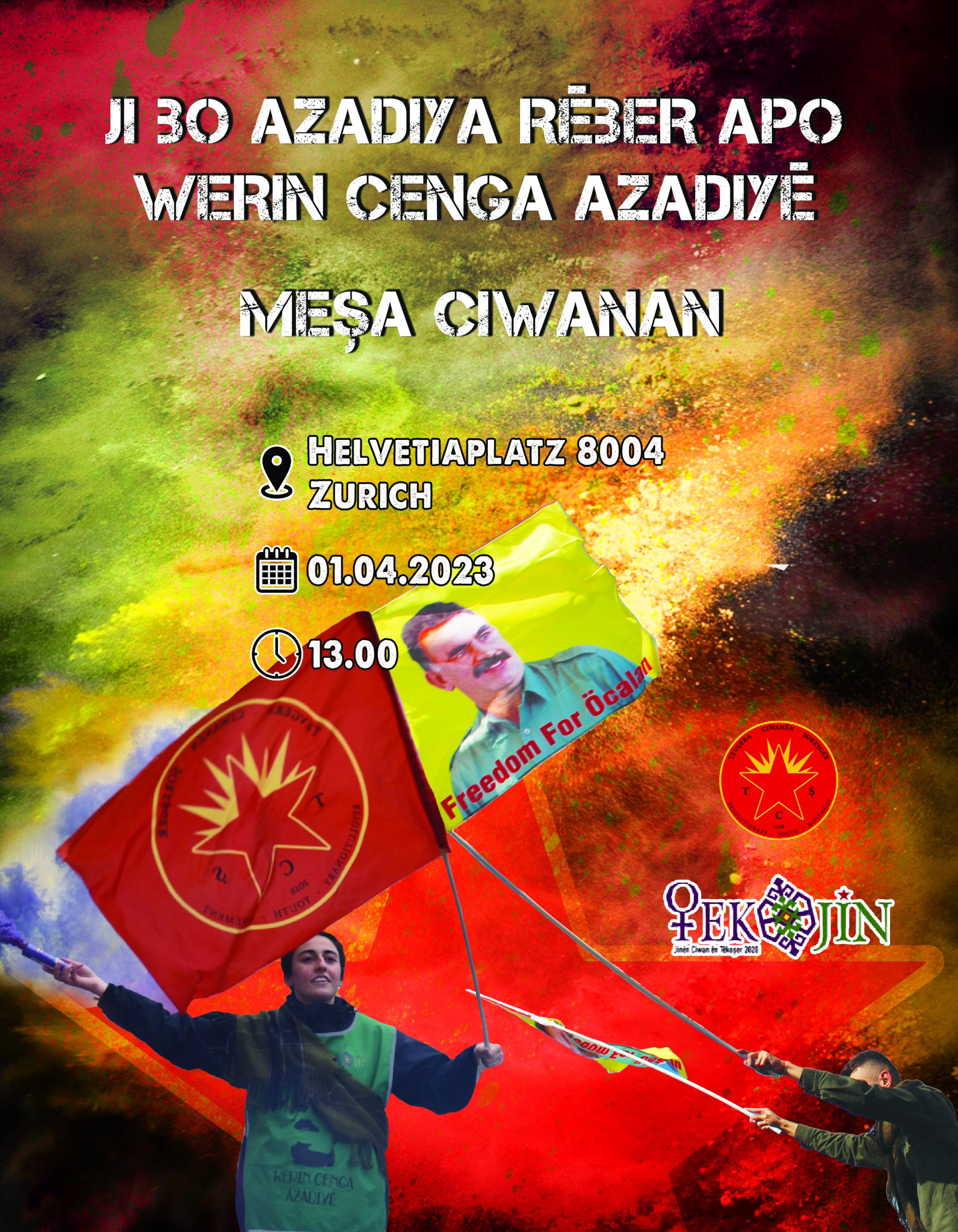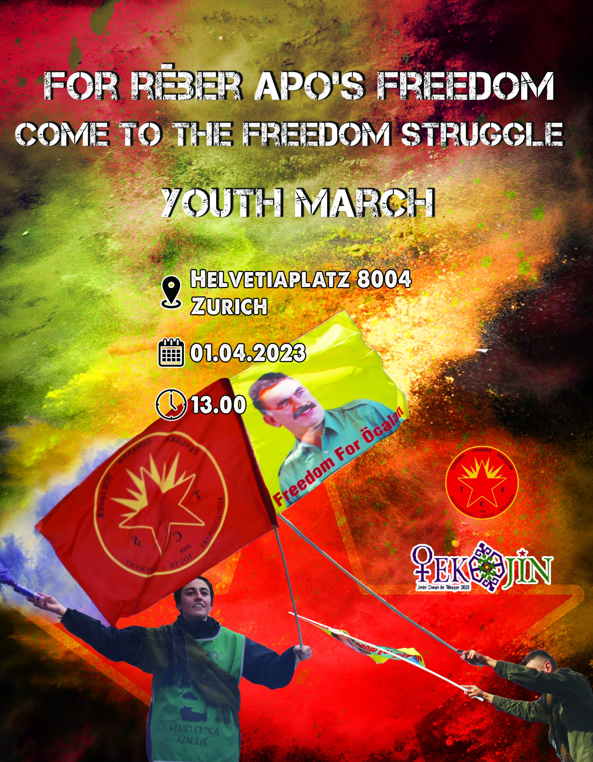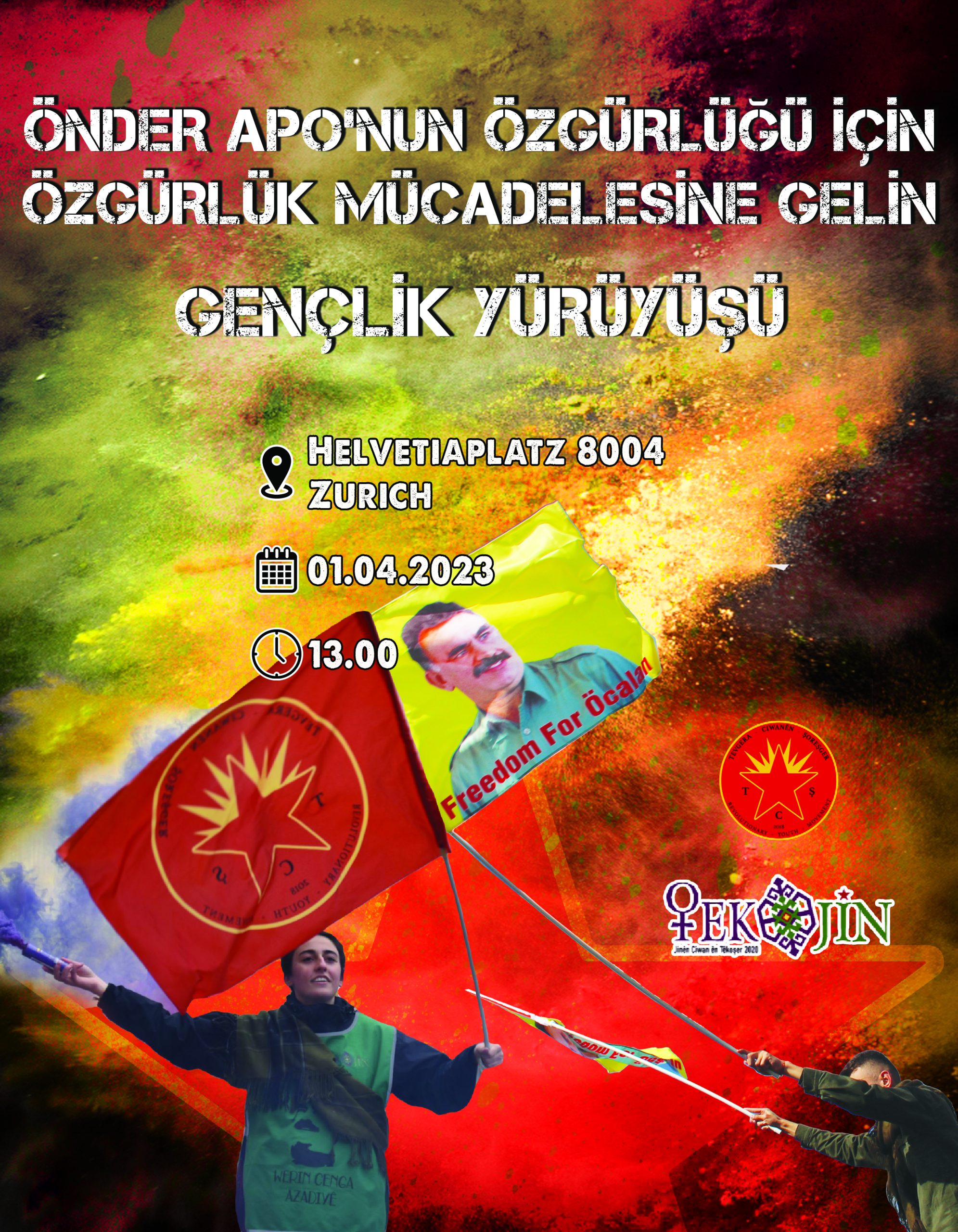 ZÜRİH – Avrupa Devrimci Gençlik Hareketleri TCŞ (Tevgera Ciwanên Şoreşger) ve TekoJIN (Jinên Ciwan ên Têkoşer), Önder APO’nun fiziki özgürlüğünün sağlanması için İsviçre’nin Zürih kantonunda Werin Cenga Azadiyê (Özgürlük Mücadelesine Gelin) hamlesi kapsamında bir yürüyüş düzenleyeceğini yazılı bir açıklama ile duyurdu.