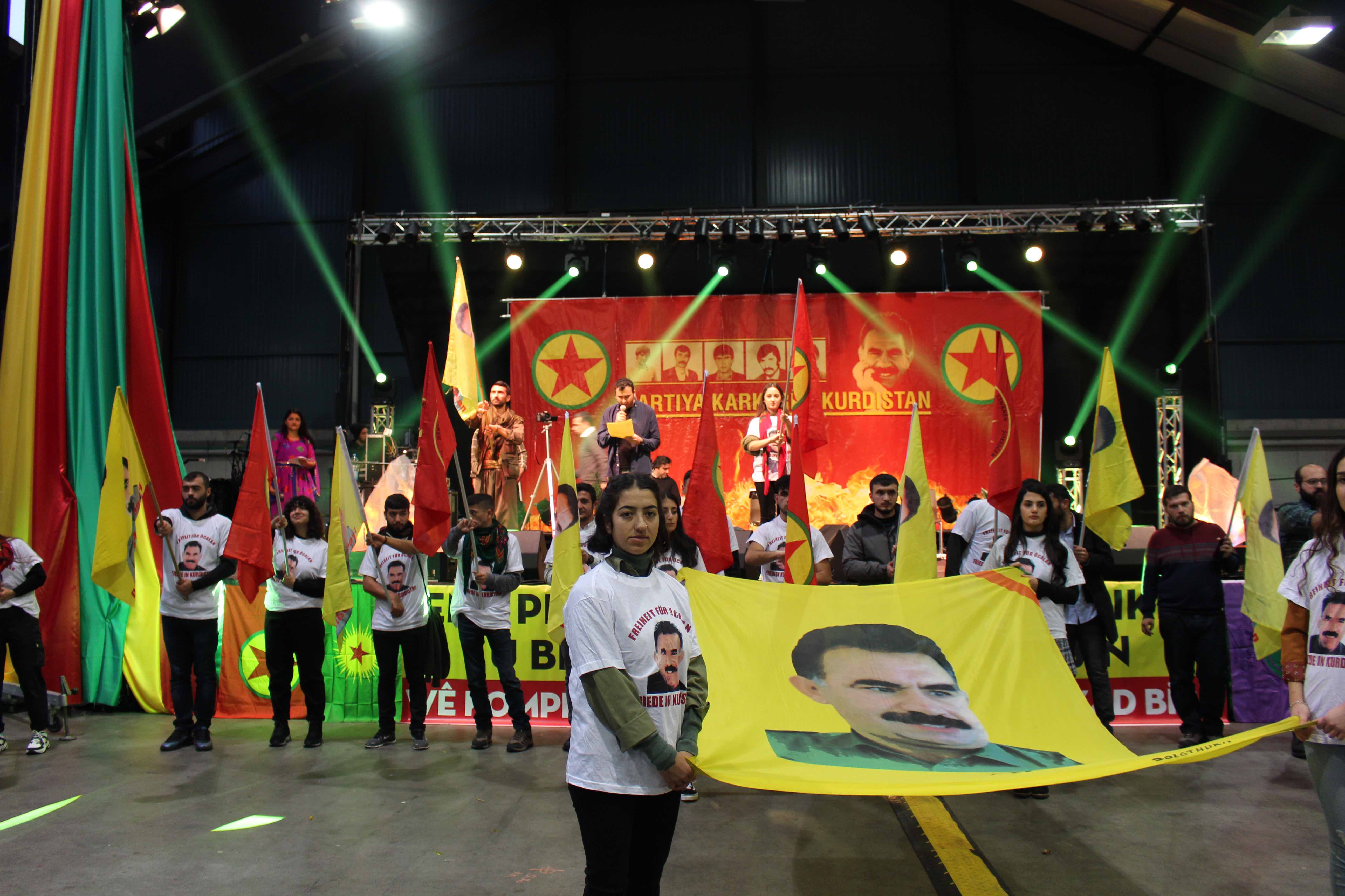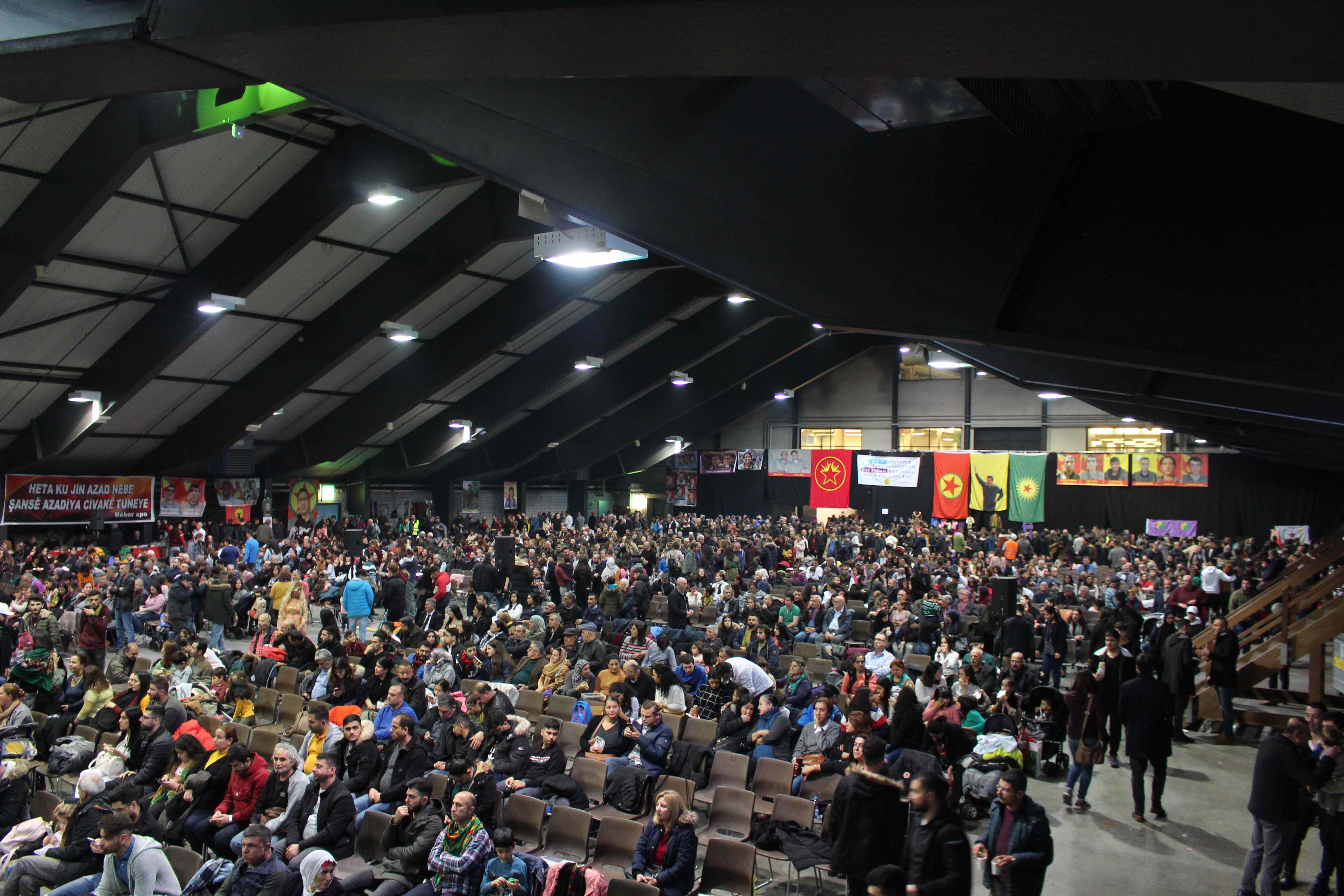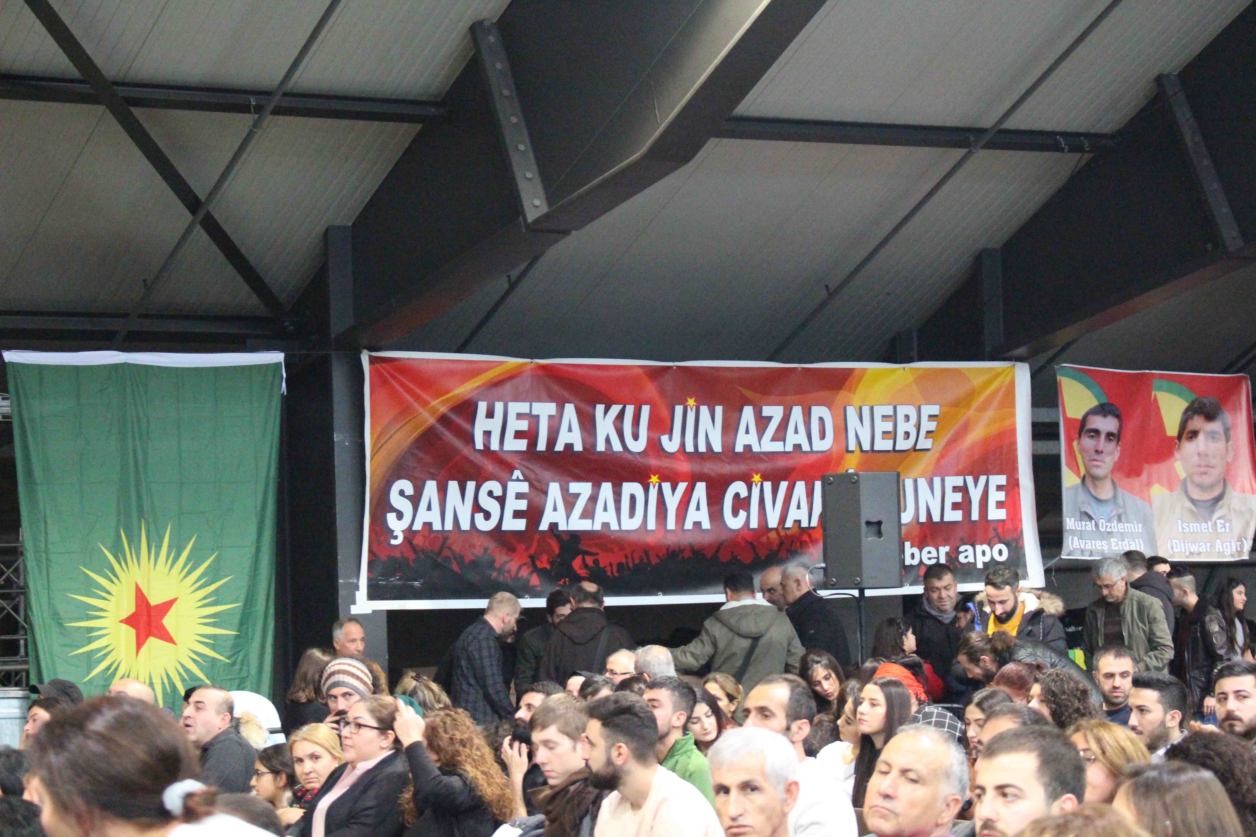 İsviçre’nin bütün kentlerinden gelerek salonu dolduran binlerce Kürdistanlı ve enternasyonalist, gün boyunca sık sık “Bijî Serok APO”, “PKK halktır, halk burada”, “Bijî Berxwedana Rojava” sloganları attı.