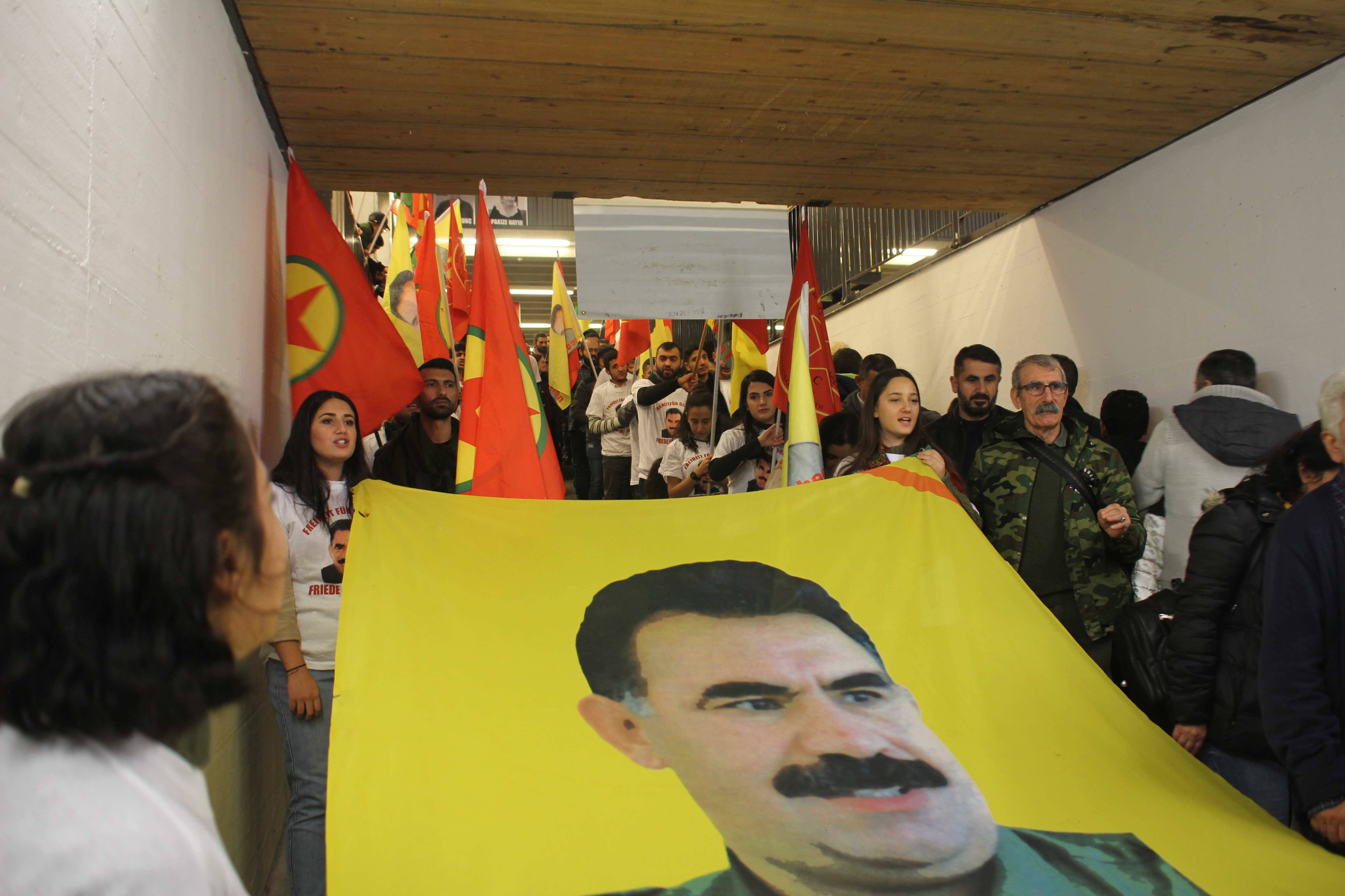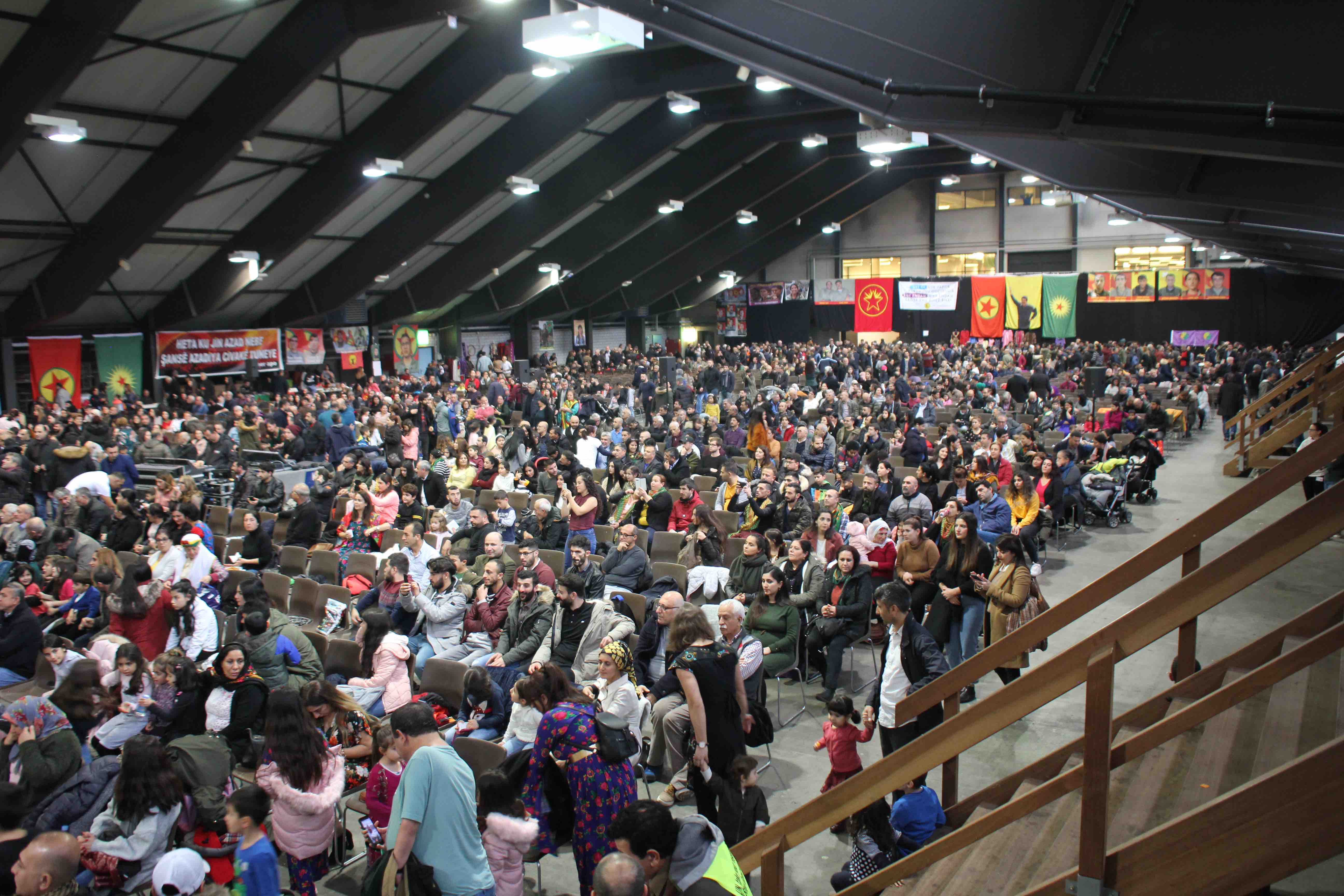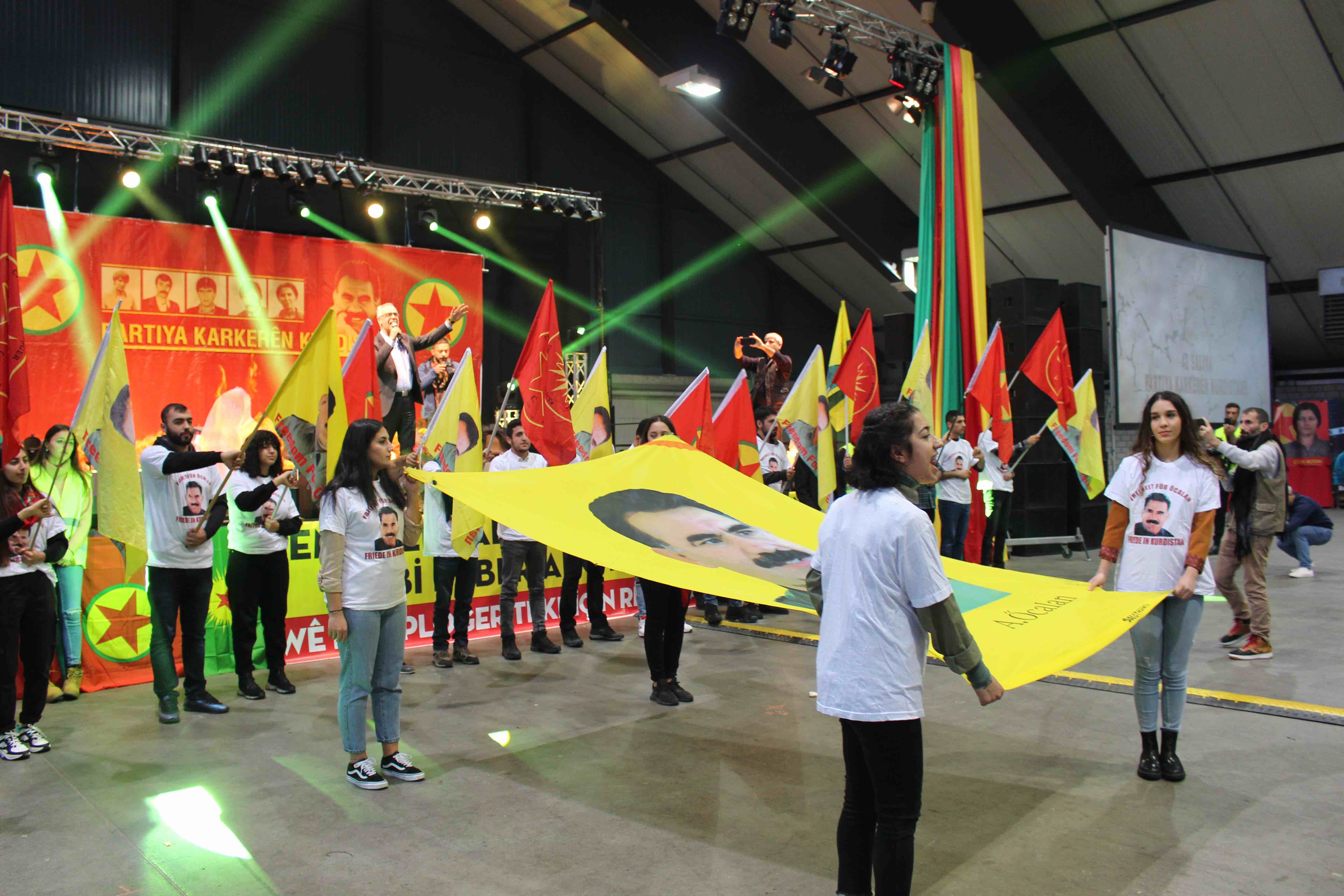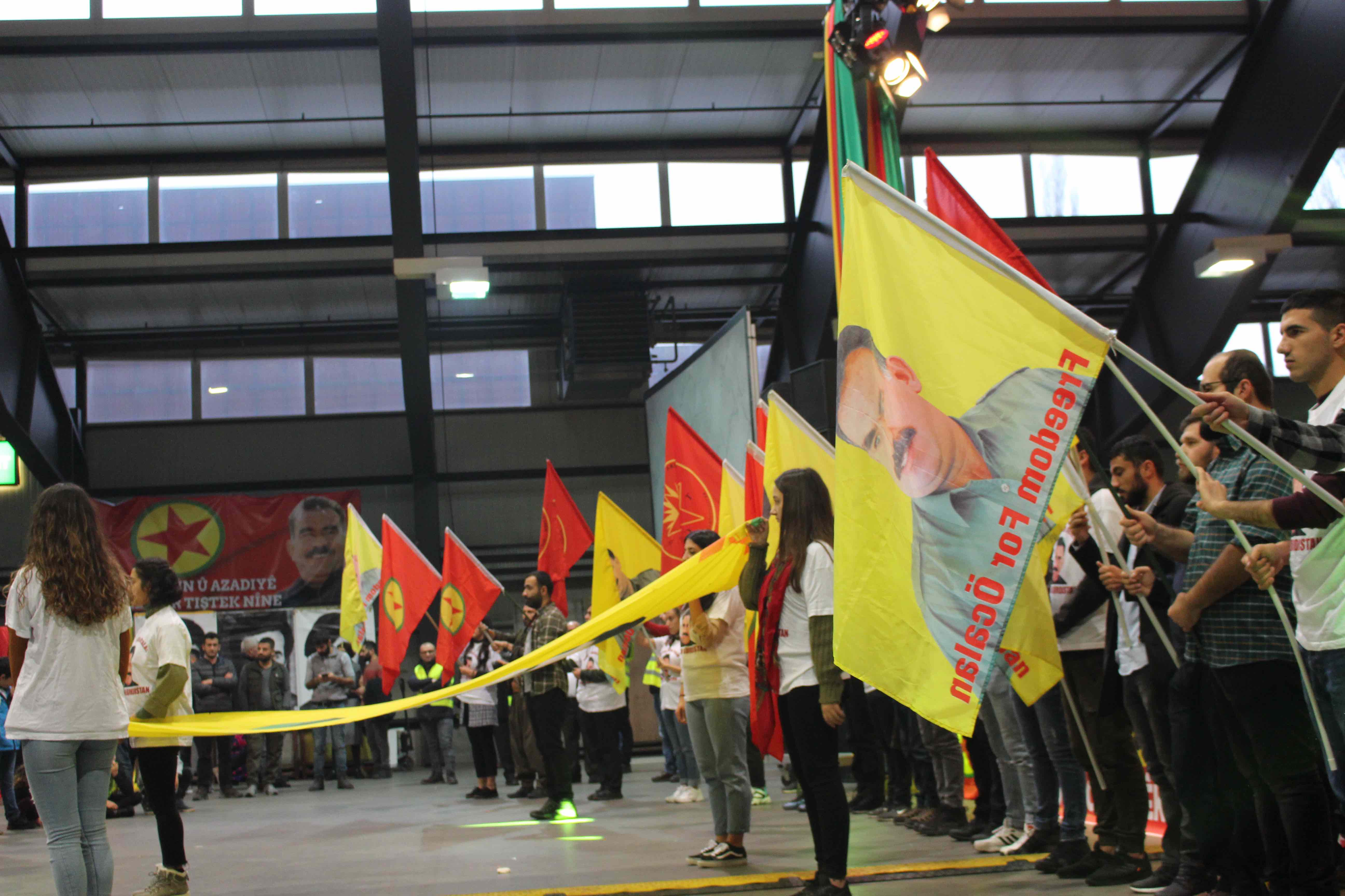 İsviçre’nin bütün kentlerinden gelerek salonu dolduran binlerce Kürdistanlı ve enternasyonalist, gün boyunca sık sık “Bijî Serok APO”, “PKK halktır, halk burada”, “Bijî Berxwedana Rojava” sloganları attı.