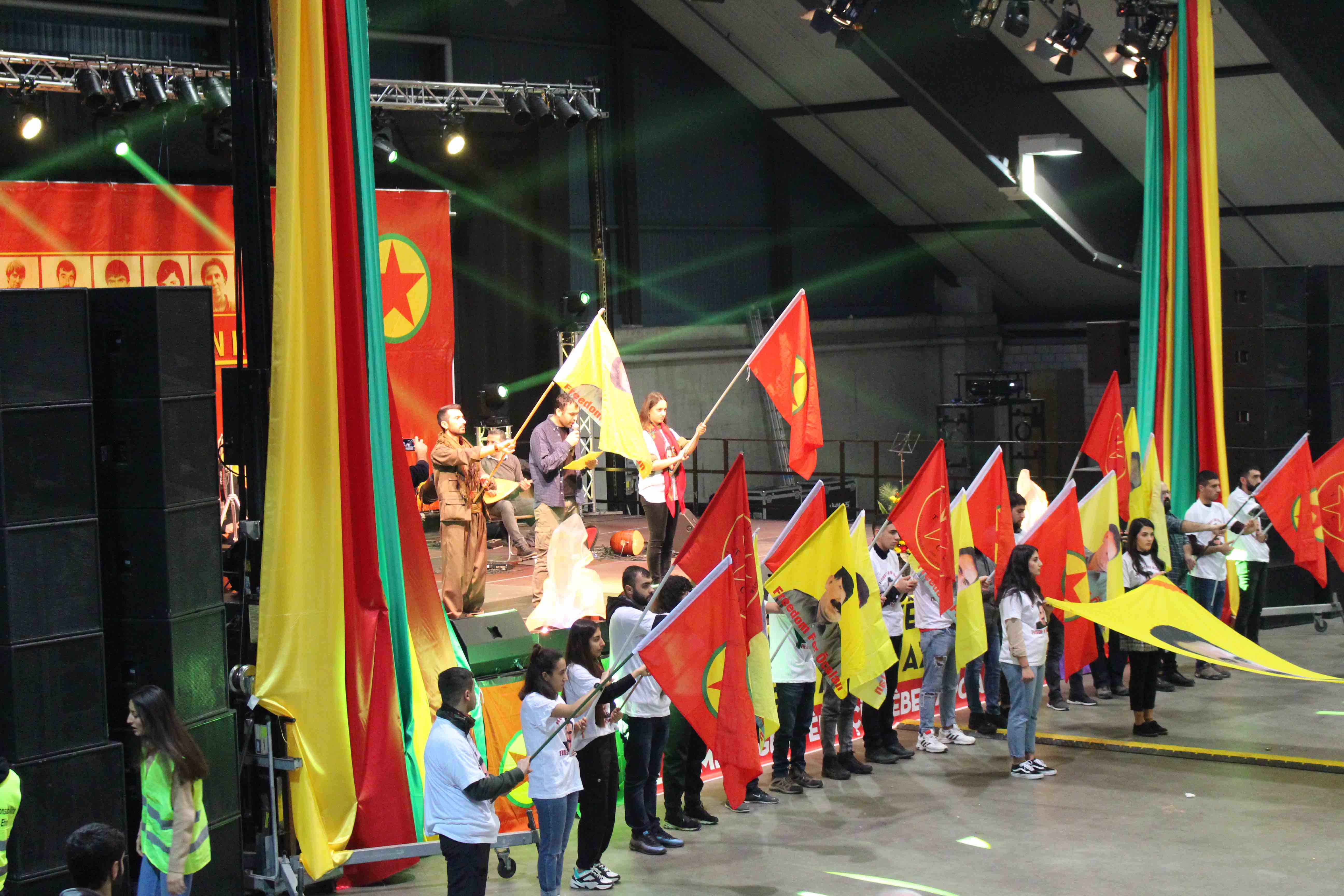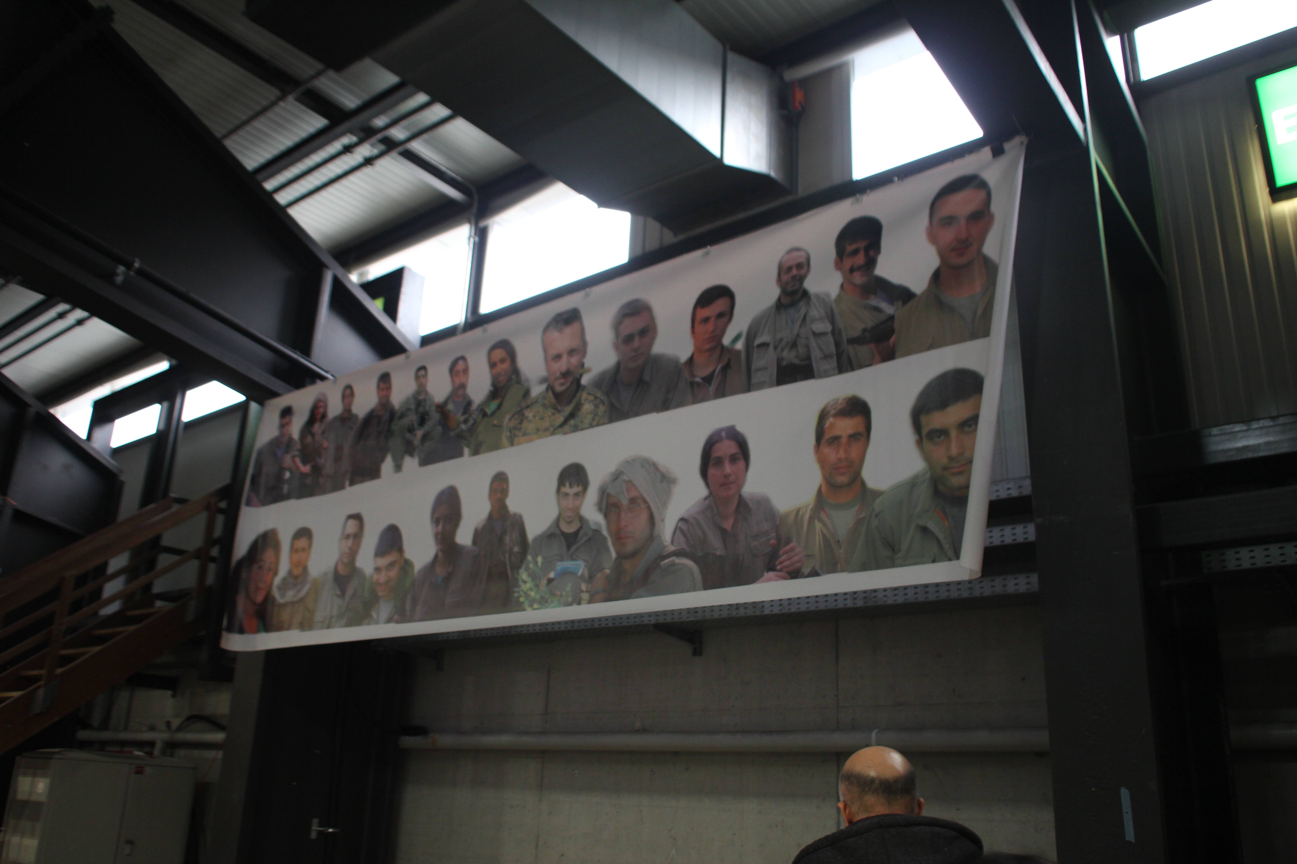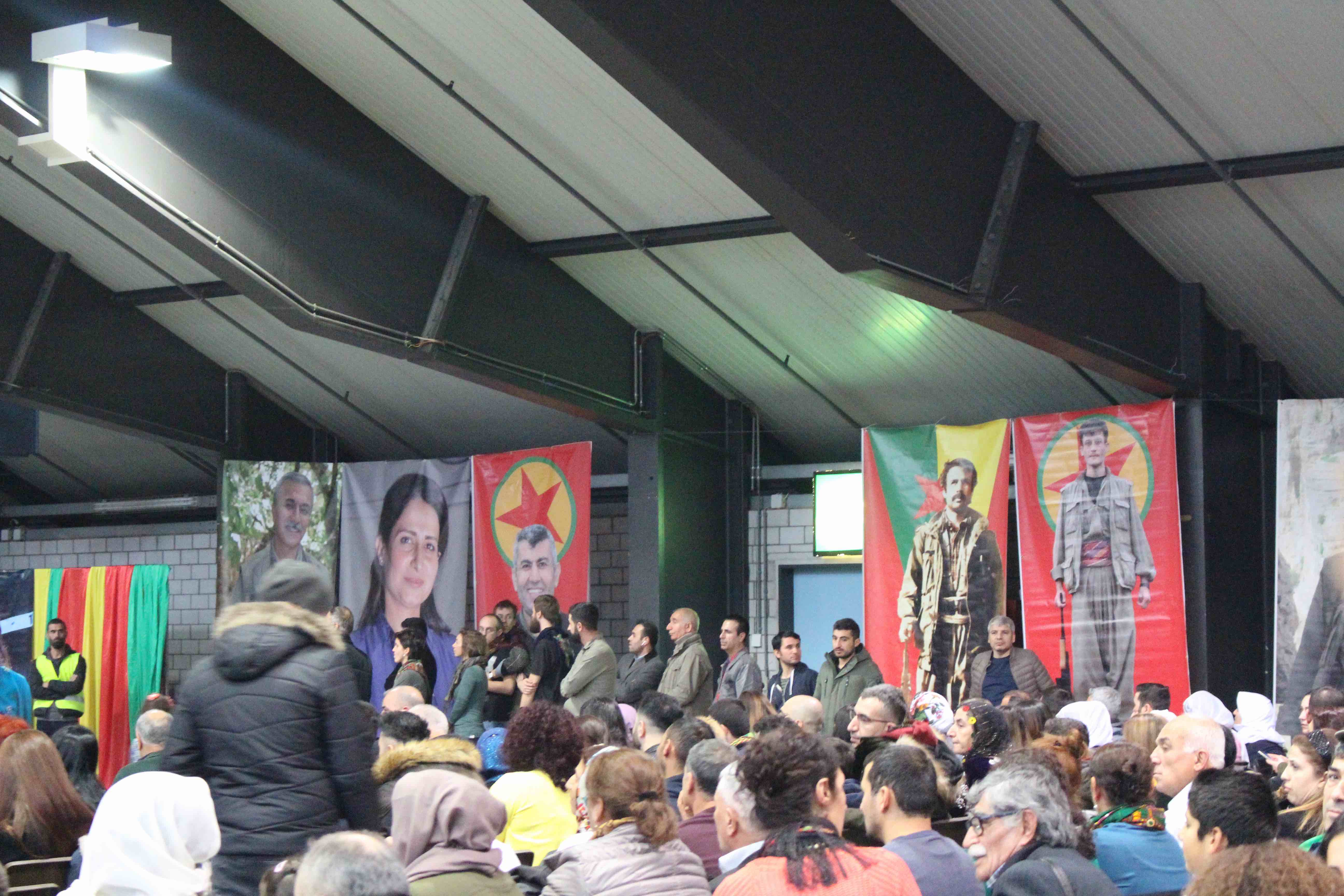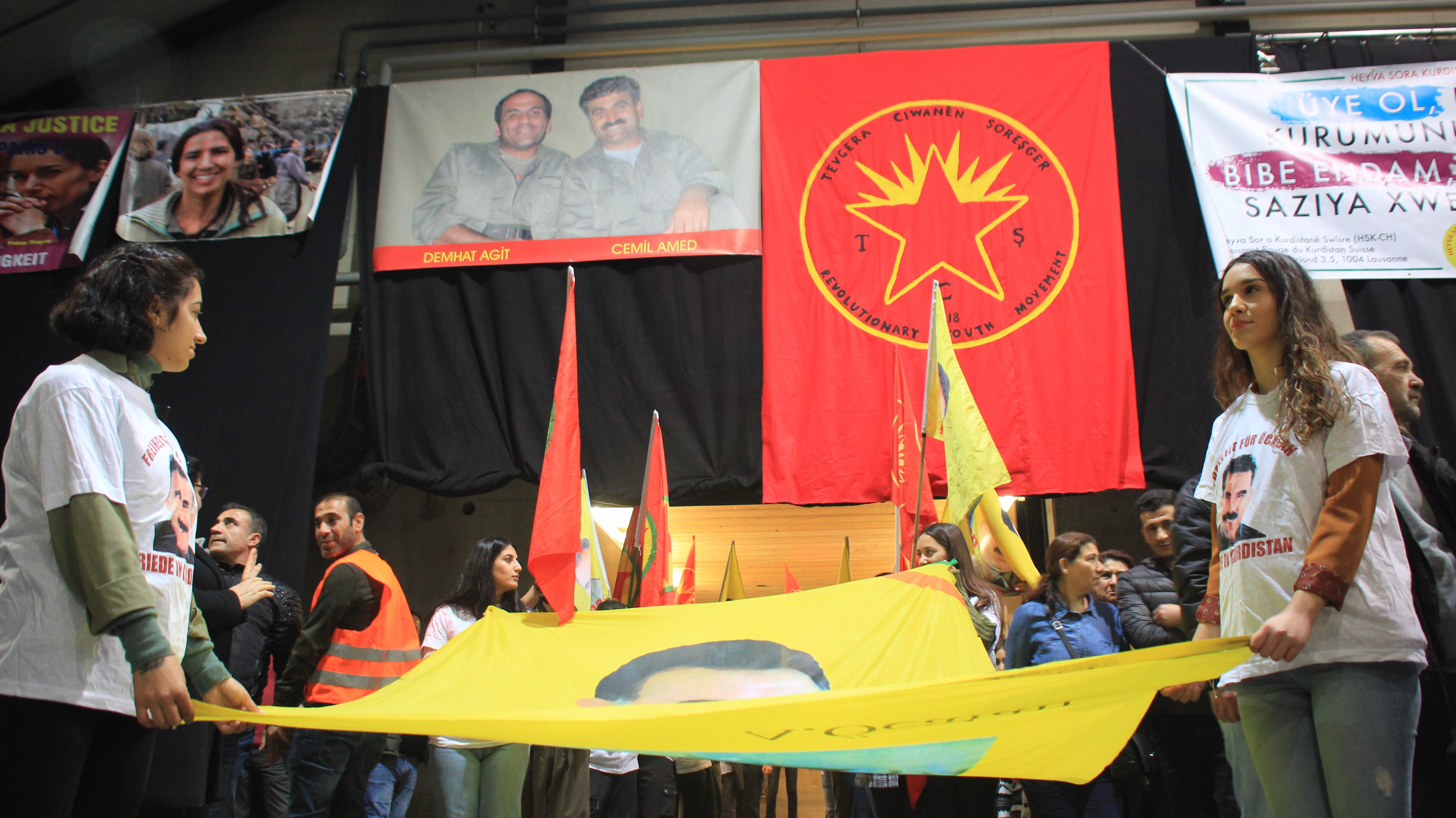 Etkinliğin düzenlendiği Luzern Spor Salonu, Halklar Önderi Abdullah Öcalan, PKK’nin öncü kadroları ve özgürlük mücadelesinde şehit düşen savaşçıların posterlerinin yanı sıra PKK, KCK, YPG, YPJ ve TCŞ bayrakları ile süslendi.