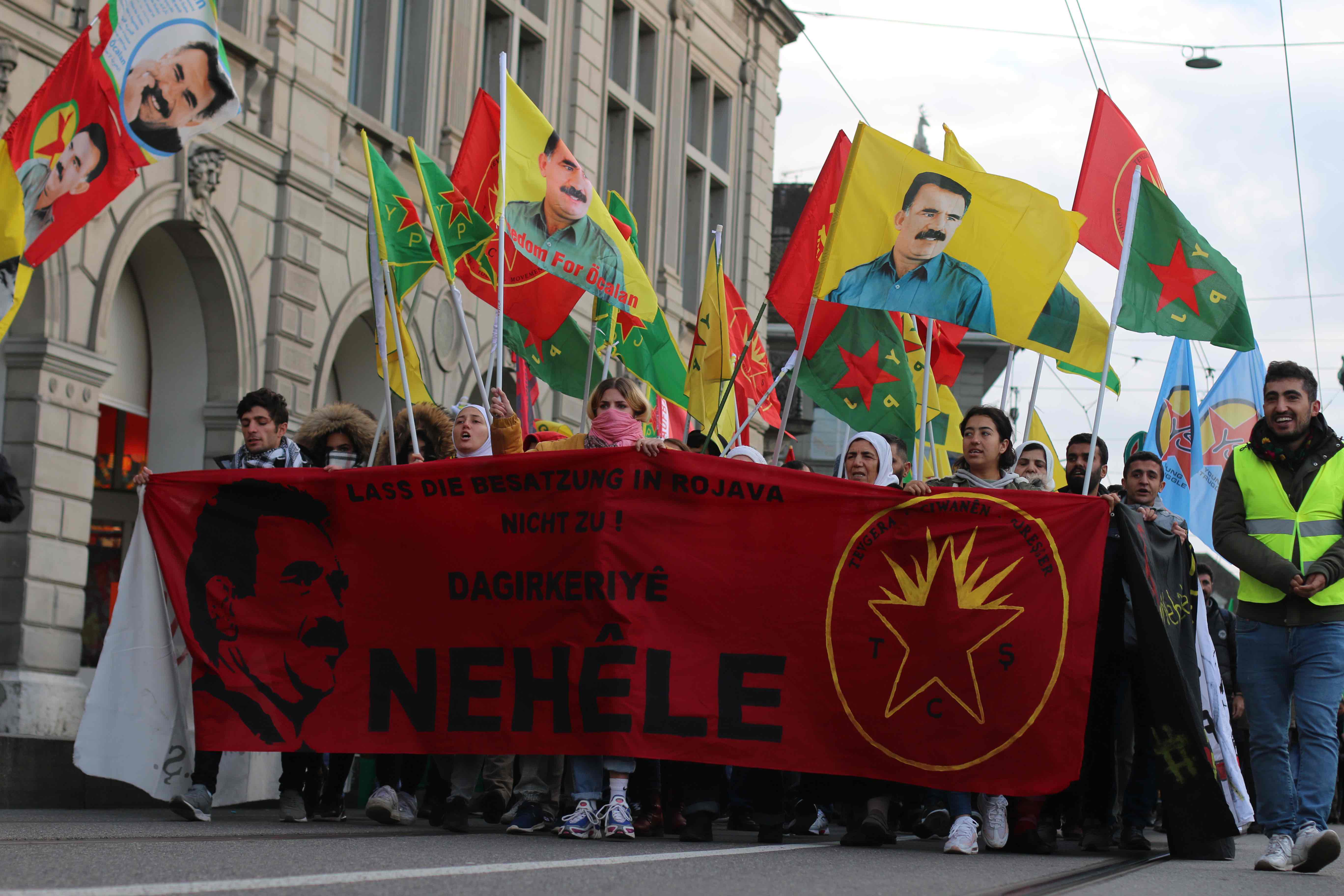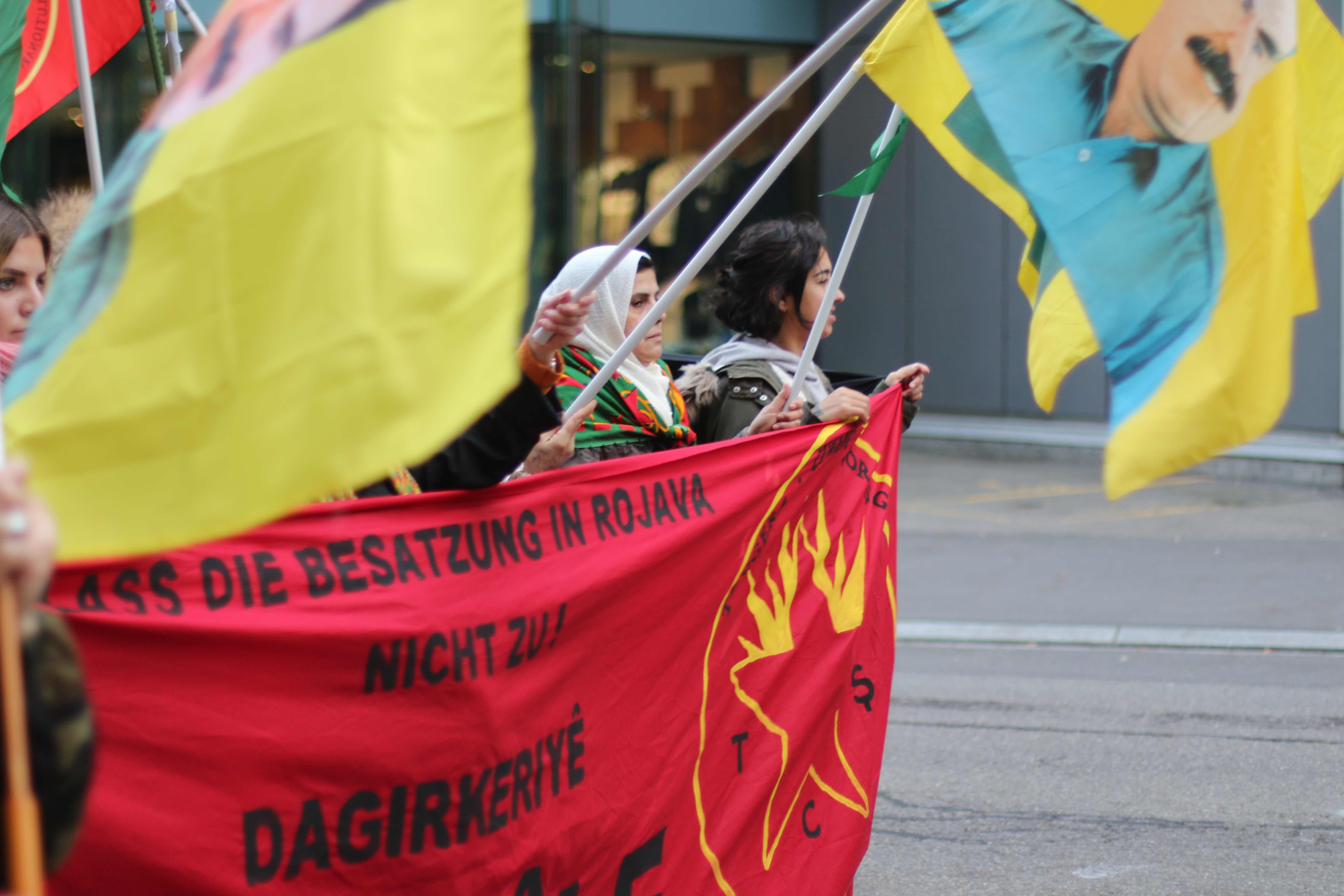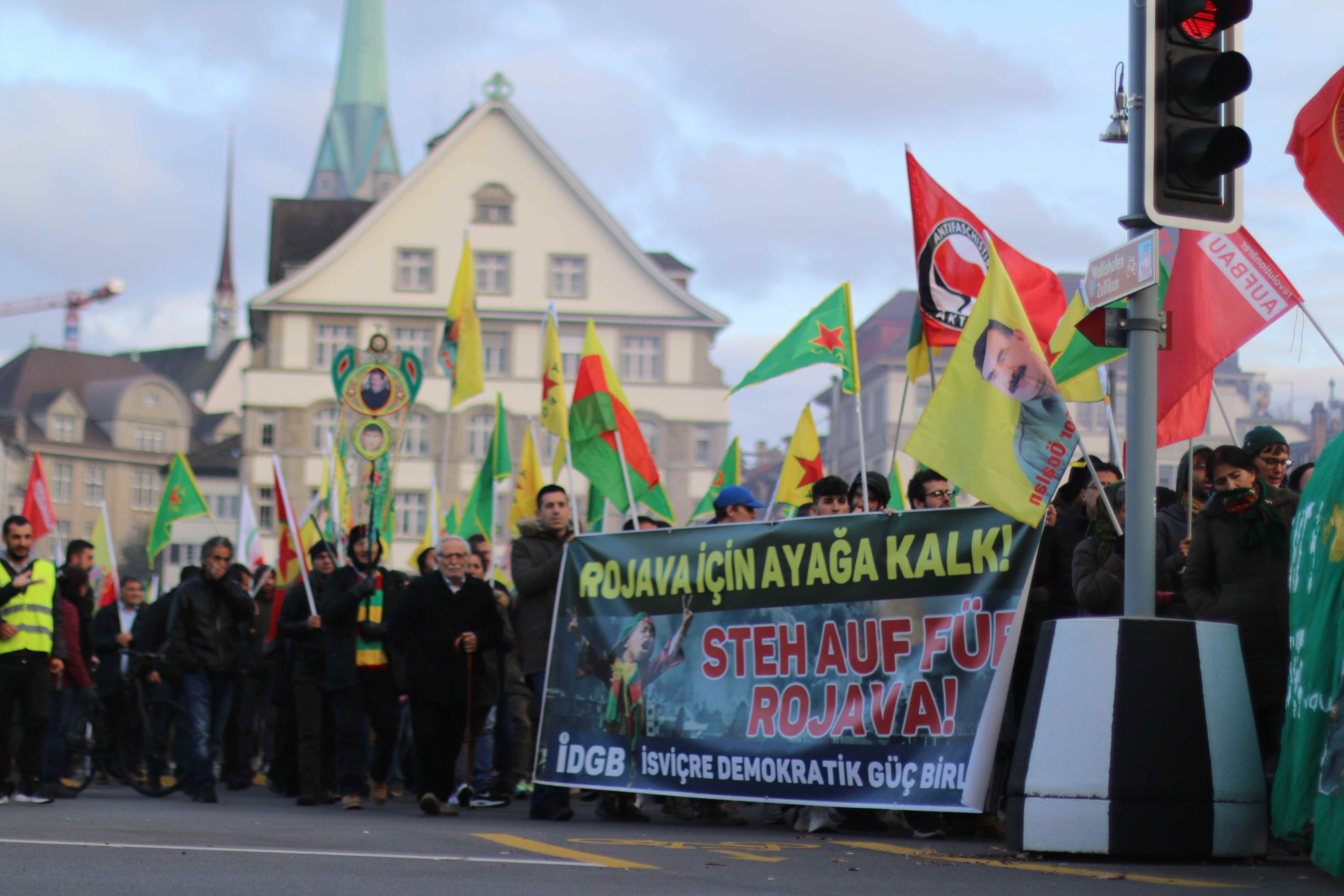 ZÜRİH – İnsanlık düşmanı Türk devletinin Rojava’ya dönük işgal ve soykırım saldırılarını protesto etmek, Onur Direnişi’nin sesini yükseltmek için TCŞ ve JCA’nın öncülüğünde bir eylem düzenlendi. Saat 14.30’da Zürih Rathausbrücke’de bir araya gelen binin üzerinde Kürdistanlı ve enternasyonalist, Onur Direnişi şehitleri anısına yapılan saygı duruşu ile yürüyüşe başladı. Üzerinde Almanca ve Kürtçe ‘İşgale İzin Verme!’ yazan pankart ile başlayan yürüyüşte, yüzlerce YPG-YPJ, TCŞ ve Halklar Önderi Abdullah Öcalan’ın bayrak ve posterleri taşındı.
